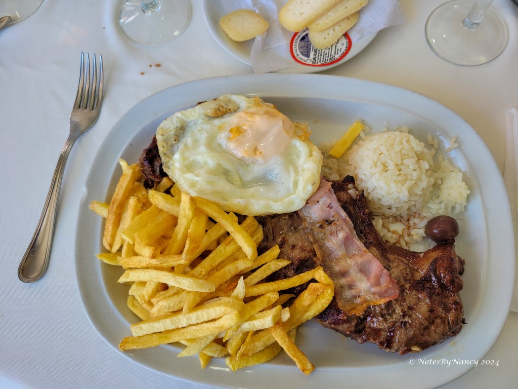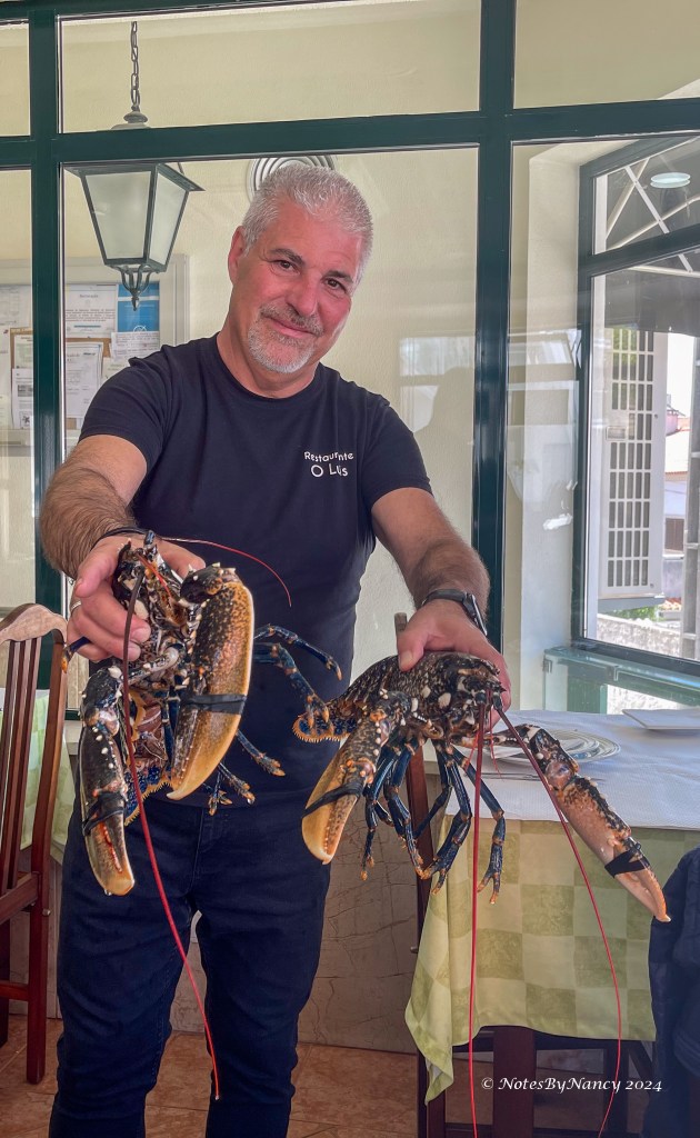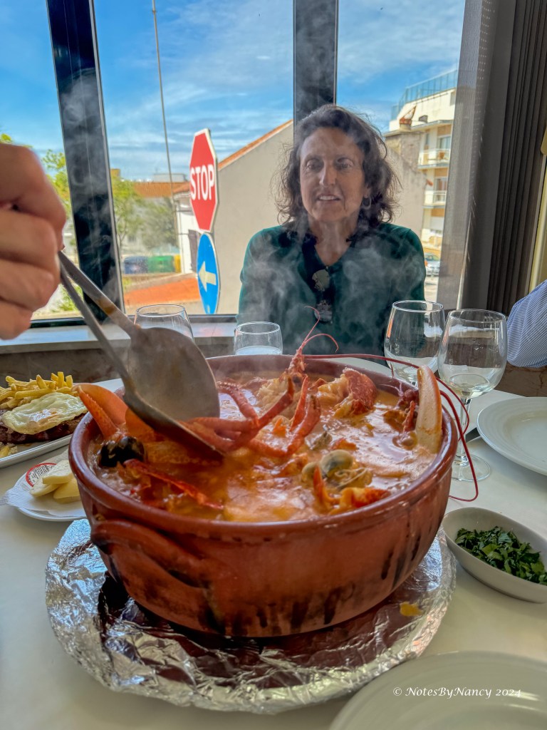 We went straight (okay, not straight, but rather directly) to Restaurant O Luís. Carla had called ahead, and they had stayed open after normal lunch hours for us. Again, having a professional guide with connections paid off! We pretty much had the restaurant to ourselves. Keith got a steak with a fried egg, French fries, and rice (the Portuguese eat a lot of rice and also potatoes), while the rest of us shared a huge pot of seafood rice, another traditional dish. It contained rice (obviously), with two fresh lobsters (shown in pics), mussels, shrimp, and probably some other things, too! It was, of course, delicious! They brought us a small bowl of peri-peri sauce, a spicy pepper condiment, to add if we wanted. It’s made from very hot peppers, but I think they brought us a mild version as it wasn’t as hot as I had expected. On the Scoville scale, it is supposed to rank between Cayenne and Habanero peppers.
