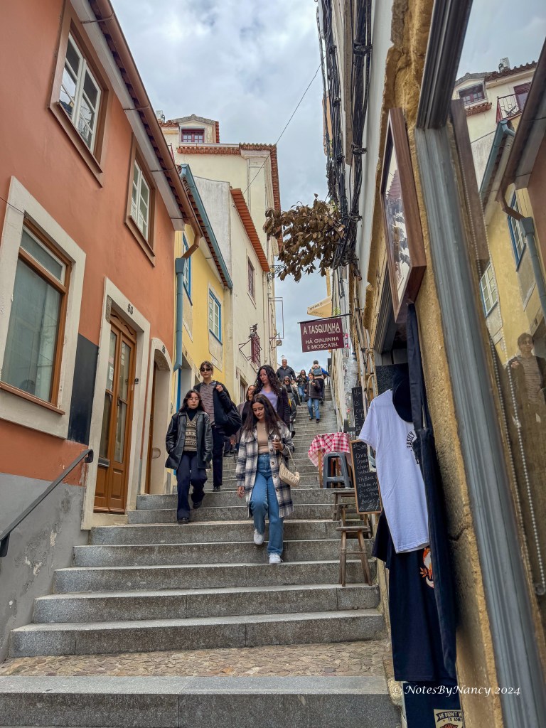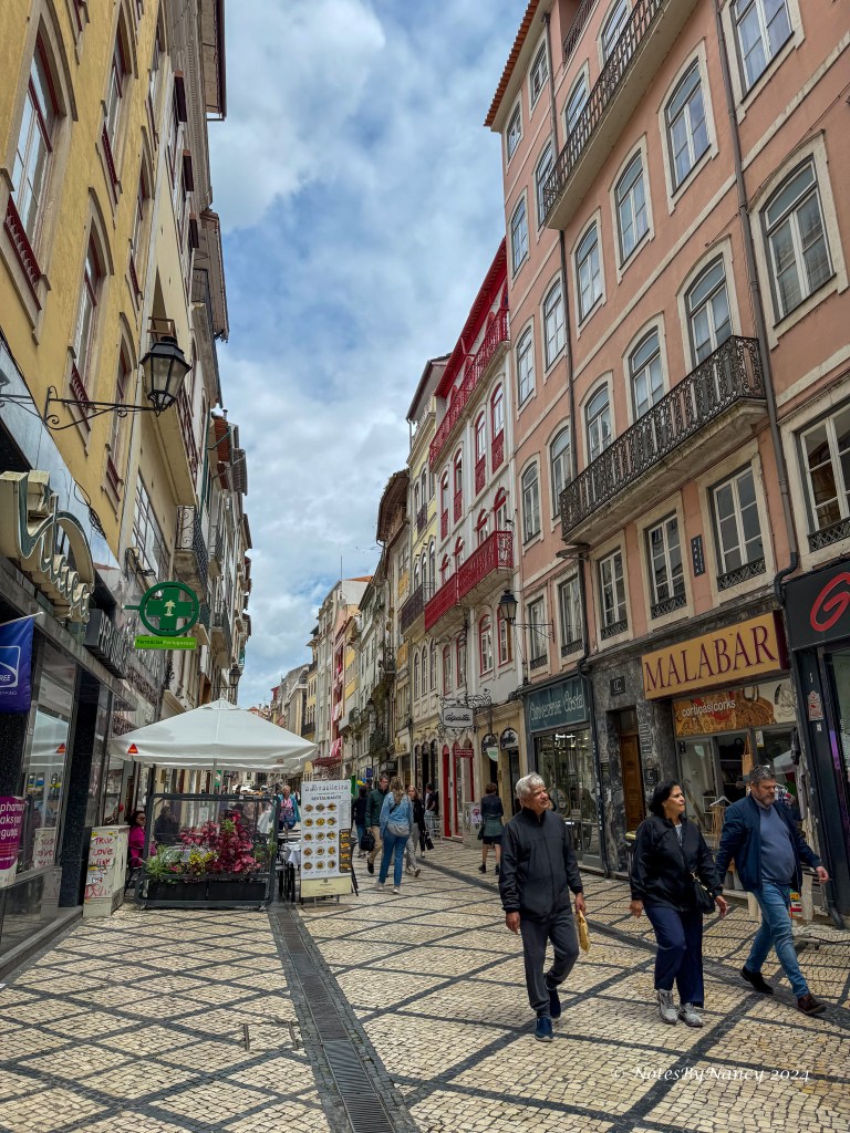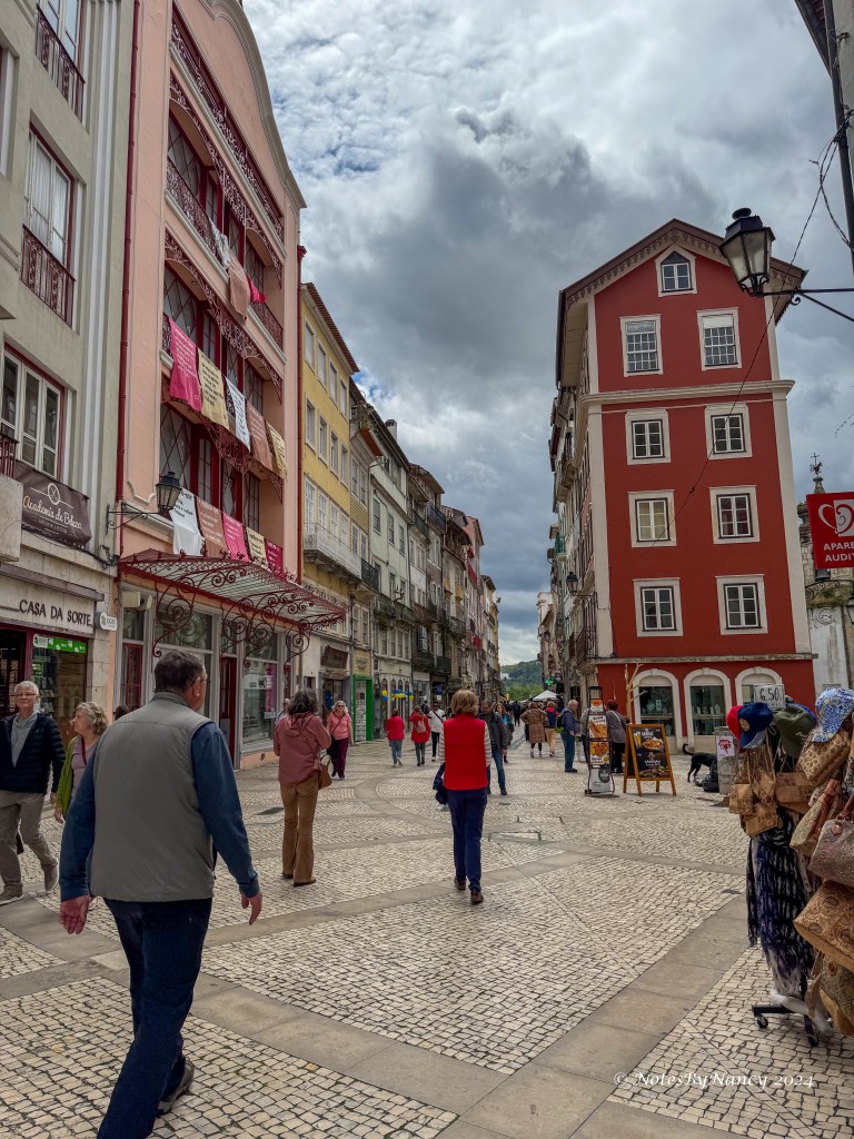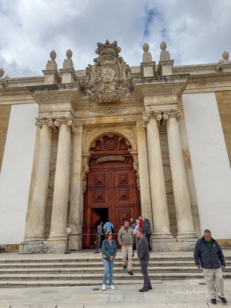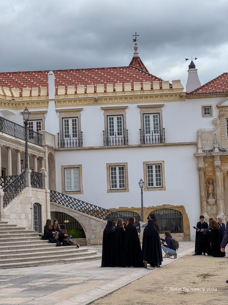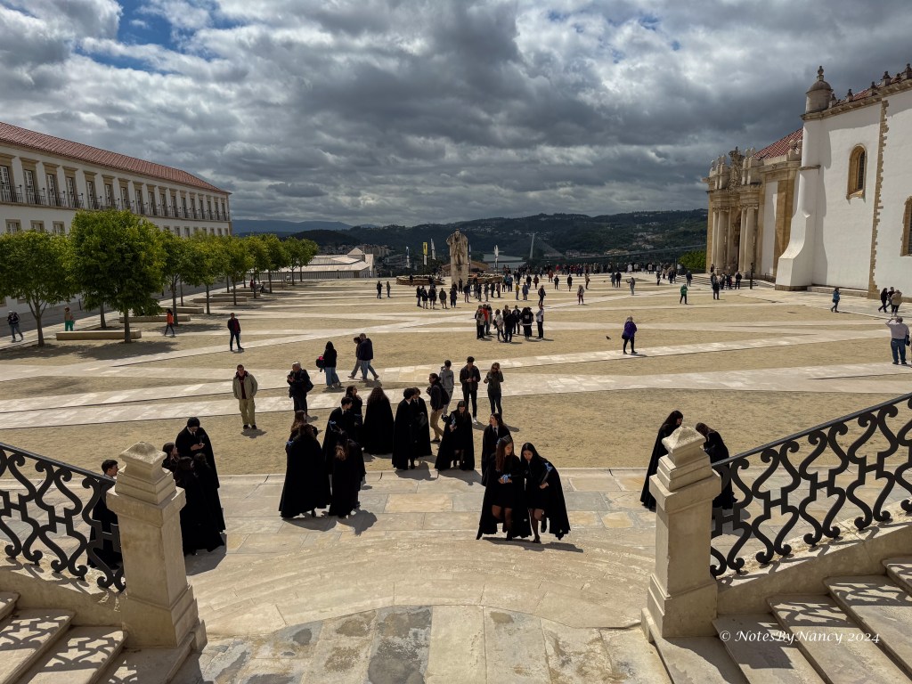 Remember the saying from Note 37? “Braga prays, Coimbra studies, Porto works, and Lisbon gets the money and parties”? Our first stop today was the University of Coimbra located about 75 miles (120km) or an hour and 15 minutes south of Porto. The university was originally founded in Lisbon in 1290 making it the oldest university in Portugal and one of the oldest in continuous operation in the world. It moved to Coimbra in 1308 and alternated with Lisbon until becoming the permanent site in 1537. It started in the Royal Palace, then spread throughout the city making Coimbra “University City” and thus “Coimbra studies”! In 2013, it was designated a UNESCO World Heritage Site. Today, there are over 28,000 students on multiple campuses. As we were there in early May, it was graduation time, and many seniors were gathered in the square taking pictures.