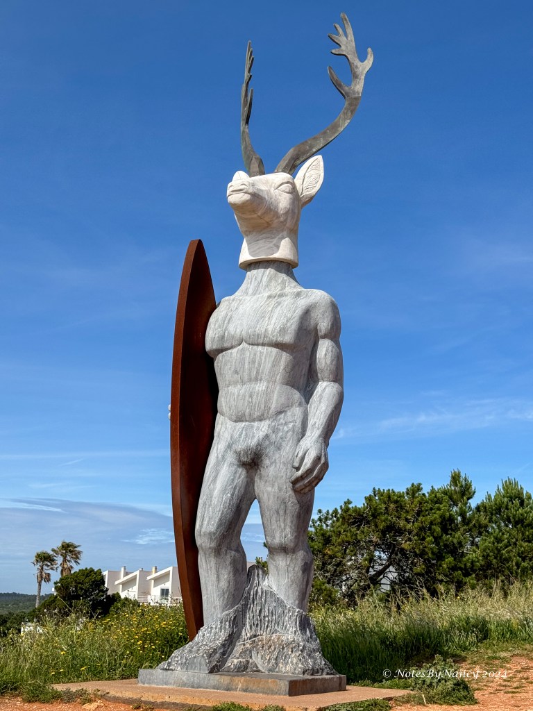 While we had a picture-perfect day to visit Nazaré’s North Beach, it was the wrong time of year for the giant waves. But that didn’t stop a small crowd of tourists from checking out the site with its historic lighthouse and fort (Forte de São Miguel Arcanjo) turned surfing museum. As you walk down the hill to the fort, you pass an interesting 21-foot-tall statue of a surfer with a deer’s head called Veado. It represents Nazaré’s past history as told in the Legend of Nazaré and its recent surfing history.