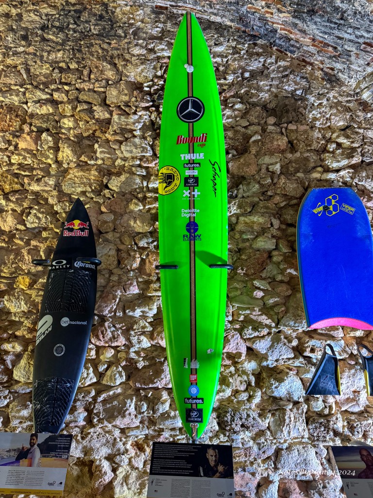Nazaré, once a small fishing village where the fisherman braved gigantic waves, has in recent years become well-known for its seaside resorts on the beach and the lure of those gigantic waves to surfers from all parts of the world. In November 2011, American Garrett McNamara became the first to achieve the feat riding a record-breaking 78-foot wave. That really put Nazaré on the map for surfers chasing the dream of riding 100-foot waves. The most recent, but currently unofficial, record was recorded this past February (2024) by German surfer Sebastian Steudtner on a 93.73-foot wave as measured by drone technology. The huge waves form typically from late October through February as a result of storm winds and the position and depth of the offshore Nazaré Canyon. The HBO documentary series 100 Foot Wave follows surfers in pursuit of the still elusive achievement.