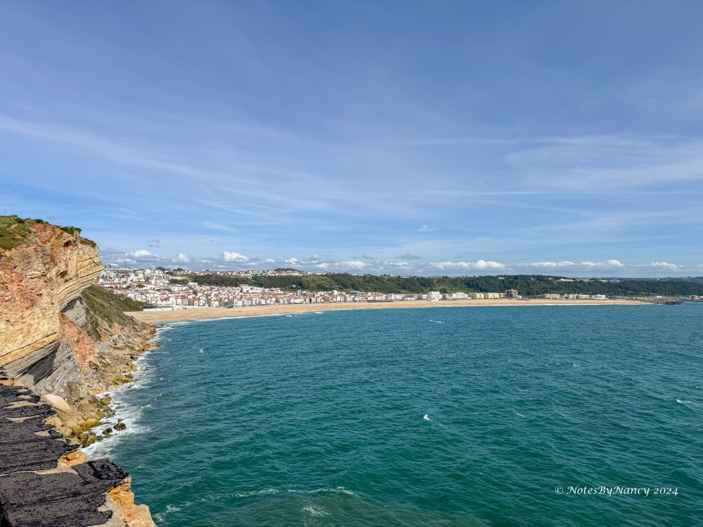 We climbed back up the hill to Miradouro do Suberco, the overlook to the main town of Nazaré and its beach, where we could see surfing lessons occurring in much more modest waves than those ridden by the professionals during the winter months near the North Beach.