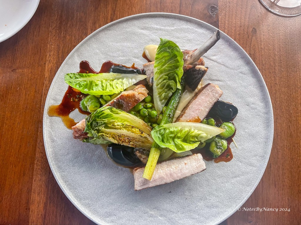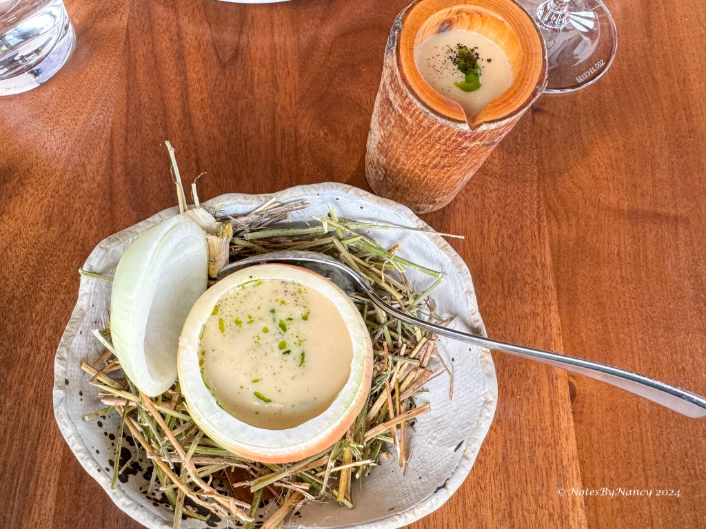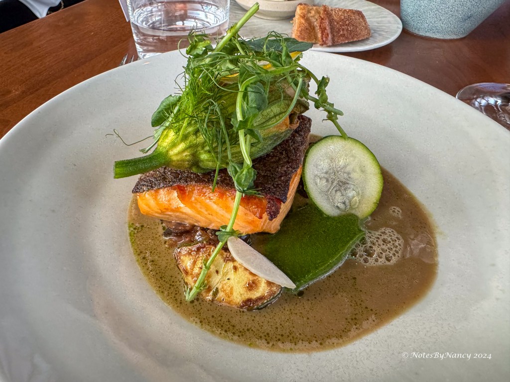 We selected a nice Malbec from the Mendoza region of Argentina (my go-to red wine). Then started with bread and salted butter along with the onion soup – served in an onion which came with a refill in a wooden vessel. It was unique! For mains, Dave had the “ontario pork chop” served with morel farci, roasted asparagus, black garlic, barbequed baby gem, and Madeira jus, he also added the pommes frites; I had the “salmon + spot prawn” served with zucchini flower, spot prawn bisque, spiced aubergine, basil purée, and shaved zucchini. For dessert, Dave had the “black forest gâteau” (preserved Ontario cherries, vanilla parfait, Chantilly, 70% dark chocolate) along with a Niepoort 20 year tawny port, while I had the “white chocolate cheesecake” (elderberry, lavender cracker, sablé Breton). After all, we only get one 20th anniversary! Unfortunately I forgot to take pictures of dessert!