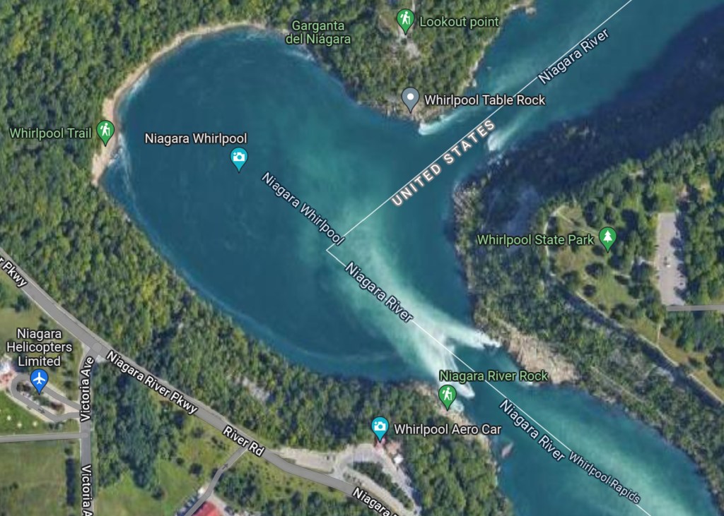 As you can see from the adjacent image, the border between the US and Canada is the middle of the river and creates a unique angle, such that the aerial tram from the Canadian side crosses the border twice to end up back in Canada on the opposite side – no passports required!