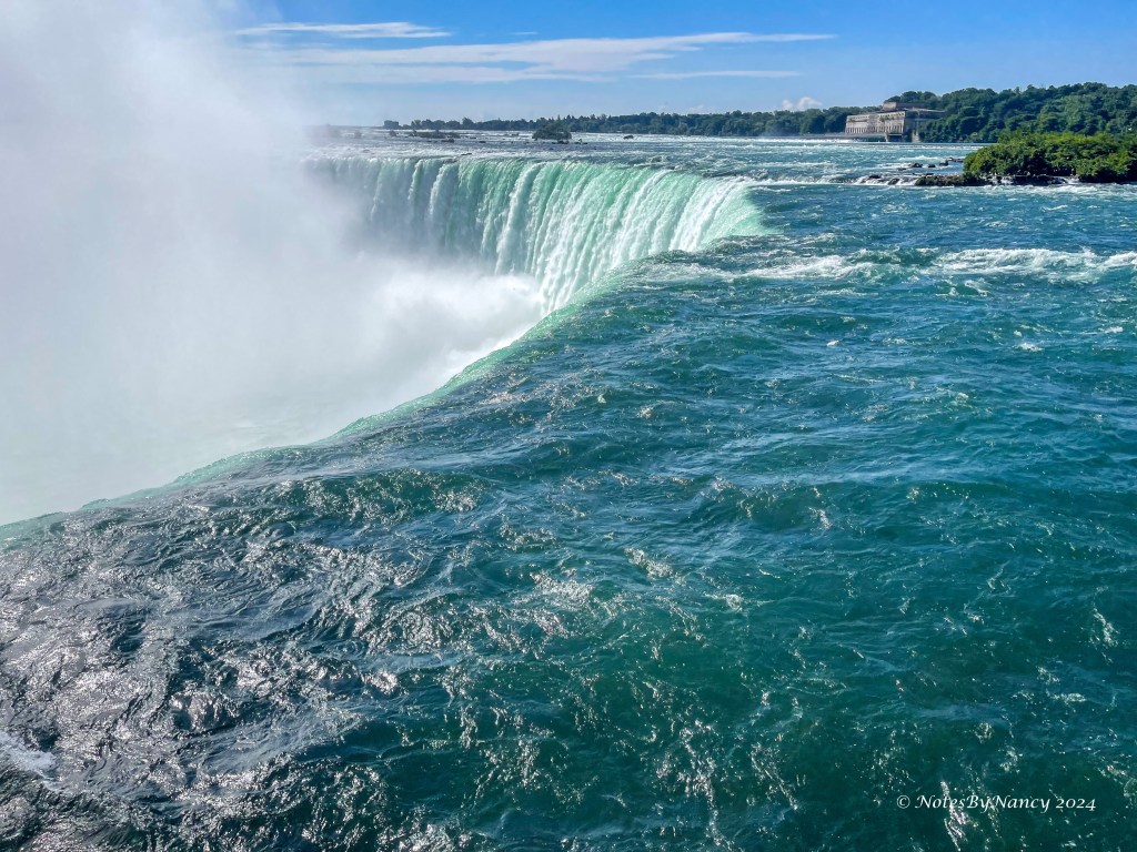 Horseshoe Falls are approximately 188 feet tall with a crest line over 2200 feet wide. Its plunge pool is approximately 100 feet deep. While far from the tallest or widest waterfall in the world, it has impressive power with over 681,750 gallons per second flowing over it – that’s enough water to fill an Olympic-size swimming pool (660,000 gallons) in less than a second! The International Control Dam (1954) above the falls is governed by a treaty specifying how much water has to flow over in the the daytime tourist season versus at night and winter. We joked about finding the valve to turn the water on/off when we were in the tunnel behind the falls, but the dam really can cut the flow in half!
