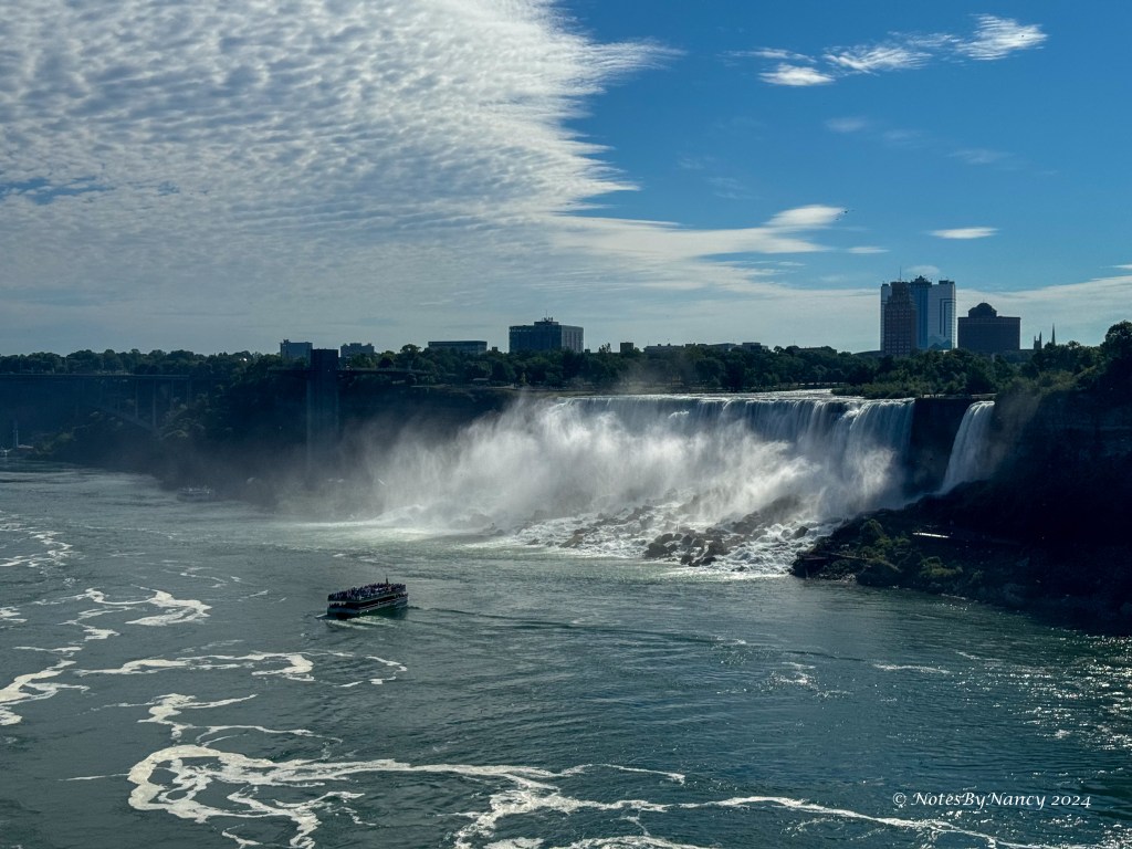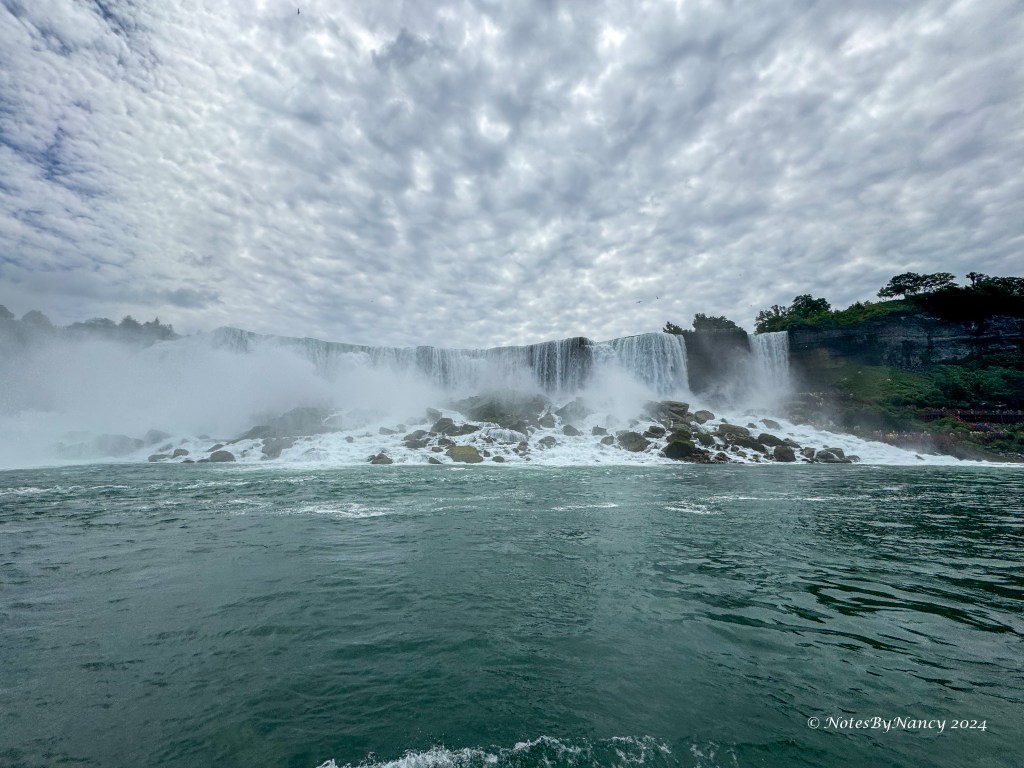 American and Bridal Veil Falls aren’t nearly as loud, but still impressive. You can see the American side observation tower and the poncho-clad visitors on the American side along with all the rocks piled at the base of this set of falls. Those rocks are the reason the daredevils don’t attempt going over these falls, choosing Horseshoe Falls with its deep plunge pool instead.