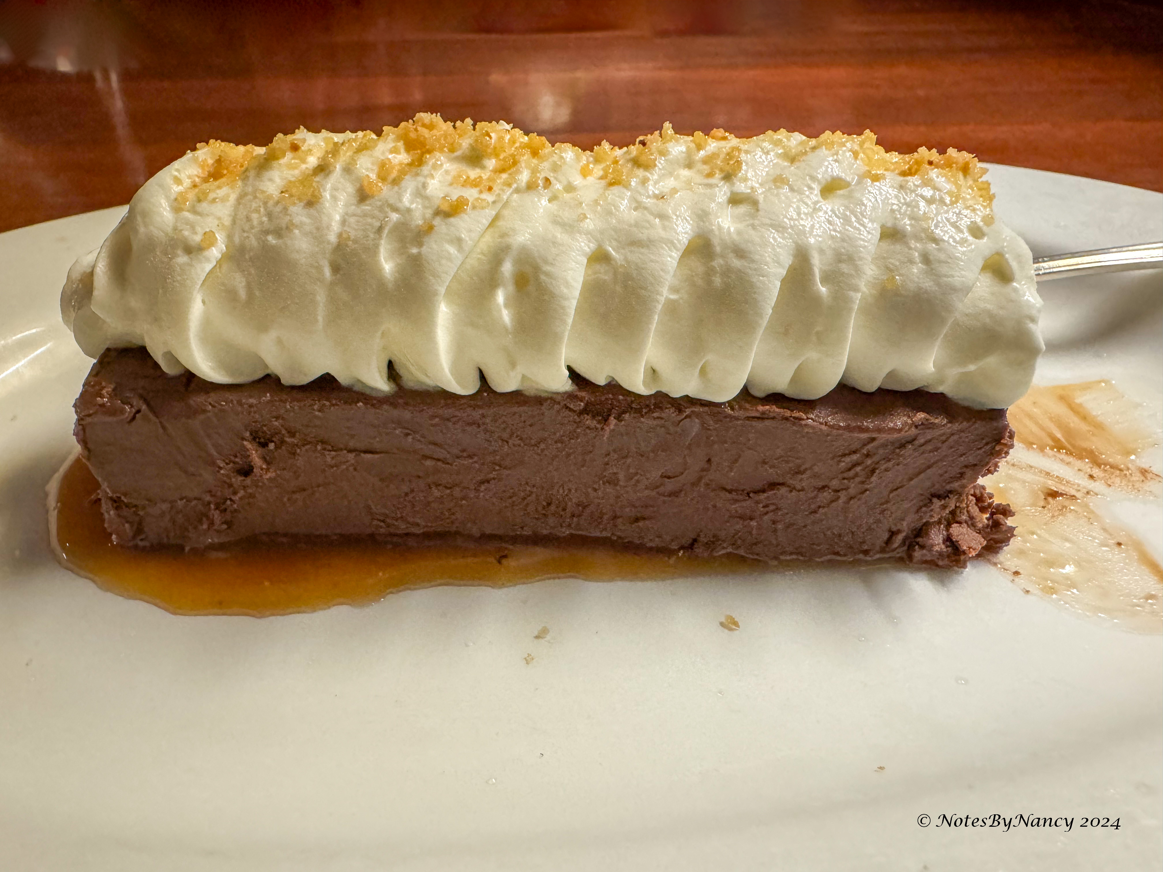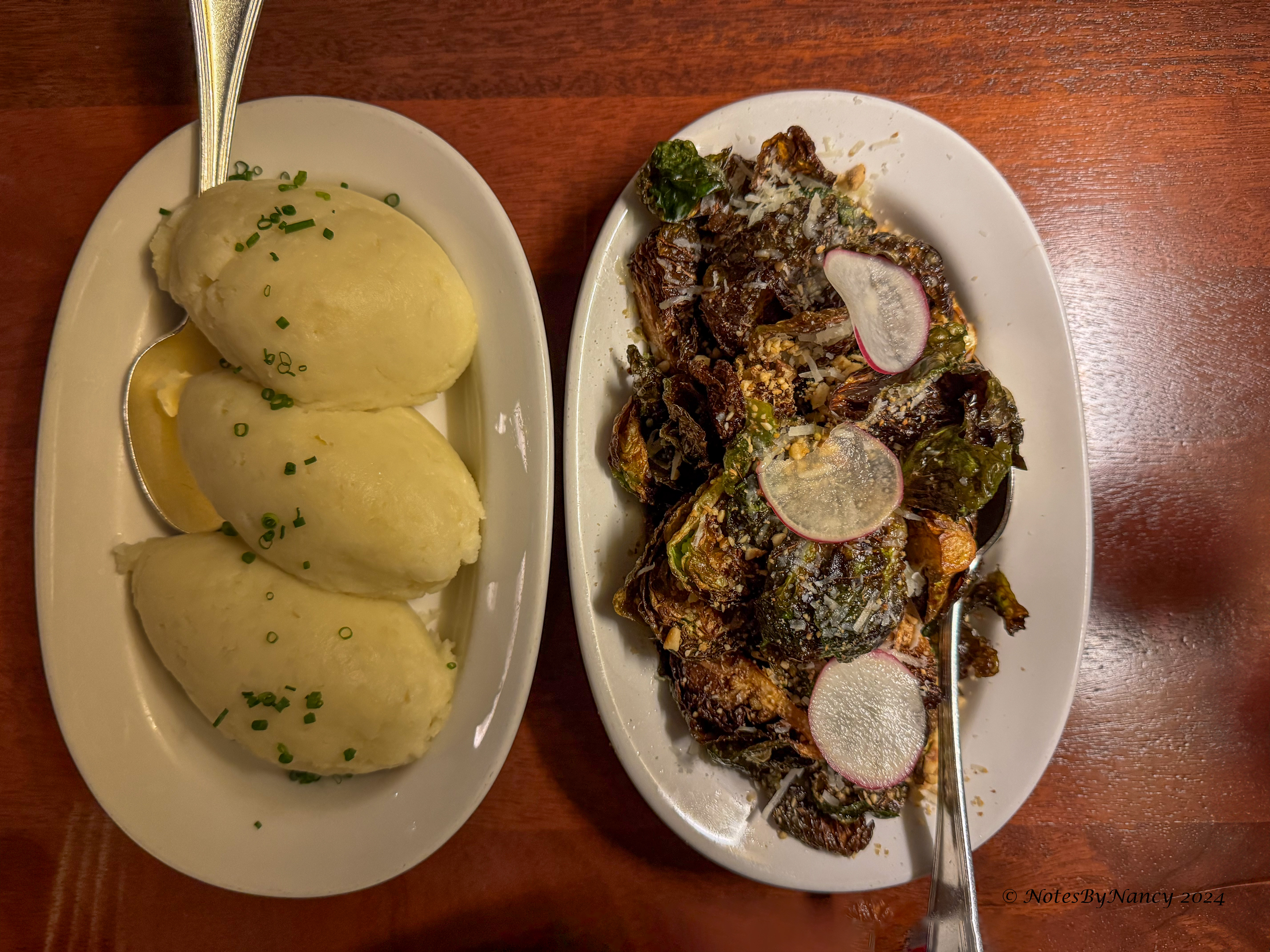 Ryan was our server, and he was great! We found a reasonably priced Mendoza Malbec on the wine list. Then for our starters I had the crab cake and Dave had the lobster bisque. For mains, Dave got the bone-in ribeye steak with mashed potatoes, and I ordered the sauteed prawns and scallops with the Brussels bowl. The heading above the sides on the menu is “For the Table” and they could have served a table of four! Too bad we didn’t have anyone to share with! For dessert, we shared the Chocolate Truffle Cake. It was more like a combination between a mousse and fudge – yum!