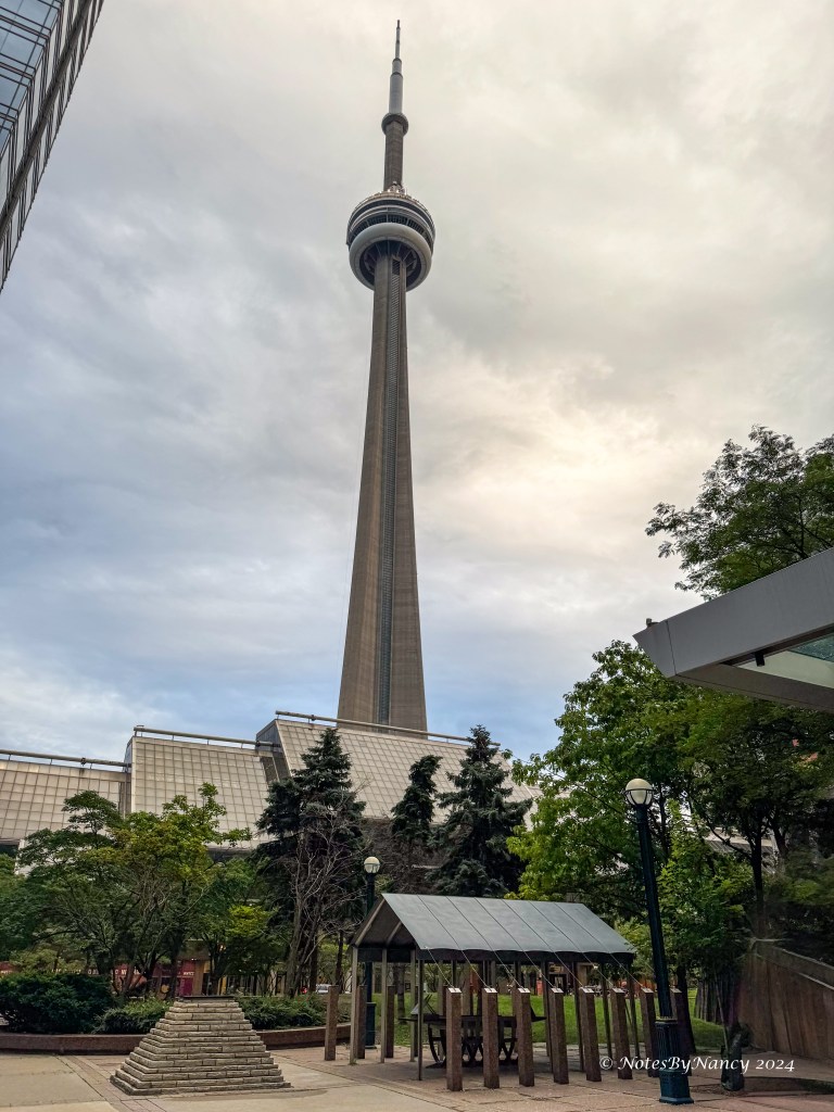 The new city hall complex is quite a contrast, but trees blocked getting a good picture of it as we passed by on Queen Street. Turning south along St. John Street we entered the Entertainment District with the historic Princess of Wales Theatre and many other venues. The bus then turned east on Front Street, and we got off at stop 10 for the CN Tower South. From there it’s a short walk across a pedestrian bridge over all the railroad tracks to the plaza for CN Tower, Rogers Centre, and our hotel.
