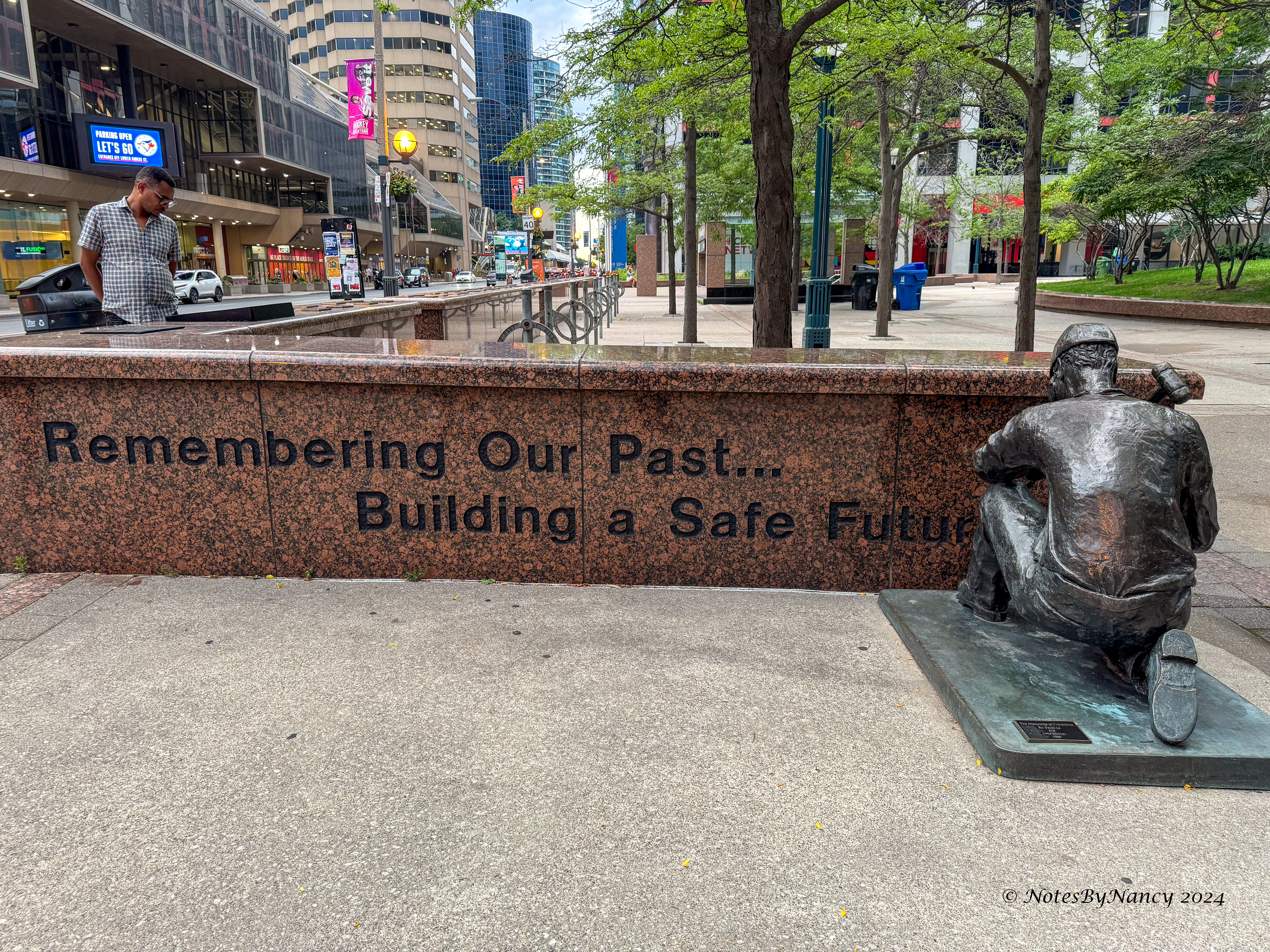 Then we discovered an interesting memorial, the WISB Simcoe Park Workers Monument, dedicated to workers killed in workplace accidents. It was a series of plaques along a low granite wall with the worker’s name, year of death, and type of accident. There are 100 plaques – one for each year from 1901-1999, and one blank plaque for the accident that hasn’t yet happened.