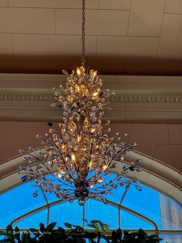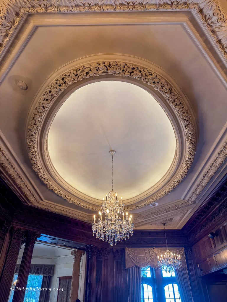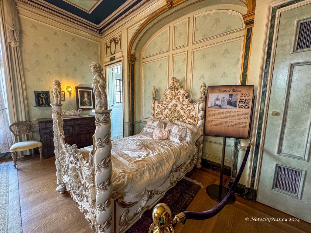 On the second floor are Sir Pellatt’s and Lady Pellatt’s suites, along with the Windsor Room, designed to host any royalty that visited, another guest room, and the Round Room below one of the towers. We were privileged to find Sir Henry and Lady Mary in their suites when we visited! Lady Mary also had a fondness for Meissen porcelain – as seen in the chandeliers in her suite.