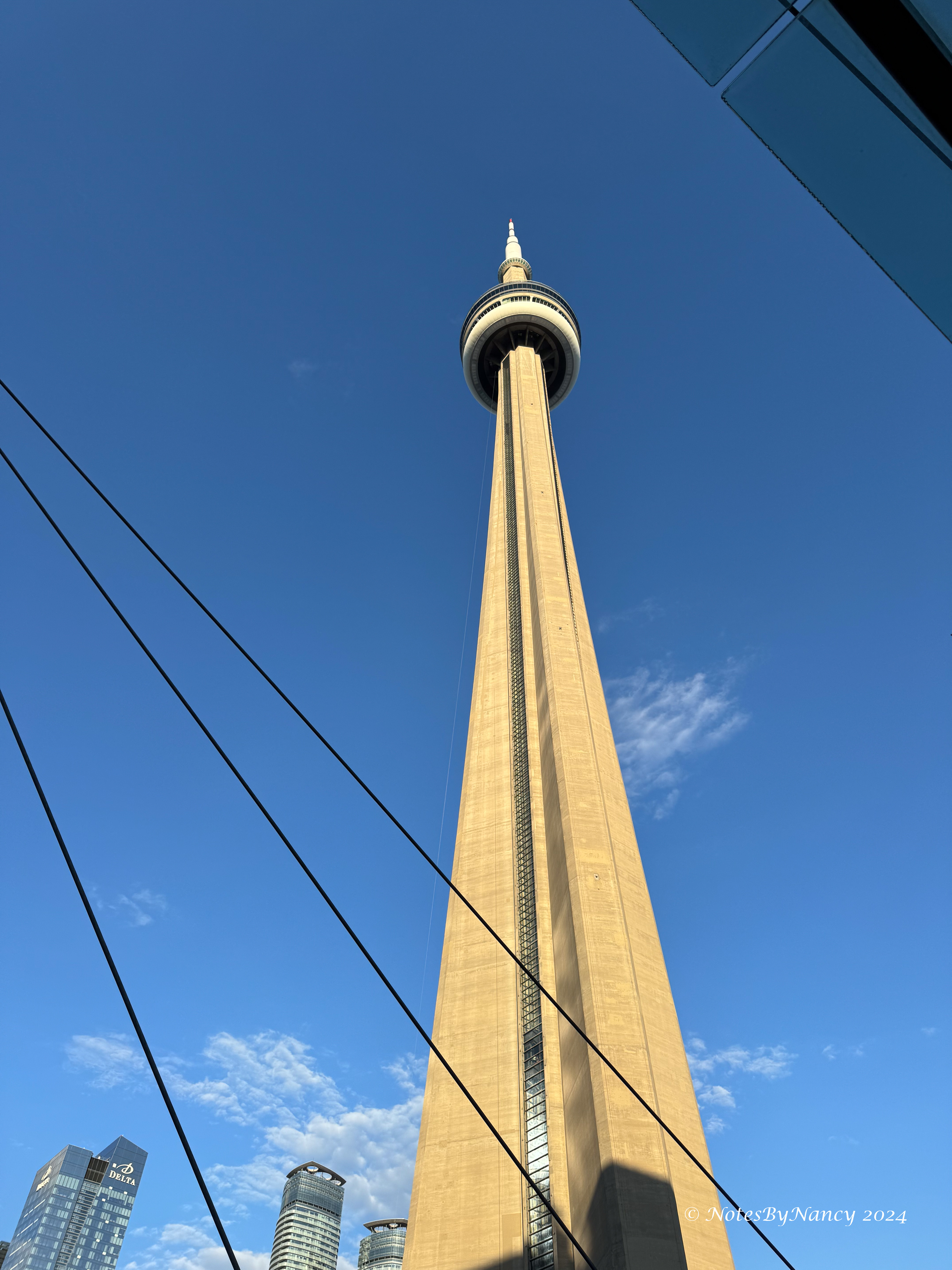 Afterward, on a pleasant walk back the hotel as the sun was setting, I got this picture of The Audience Part 1 sculpture by Michael Snow on the Rogers Centre façade and one more picture of CN Tower.