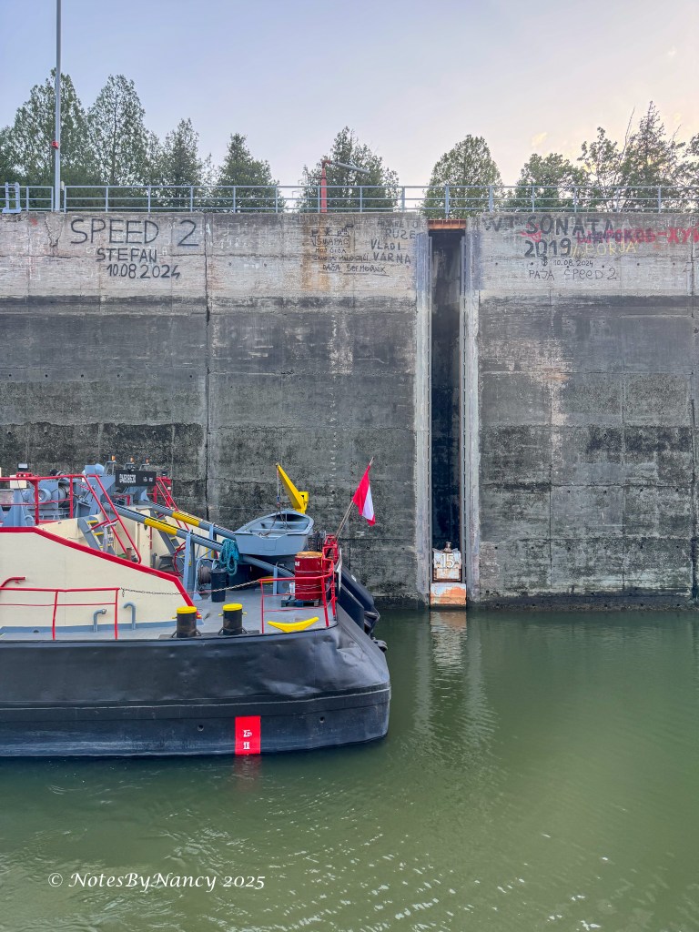 Early in the morning we arrived at the largest dam on the Danube, the Iron Gate Hydroelectric Plant I completed in 1972 as a joint project between Yugoslavia and Romania. It was a double-lock, meaning we entered one lock and were raised then entered a second lock to be lifted again before continuing our way through the gorges in the Carpathian and Balkan Mountains following the now placid Danube along the border between what is now Serbia and Romania. The creation of the dam resulted in tens of thousands of people being evacuated and relocated. Although entire villages are now under water, this dam enabled commerce to navigate safely between the North Sea to the Black Sea.