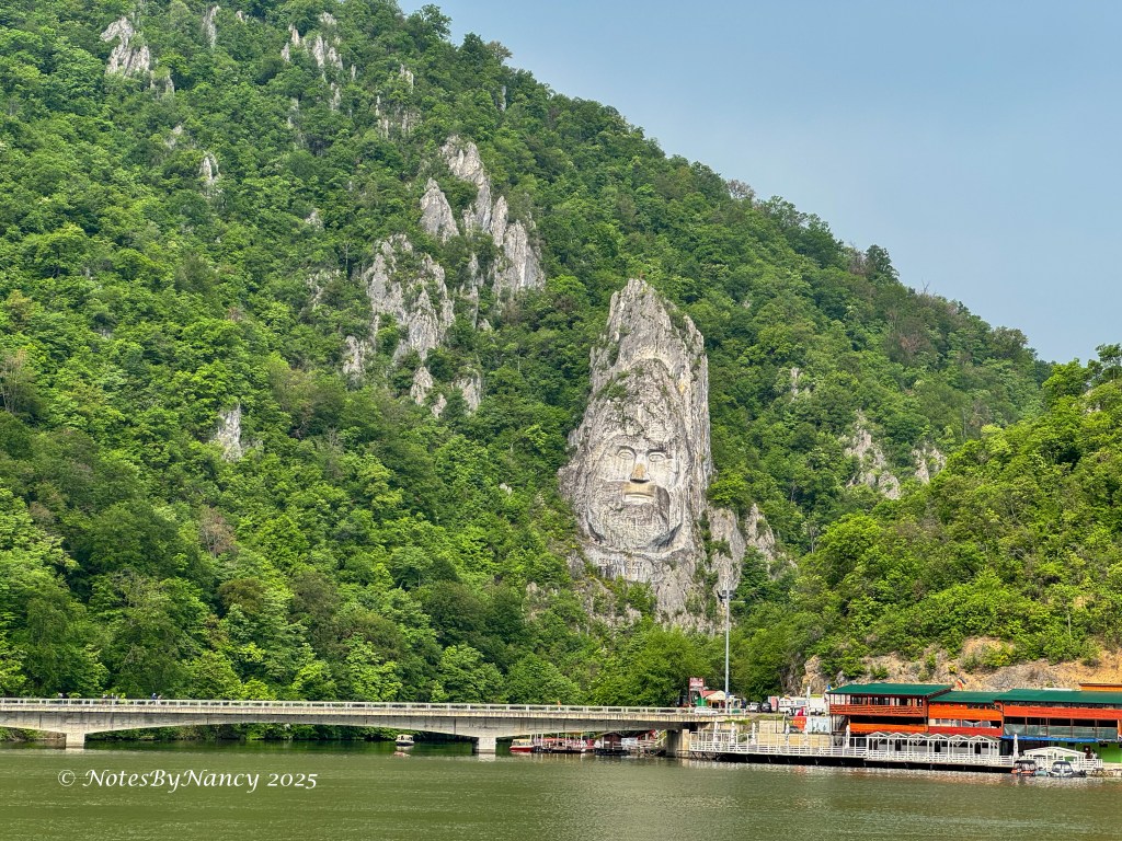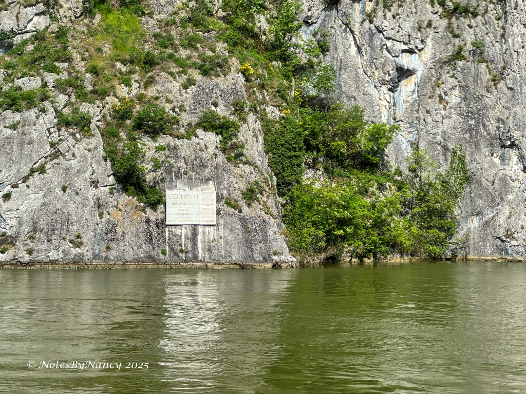 Shortly after leaving the locks, our program director, Sonya, began a commentary over the speakers in the lounge and sun deck about the region and the sites that we passed such as Trajan’s Plaque honoring the Roman road built here by Emperor Trajan in the 2nd century and the rock statue of Decebalus the Dacian king who fought the Romans. I also spotted a “new” plaque dedicated in 2017 to Count István Széchenyi (aka “the greatest Hungarian” 1791-1860) who helped make this section of the Danube navigable as the original plaque from 1885 is now under water due to the dam construction.