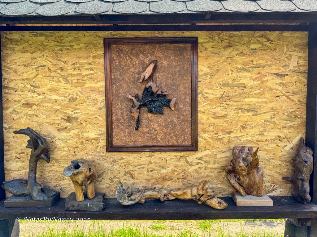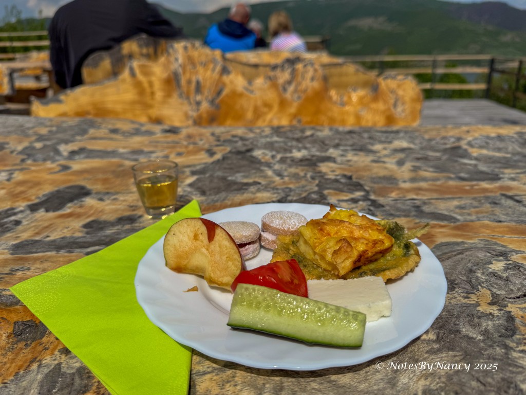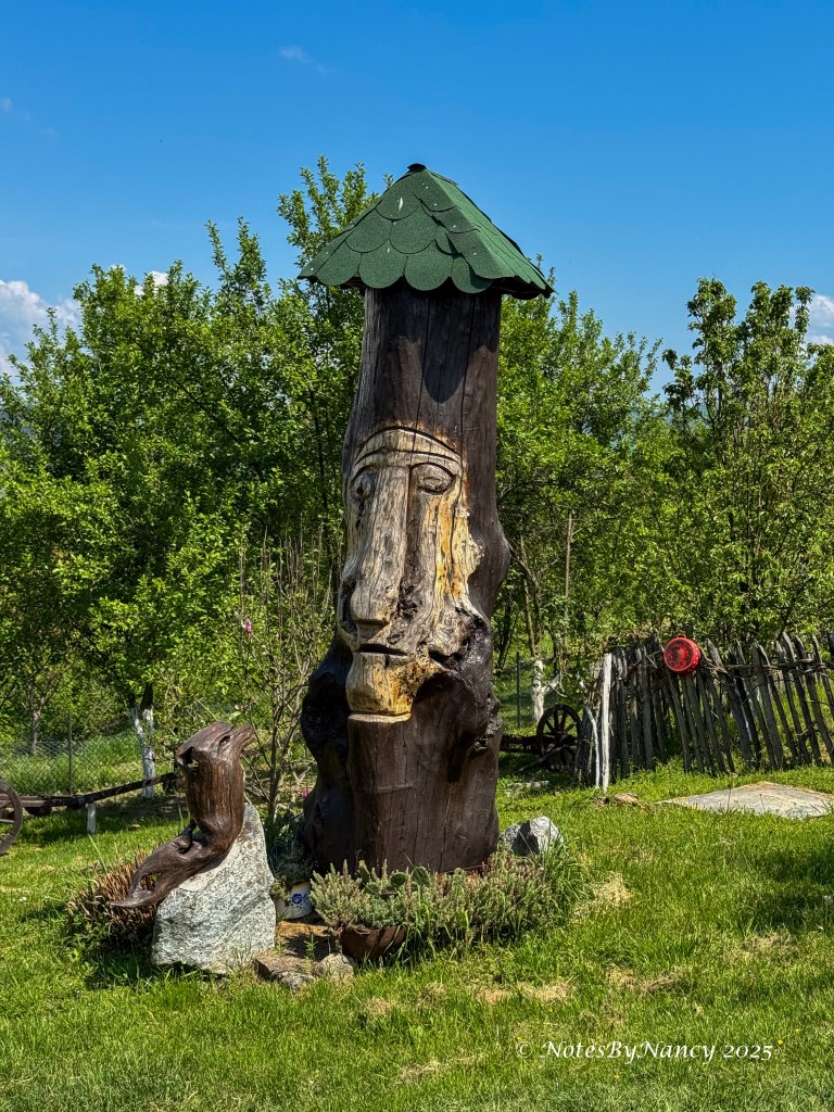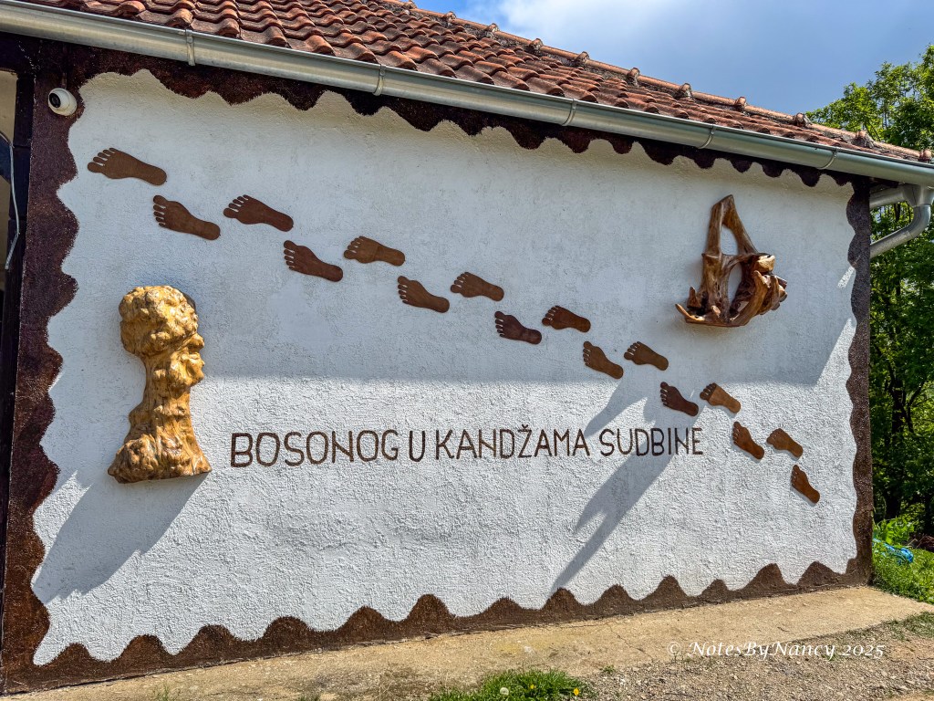 Within a very few minutes we arrived at the “art gallery” to admire the wood carvings (not for sale!) and sample the local Serbian delicacies and more mentioned above. The fried nettle was quite good, but then we come from Texas where fried butter is actually served at the State Fair! The honey brandy was an interesting combination of sweet and strong liquor. I only managed a couple of very small sips to say that I had tried it!