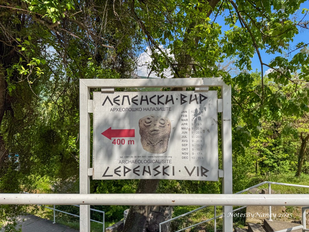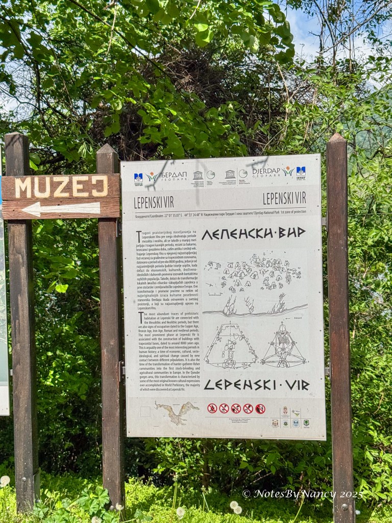 The included tour today is Golubac Fortress by Foot (1 hour, moderate, afternoon) as the Ullur docks literally adjacent to the fortress, but not until late in the afternoon. Two optional excursions were also available – Hike to Vistas of the Iron Gate (4 hours, demanding, afternoon) and Lepenski Vir (4 hours, moderate, afternoon). We signed up for the excursion to Lepenski Vir which concluded with a tour of Golubac Fortress. Lepenski Vir is a prehistoric site discovered in 1960. Over the course of the next decade the importance of the site during further excavations was recognized and when it was determined that the site would be flooded by the construction of the Iron Gate Hydroelectric Power Station, the entire site was relocated to its present location in 1971 and put under cover.
