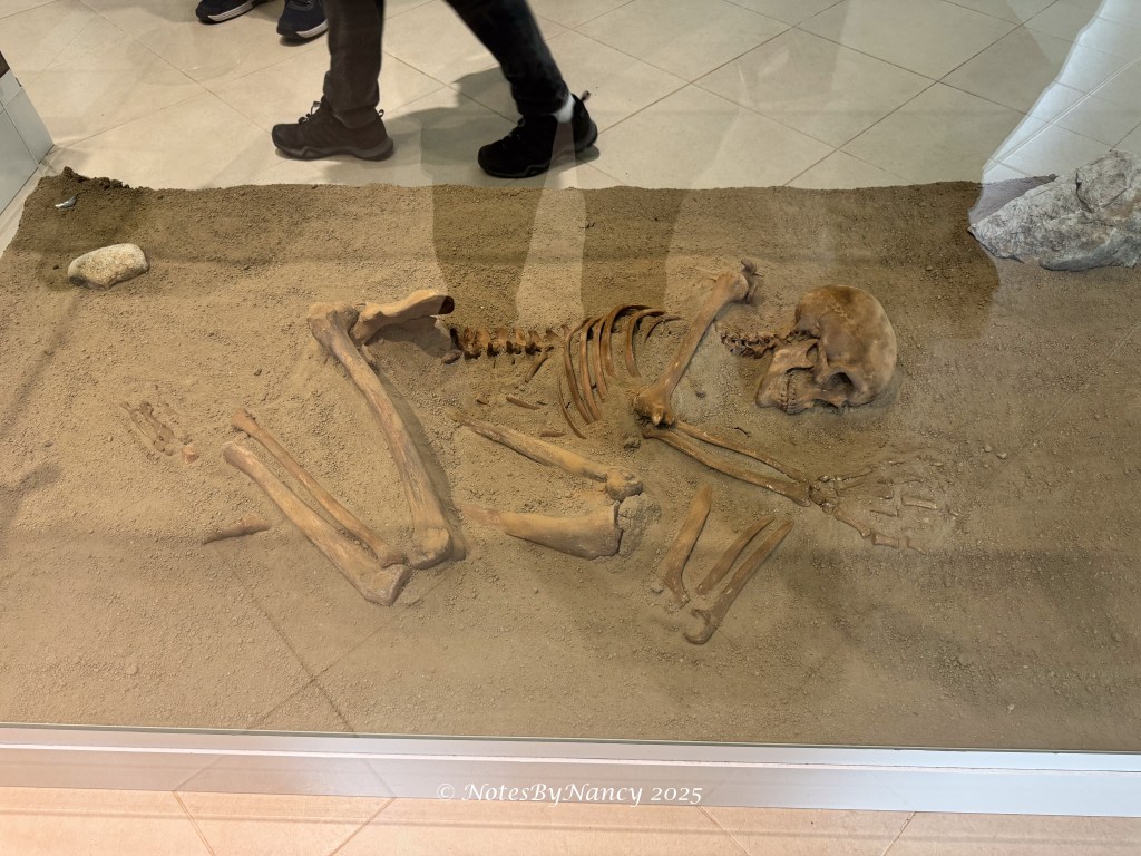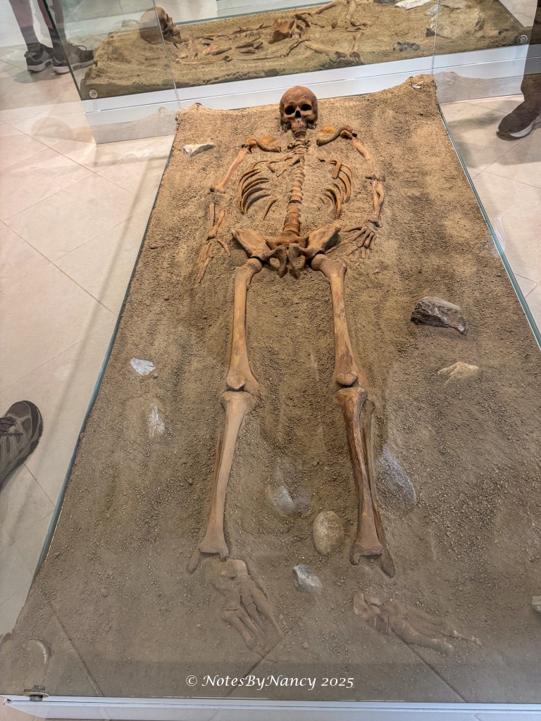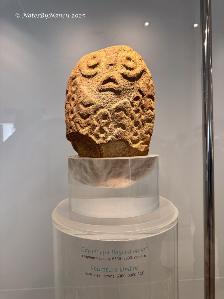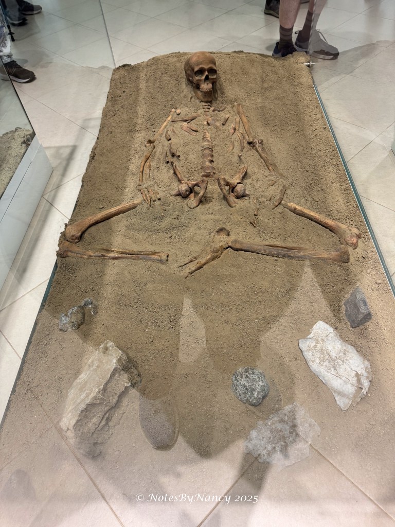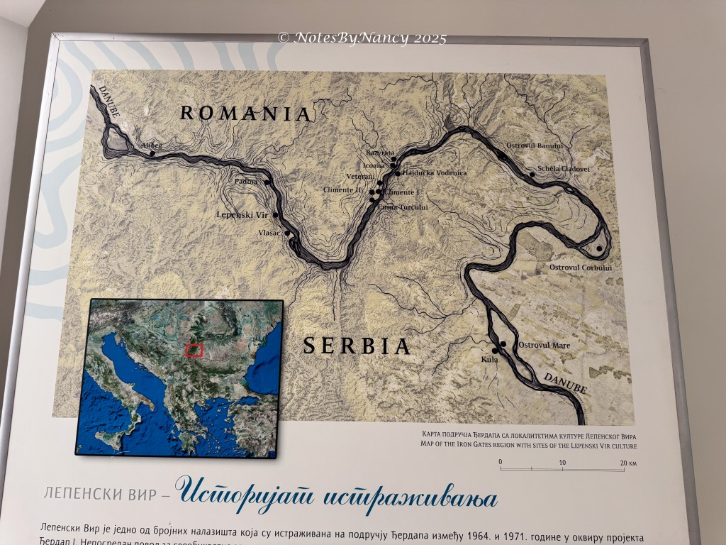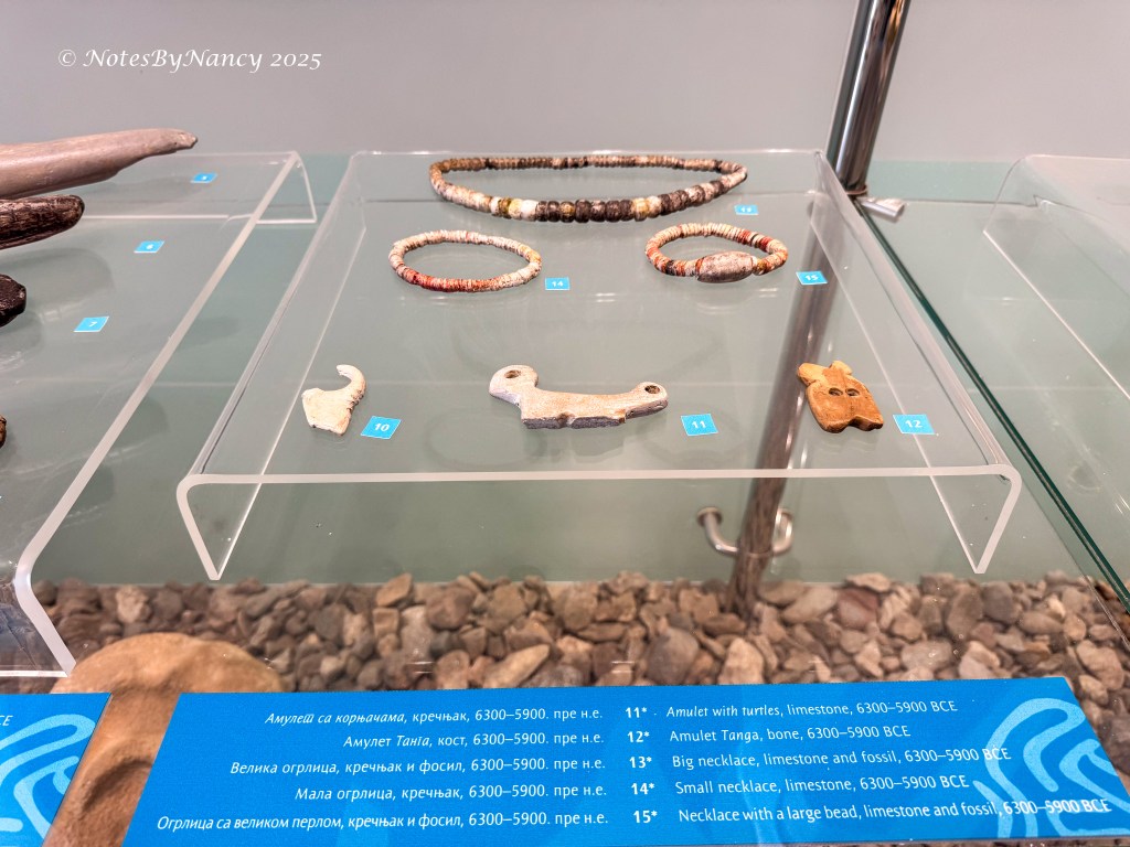 There is a 16-minute documentary video made during the time of the original excavations and discoveries (with English subtitles) that was very enlightening. The base of each home is in the same shape as the mountain across the river from the village. And regardless of size of the individual house, its measurement creates 1/6 of a circle like a slice of pie. This design was found in layers from the Mesolithic to the Neolithic periods – more than 4000 years. The flooring was designed around a fire pit and was made of clay with iron and water which hardened like cement and conducted heat from the fire pit – the first heated flooring in Europe! Whatever materials made up the walls and roof are not known and can only be speculated as to the design. It is thought that the inhabitants probably only used the structures for sleeping as they would be working outside all day. Of the 330 skeletal remains found, all were determined to have died from natural causes – which is amazing. They also determined that this “tribe” lived as much as 50%-100% longer than the average for that time frame and were taller than others – when the average male was 5’ 5”, these people were 5’ 8” to over 6’ tall. This was thought to be due to their diet of sturgeon which existed in the river until the dam was built (unfortunately they didn’t think to put in fish ladders). That they admired and perhaps even worshiped the sturgeon can be seen in the artifacts and sculptures found at the site.