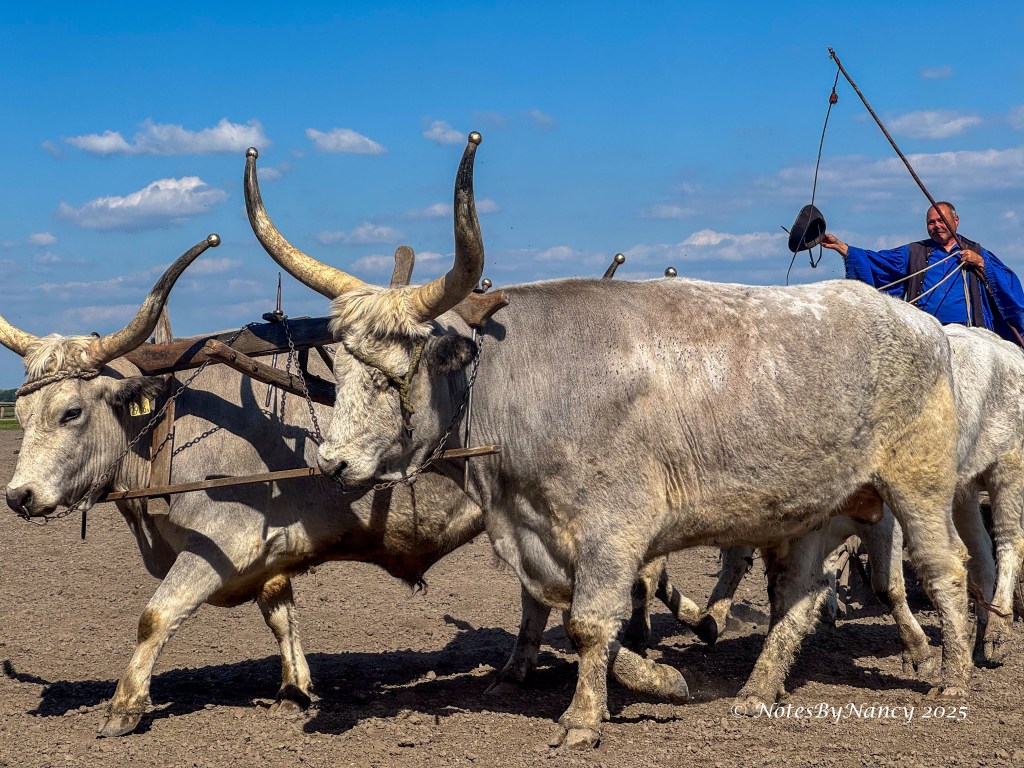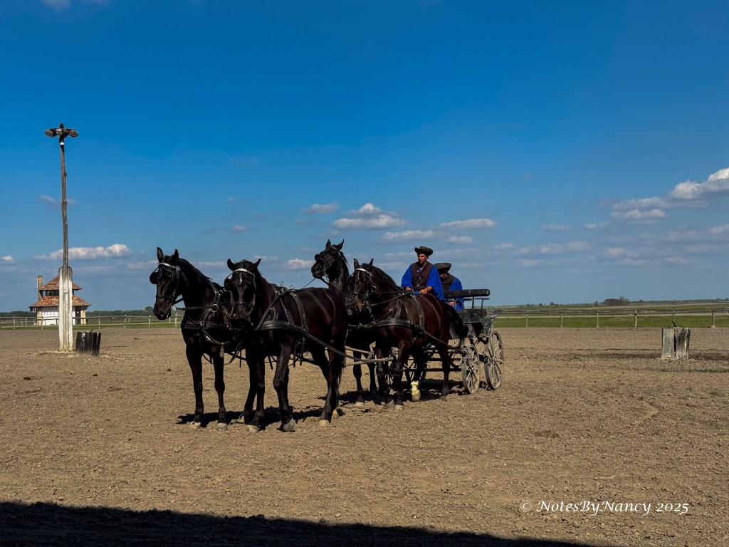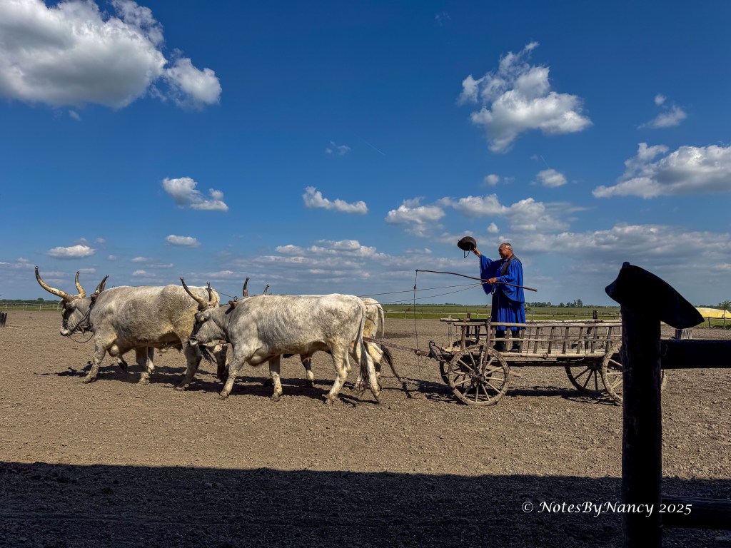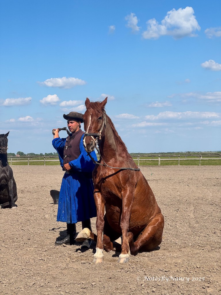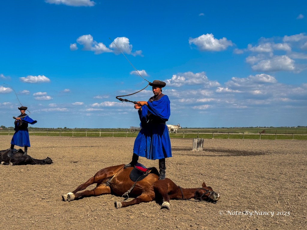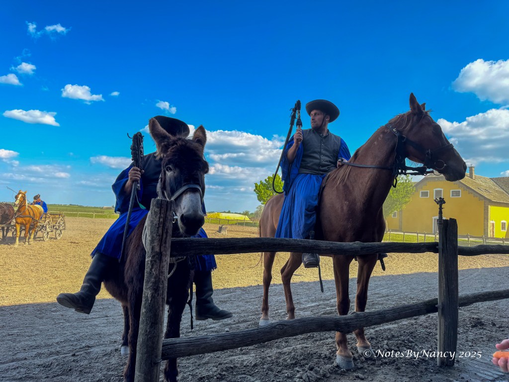 Tables were set up with drinks and snacks for everyone to sample, then we continued to the arena’s seating area for the show. And what a show it was! The “puszta” is the grassland of the Great Hungarian Plains. The horse-mounted herdsmen of these plains are called “csikós” and pre-date the American cowboy. They are known for their whip-cracking skills as they herded great grey cattle, sheep, and horses. The horse breed they ride is the Nonius. The show included a donkey and rider who played the role of comic relief.