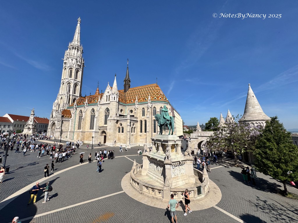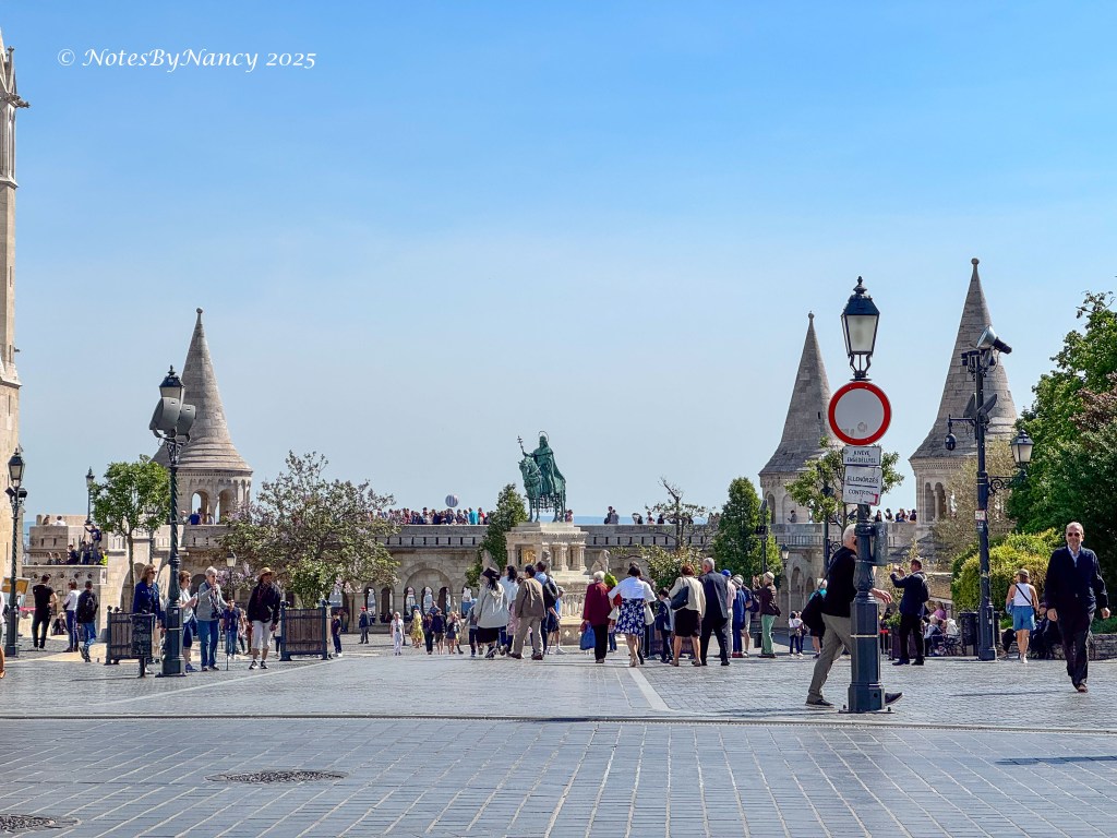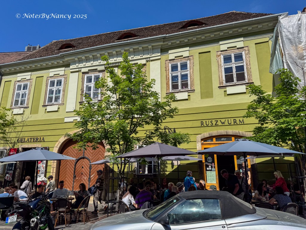 The oldest structures are here on the Buda side as most of the Pest side was destroyed in a flood in 1838. The buses let us off at a drop zone, then our guide Rebecca took us through the area to the Fisherman’s Bastion where she provided historical background, then established the time everyone needed to be back at the drop-off/pick-up zone. After we took a few pictures, we headed to find a café to relax until time to return to the bus. Rebecca had pointed out a confectionary where she recommended trying the Dobos Torte specialty, so we decided to give it a try.