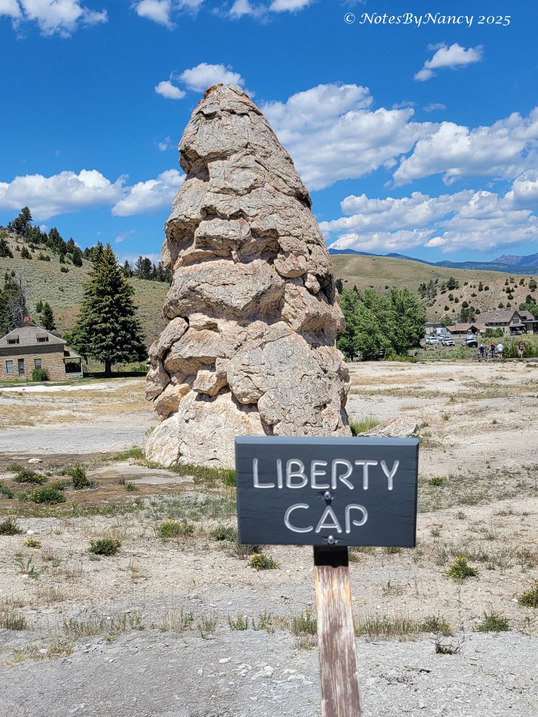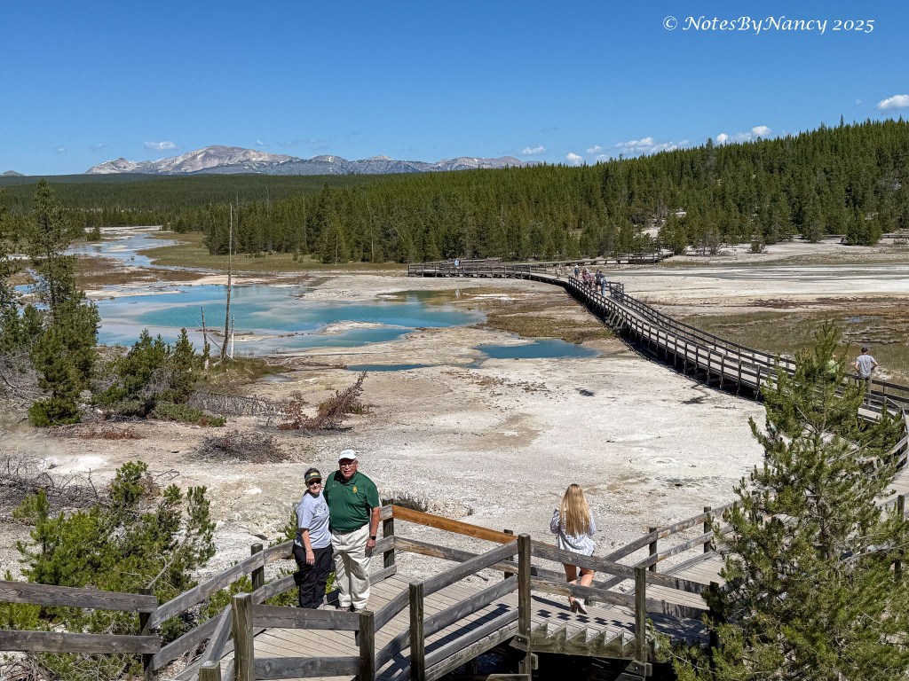 After eating, Paula and I walked to the area’s thermal feature, the Mammoth Terraces, while the guys brought the car from where we’d parked near the hotel to a parking lot by the Lower Terraces. Luckily, someone pulled out as they pulled into the lot.