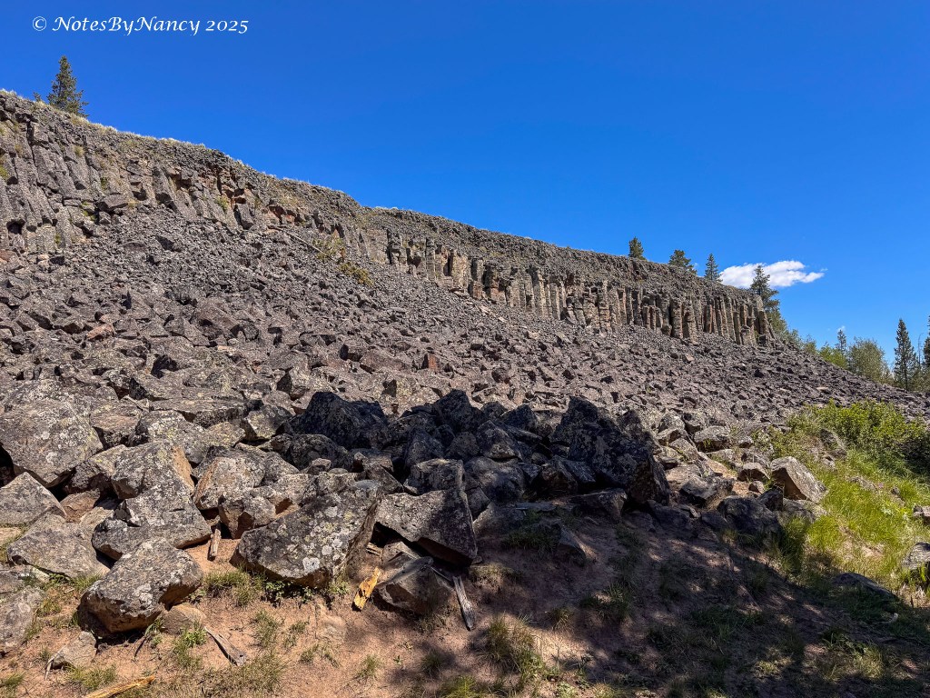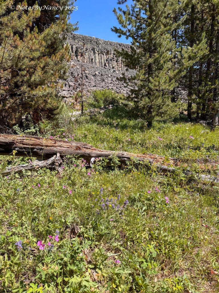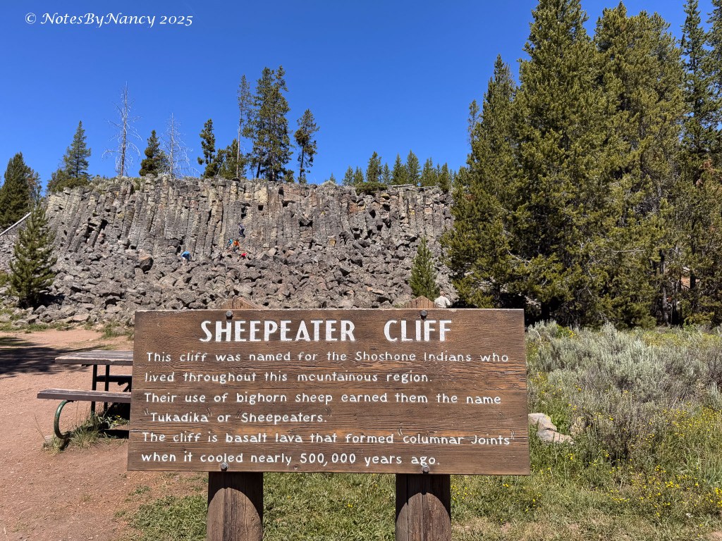 After our walk in Norris, we continued north to our next stop almost 14 miles away – Sheepeater Cliff. You have to turn off the main road and drive maybe a half-mile to the parking lot and picnic area. The name comes from the Tukudika, or Sheep Eaters—a band of Eastern Shoshone Indians. This feature near the Gardner River is a cliff made of columnar basalt, the remains of lava flows from 500,000 years ago. In addition to the part of the cliff easily seen from the picnic area, there is a nice little trail that leads along the river to see more of it.