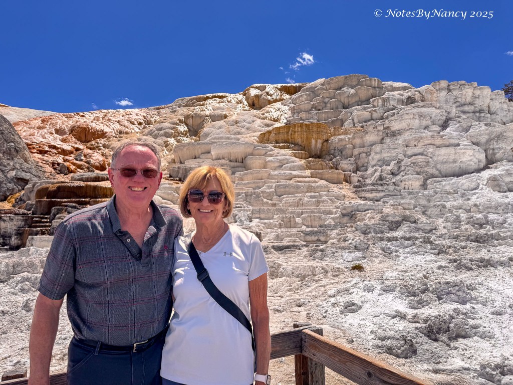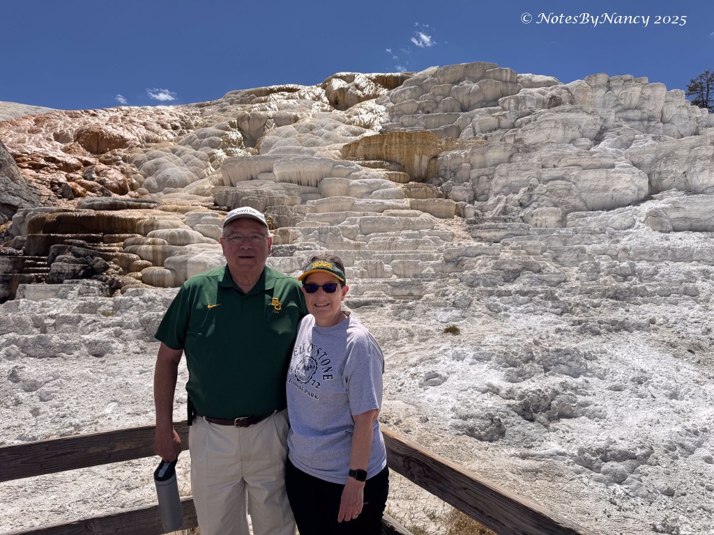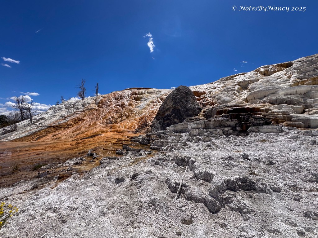 The Terraces (Upper and Lower) here are hot springs that rise up through limestone, dissolve the calcium carbonate, and deposit the calcite that makes the travertine terraces. Consequently, these formations are constantly changing and looked very different from when we were here 15 years ago.