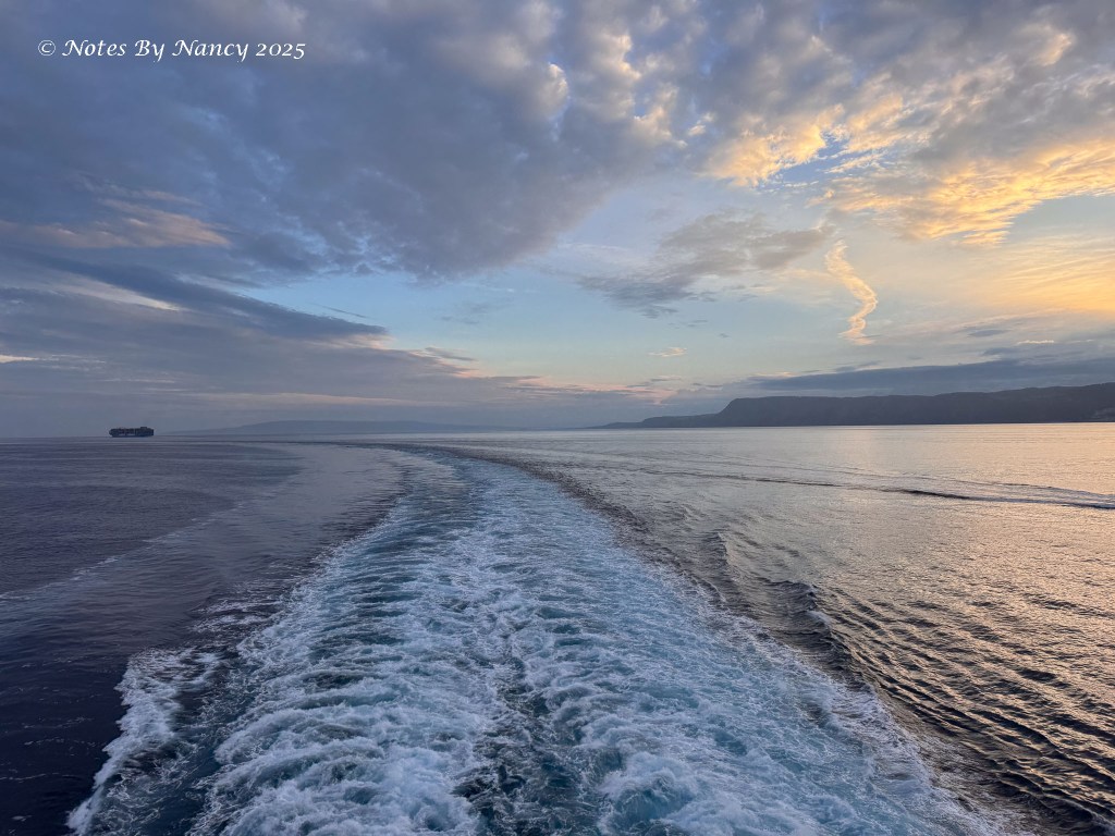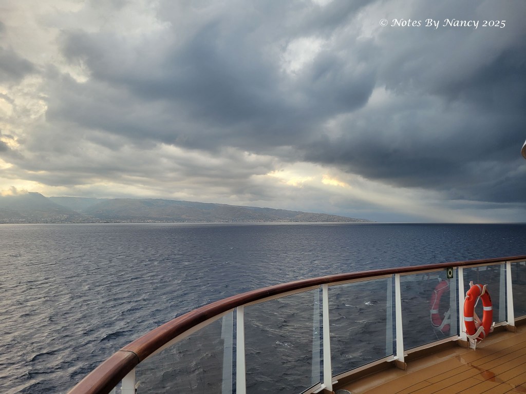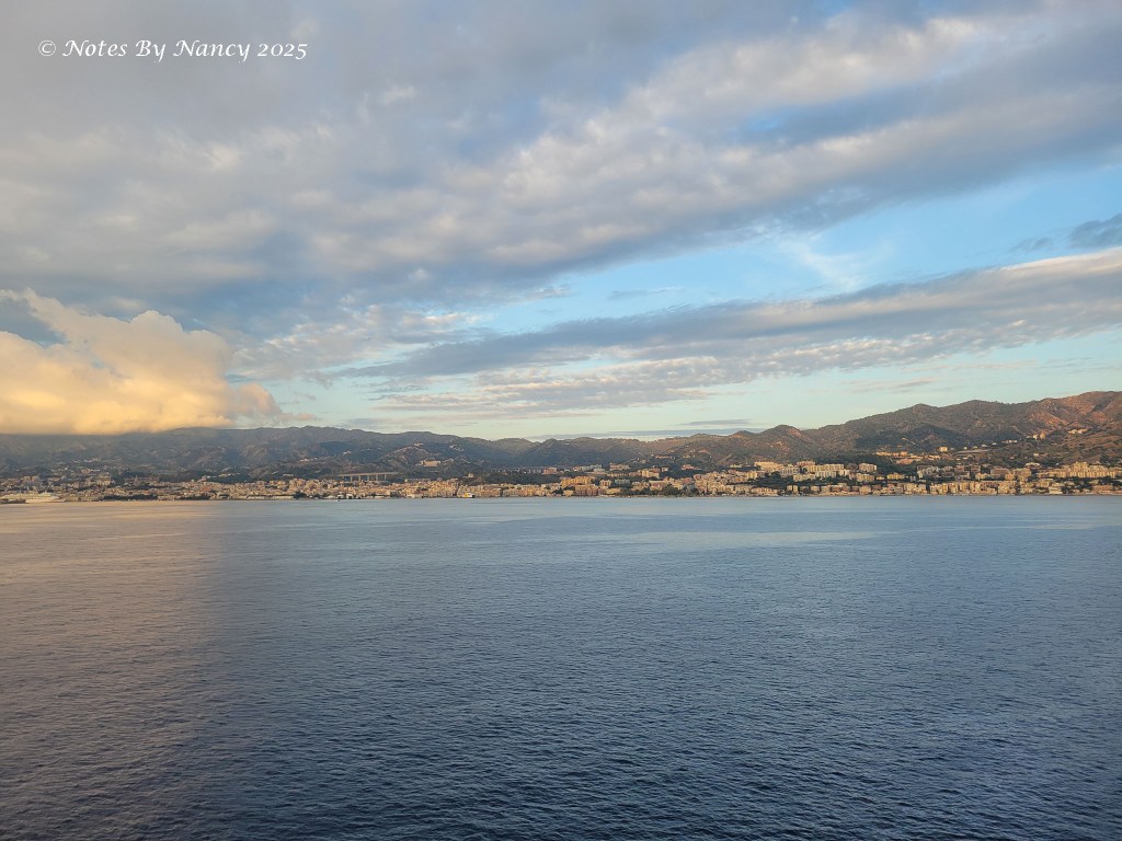 I’m thankful for late sunrises – I’m not typically a “crack of dawn” person – but on this trip every sunrise is after 7am and in Barcelona it was almost 8am! Between Paula, Keith, and I, we got some nice pics today as we went through the Strait of Messina even though it was overcast – Paula and Keith were forward in the Explorer’s Lounge and I was in our aft cabin.