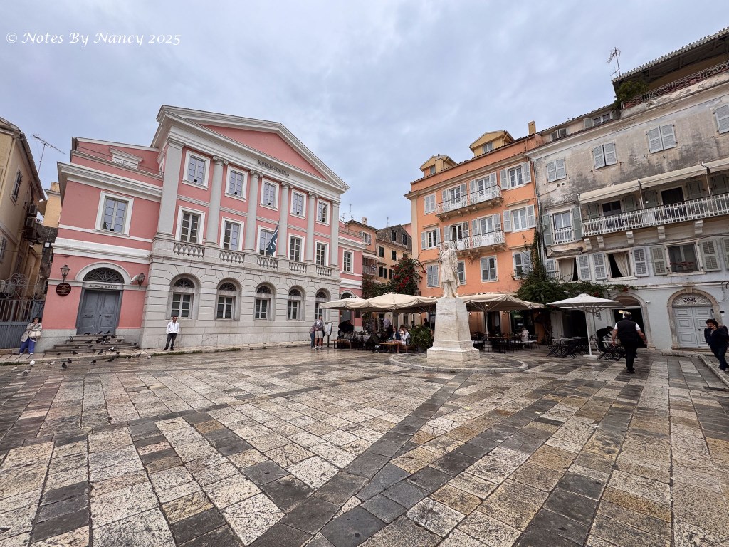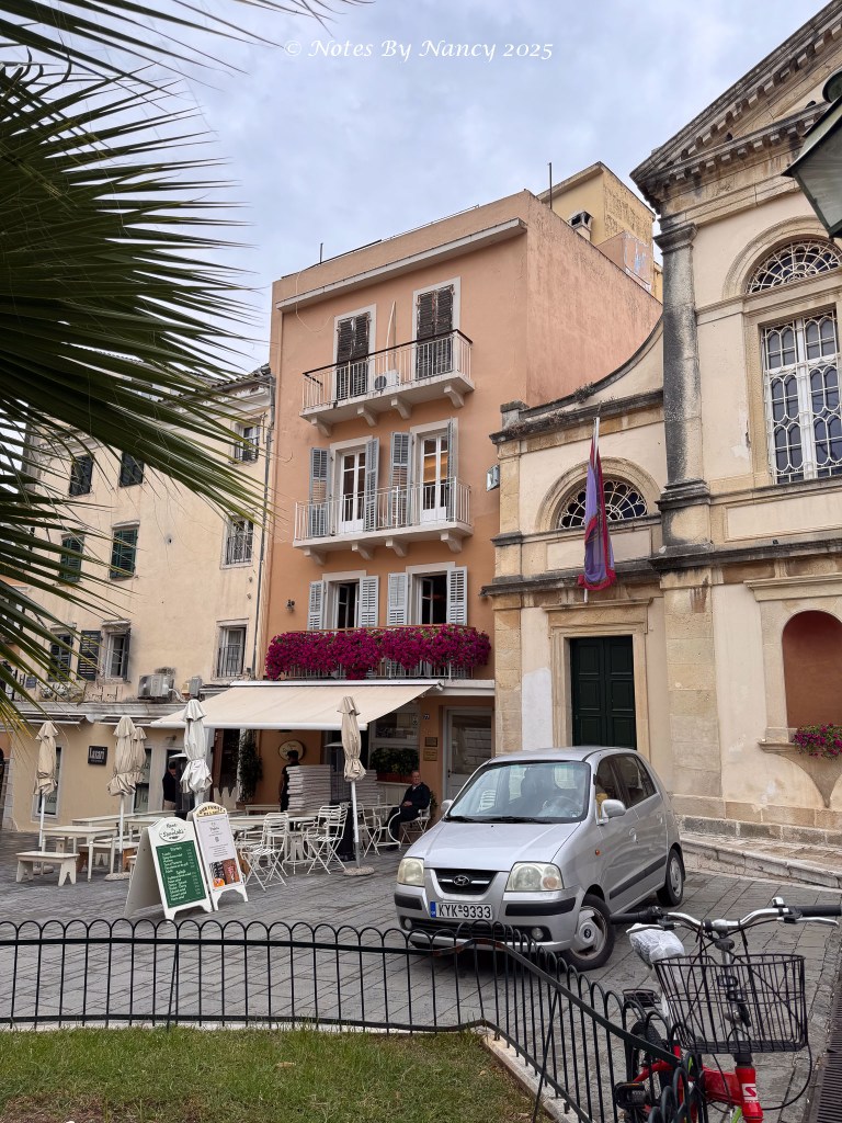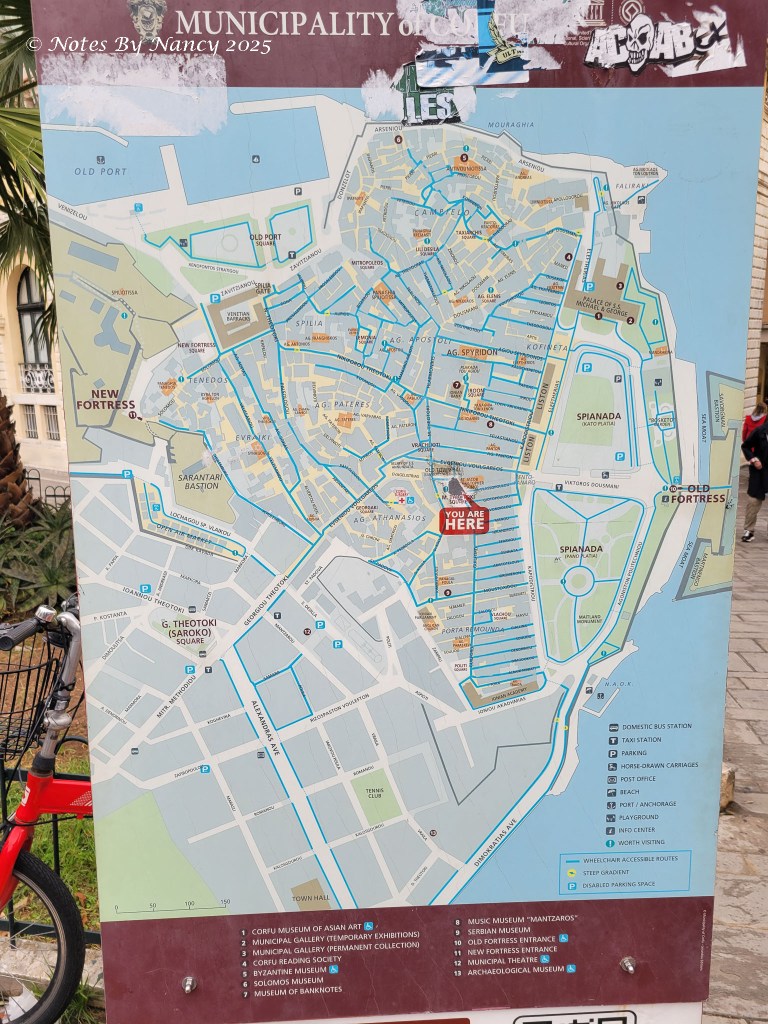 Tickets for exploring the Old Fortress peninsula are 10 Euros, I think. If I hadn’t booked another massage for the afternoon (and wasn’t rainy), we might have returned after lunch to see this fortress which has served to protect the area from the mid-6th century through WWII. Over the centuries, the island has been controlled by Greek city-states, Romans, Byzantines, Angevins, Venetians, Turks (briefly), and the English, before uniting with modern Greece in 1864.