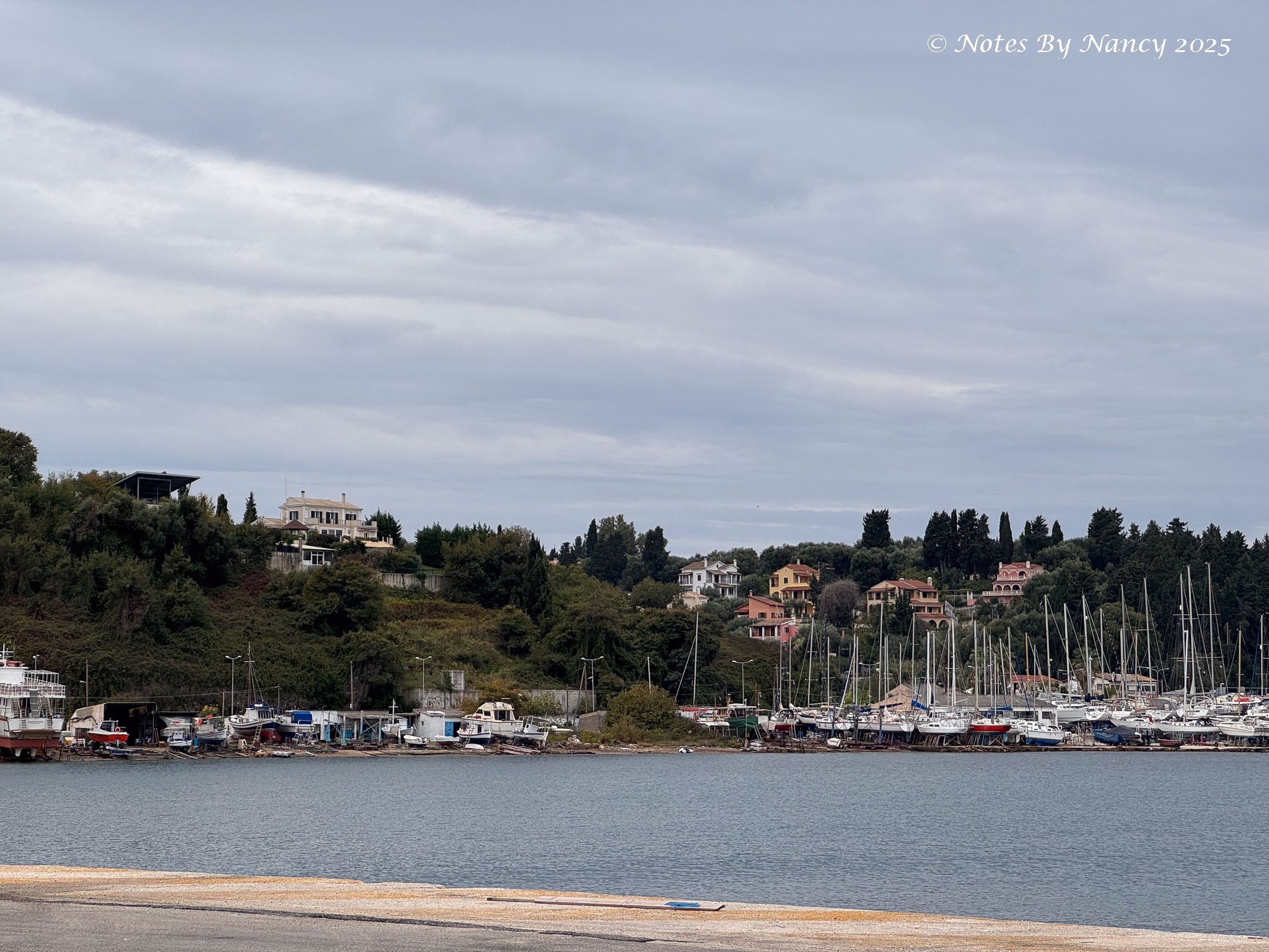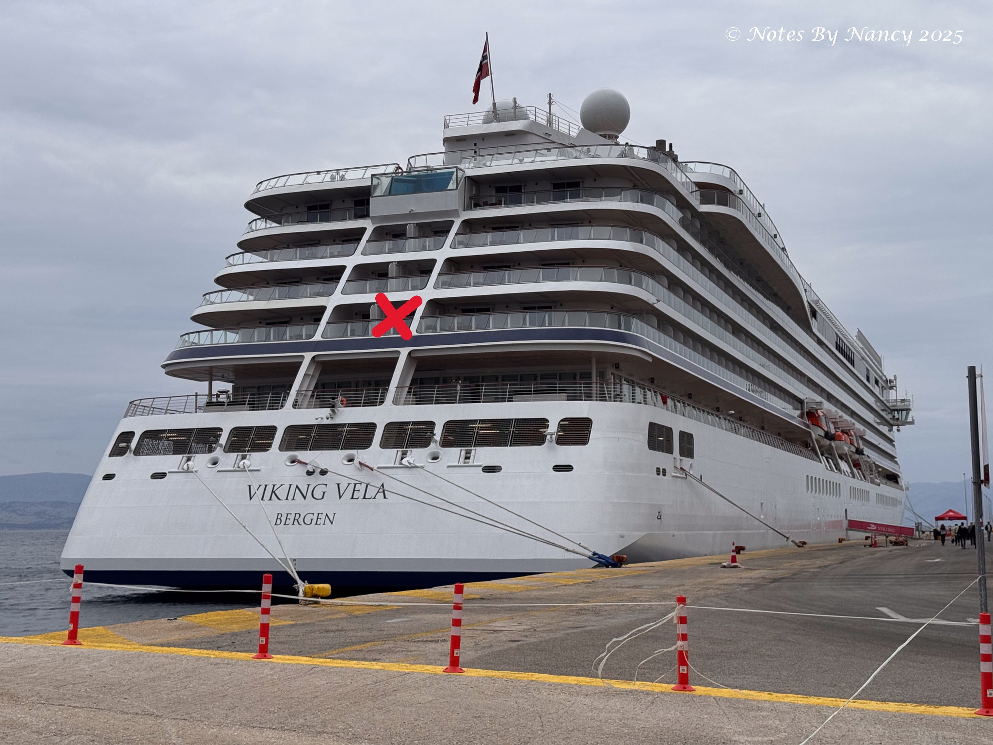 Although the morning tour buses picked us up on the dock adjacent to the ship, the drop-off point to enter the port through security was a pretty good walk back to the ship. But it gave me a chance to get a good pic of the ship, our aft cabin (red X), and the large houses overlooking the adjacent Potamos Bay as the rain started again.