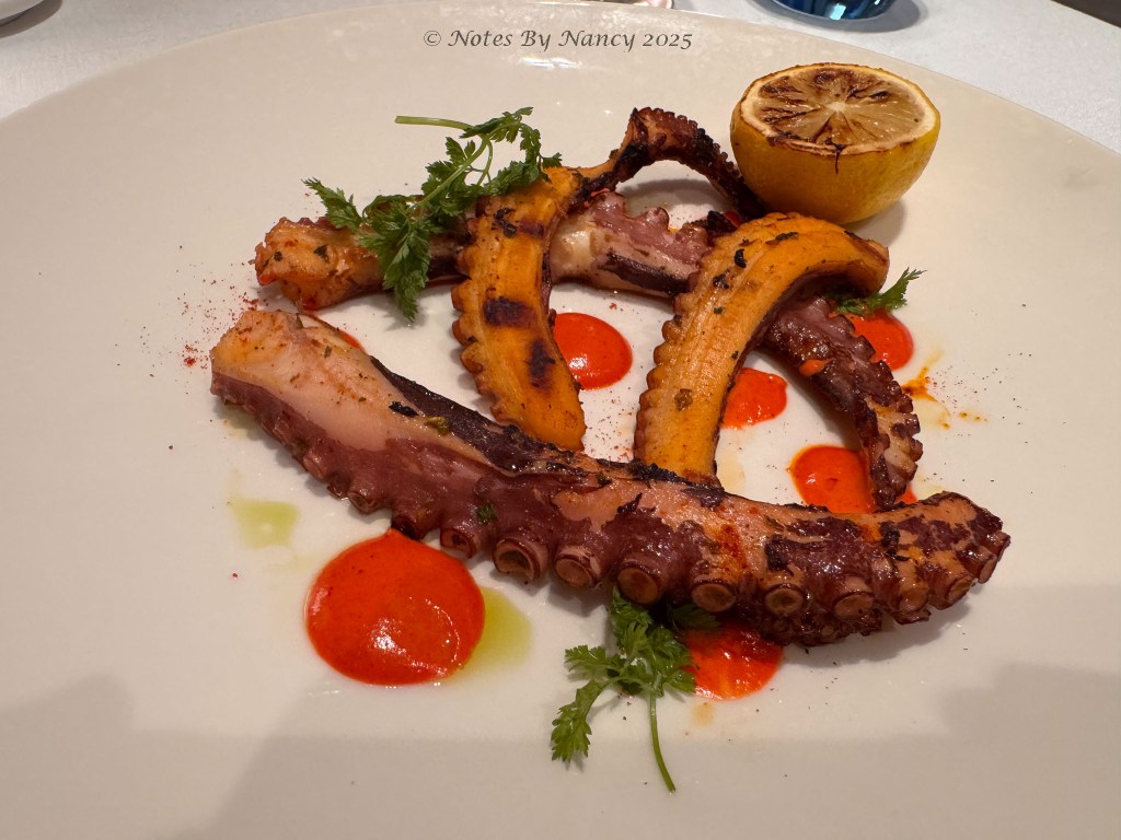 Originally, we planned to eat at Chef’s Table with the Routes des Indes menu, but cancelled a few days ago, opting for dinner in the Restaurant and going to the Explorers’ Lounge afterward for music trivia with Harry the Piano. Octopus and chocolate were a hit in the Restaurant. Then Harry had us guessing the hits in the lounge afterwards – and laughing, too, of course!