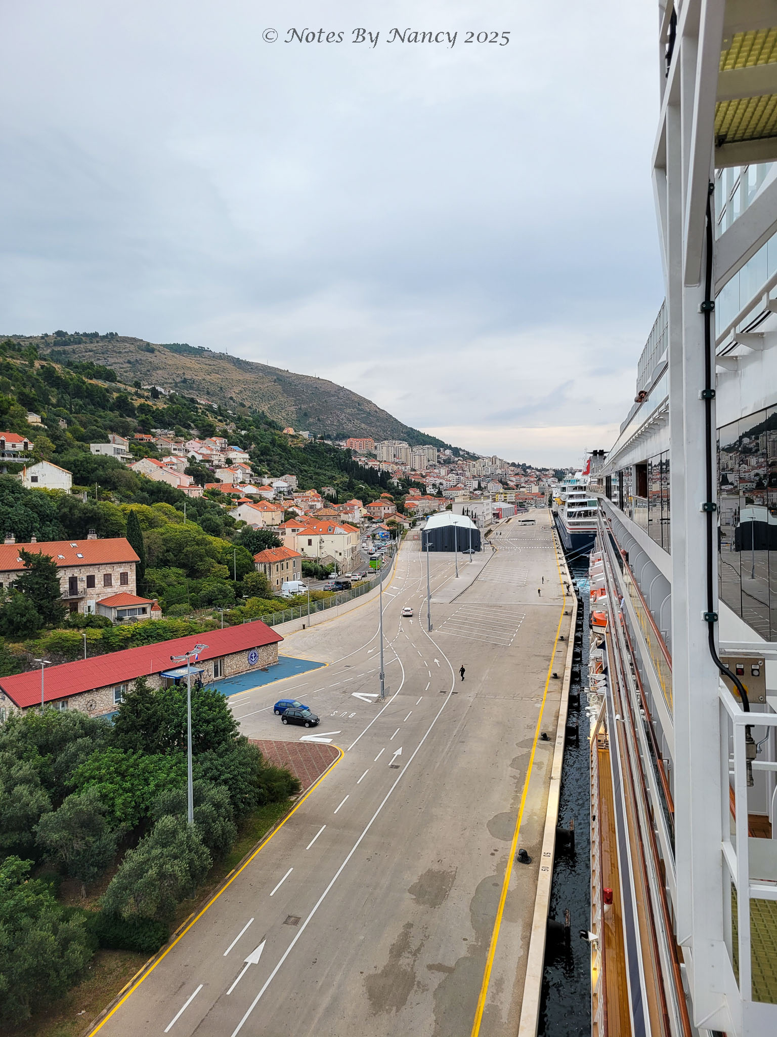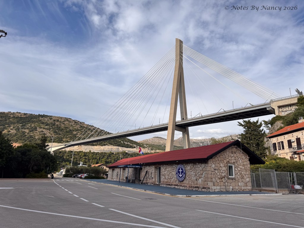 From Corfu in the Ionian Sea, we sailed north overnight into the Adriatic Sea past Albania and Montenegro to the east and Italy to the west. The arrival into one of Croatia’s most southern towns, Dubrovnik, was interesting as we sailed along the coast then did practically a U-turn around a peninsula to enter the natural harbor. With the Dr. Franjo Tuđman Bridge to port side of the ship as we approached the port, the captain turned towards the bridge, then rotated the Vela so that our starboard side was to the bridge and backed us into our berth – fun to watch from our aft cabin.