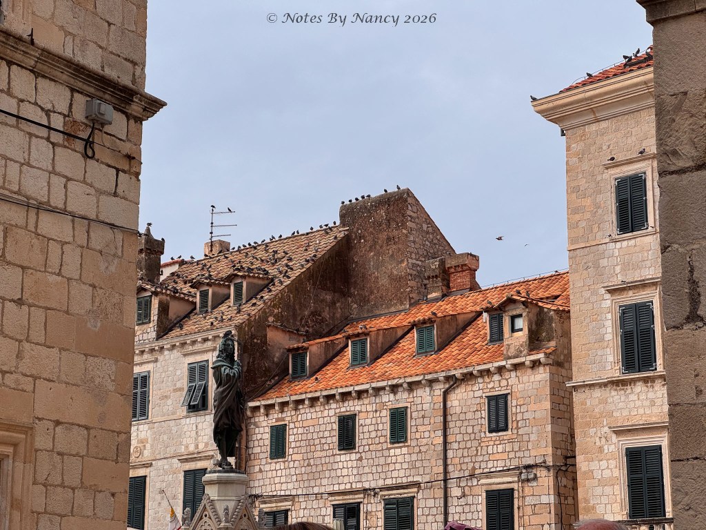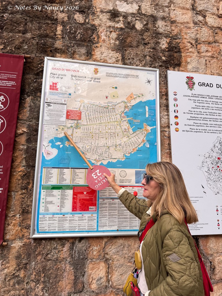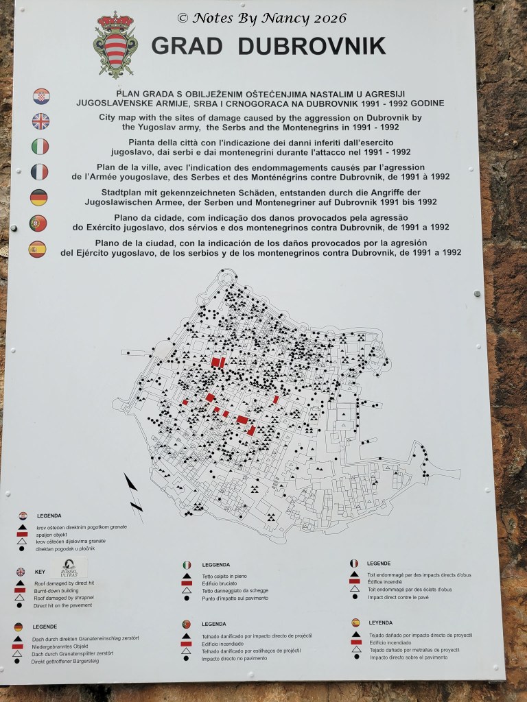 After observing the Lovrjenac Fortress and Forts Bokar and Puncjela (part of Old Town walls) guarding Dubrovnik’s West Harbor, we entered through the Pile Gate and descended into Old Town taking in the statues of St. Blaise, the patron saint of Dubrovnik. Our guide used the city maps on the wall to provide an overview of the town’s history – not just the medieval history, but the recent impact of the bombing of Dubrovnik by the Serbs in 1991-92.