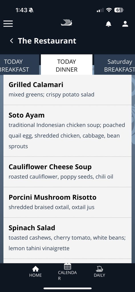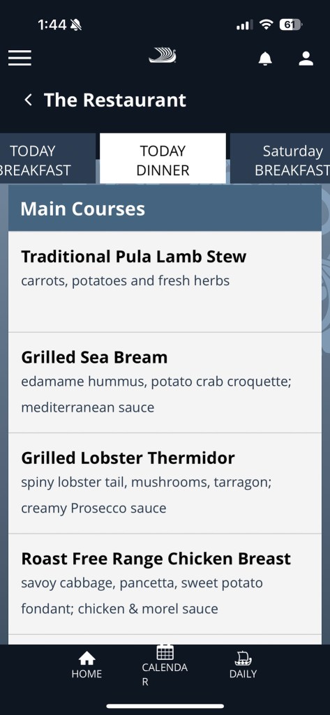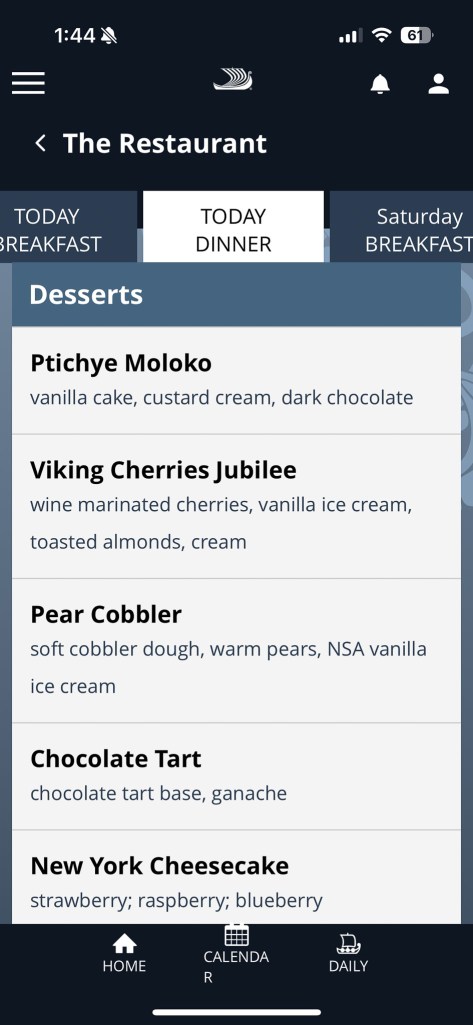 The Viking App (only accessible onboard) displays the menus for all the venues as well as events happening around the ship.