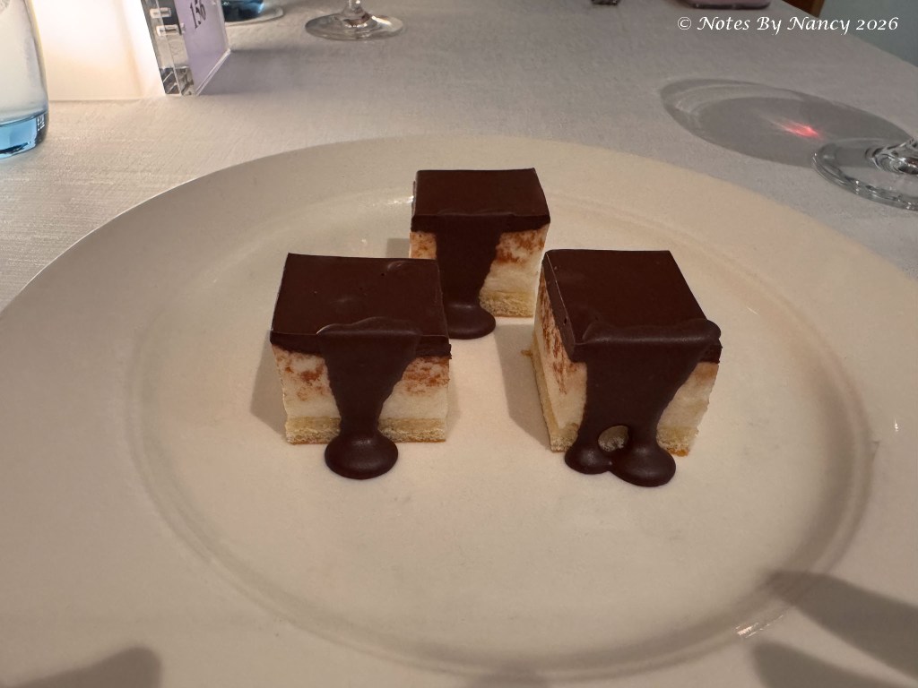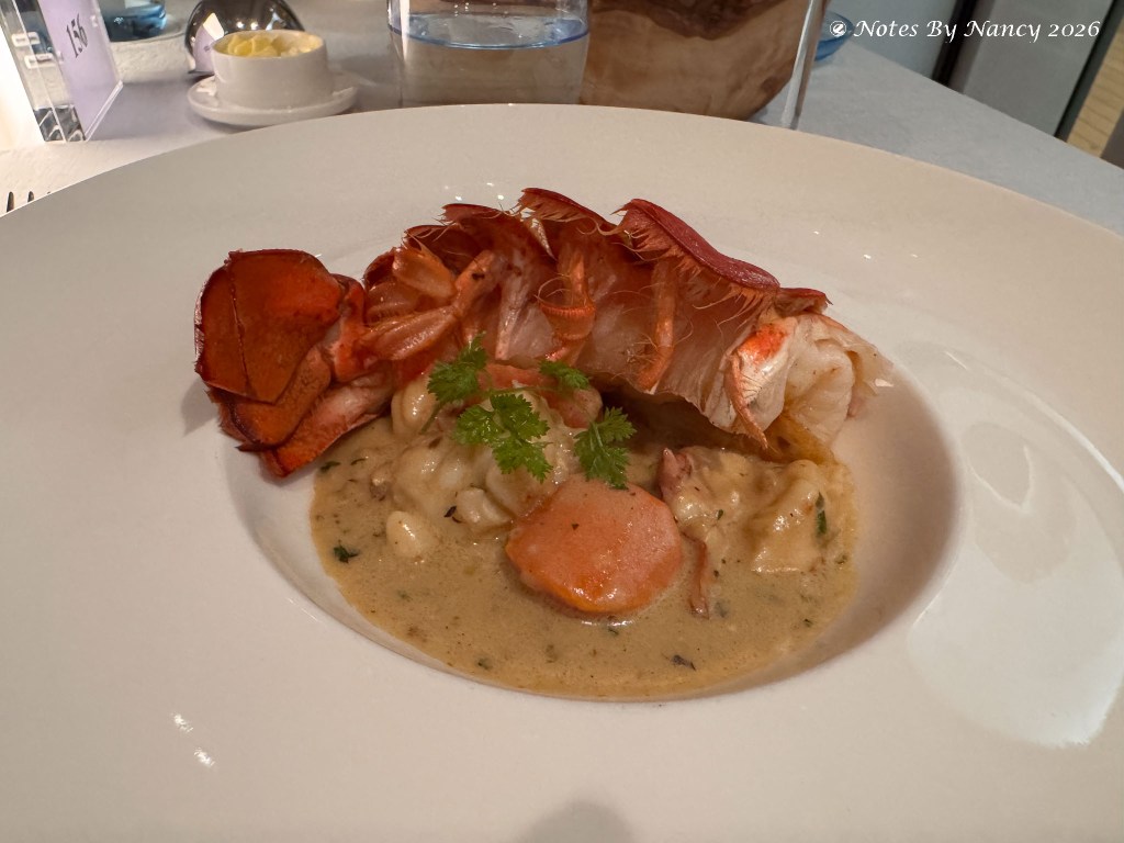 We were intrigued by the options for dinner at the Restaurant, especially the dessert “Ptichye Moloko” which we learned translates from Russian to “Bird’s Milk” (implying something of great rarity). It has chocolate, no other requirement needed for me! The preparation of the Lobster Thermidor was different than we’d had previously on Viking, but still yummy.