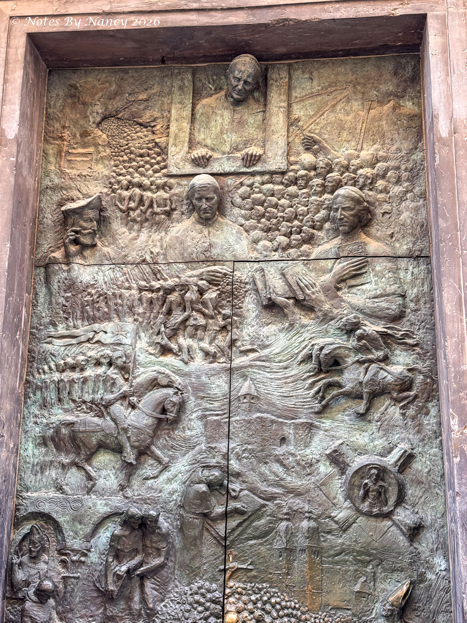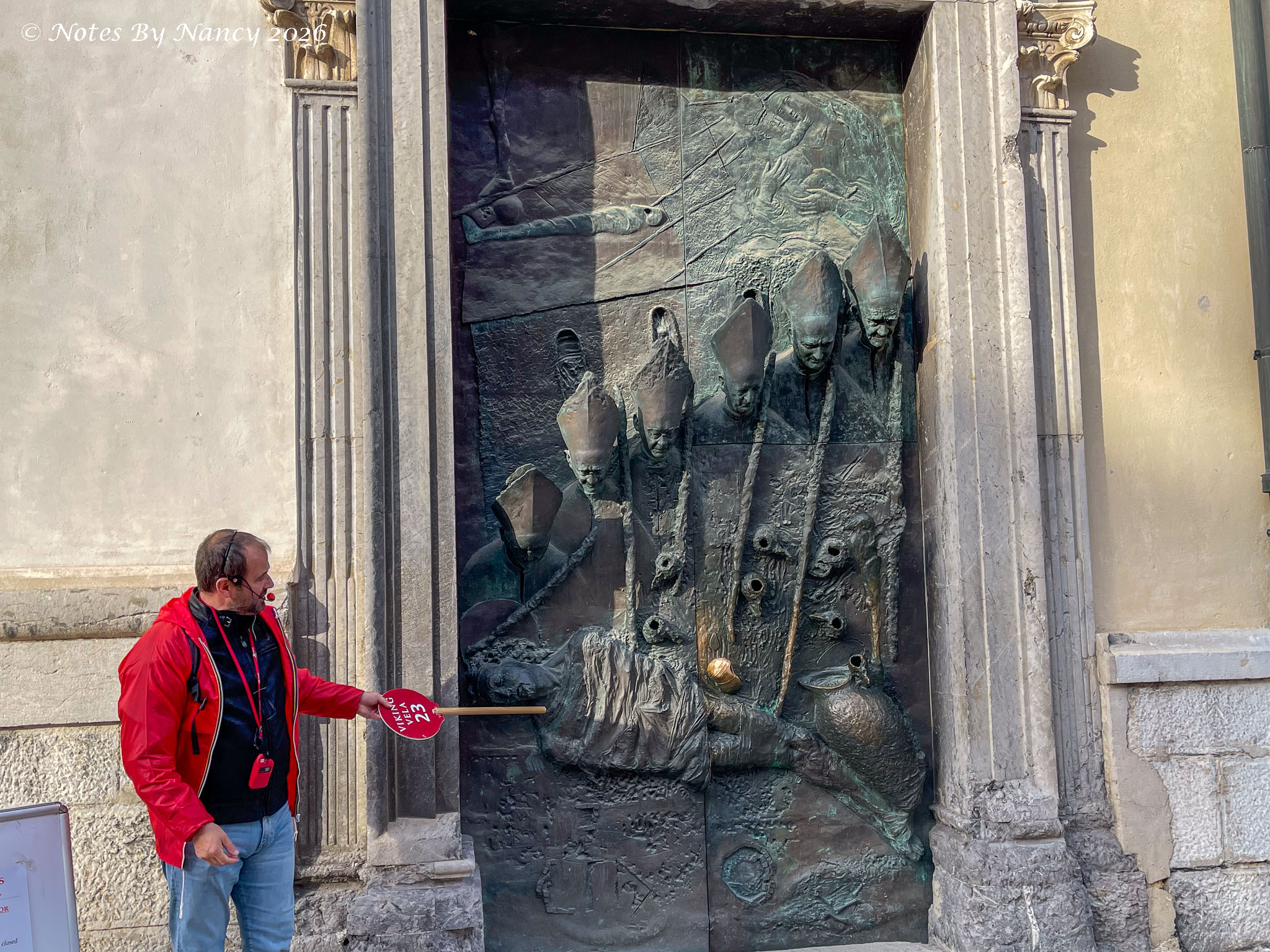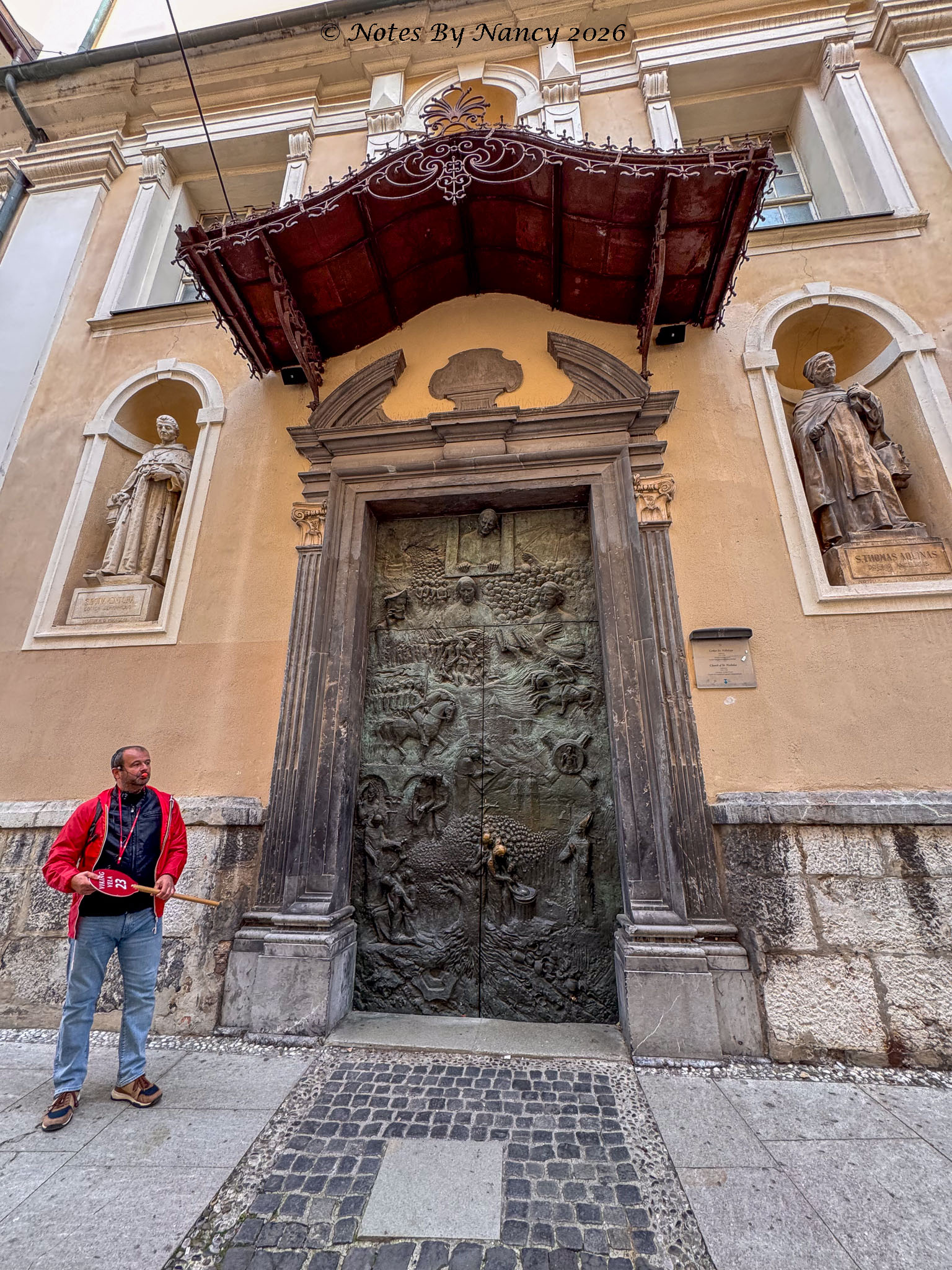 We weren’t able to see the interior of St. Nicholas’s Cathedral because a mass was currently underway, but the exterior had stories to tell! The bronze doors are recent additions to the baroque cathedral built in the early 1700s. The side entrance contains depictions of Ljubljana’s bishops from the 20th century and is called the Ljubljana Door. The main entrance around the corner is the Slovene Door and it commemorates when Pope John Paul visited in 1996 for the 1250-year-anniversary of Christianity in Slovenia .