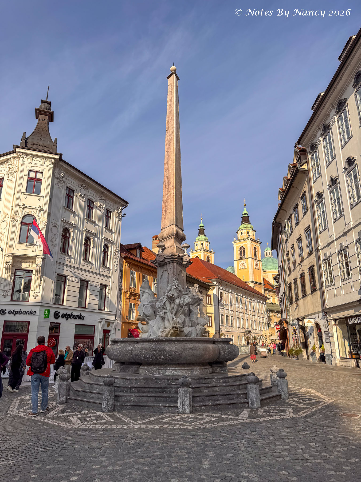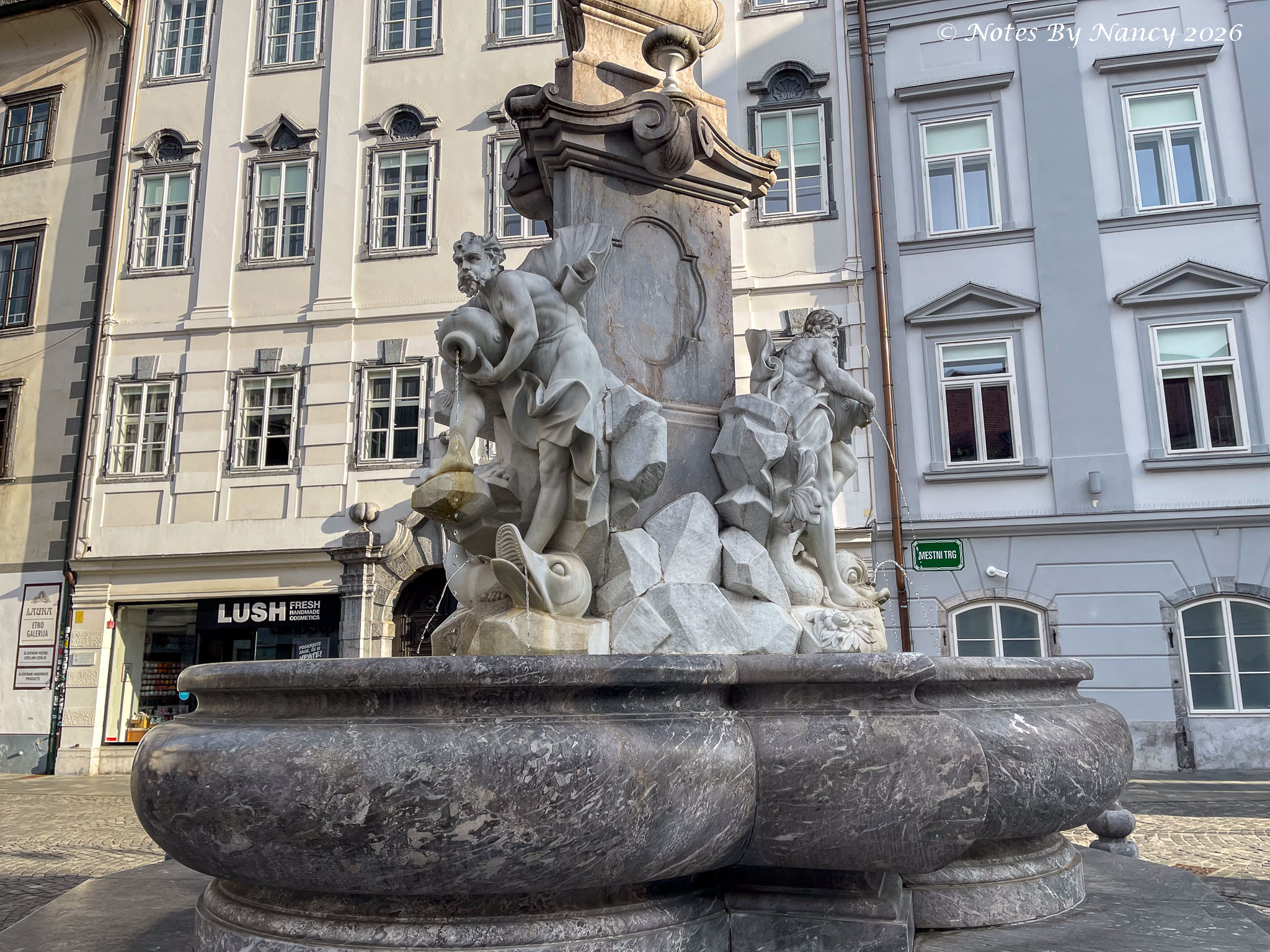 Near Town Hall stands the Robba Fountain also known as The Fountain of Three Carniolan Rivers, created by Francisco Robba around 1750. The three river gods depicted represent the Sava, the Ljubljanica, and the Krka rivers.