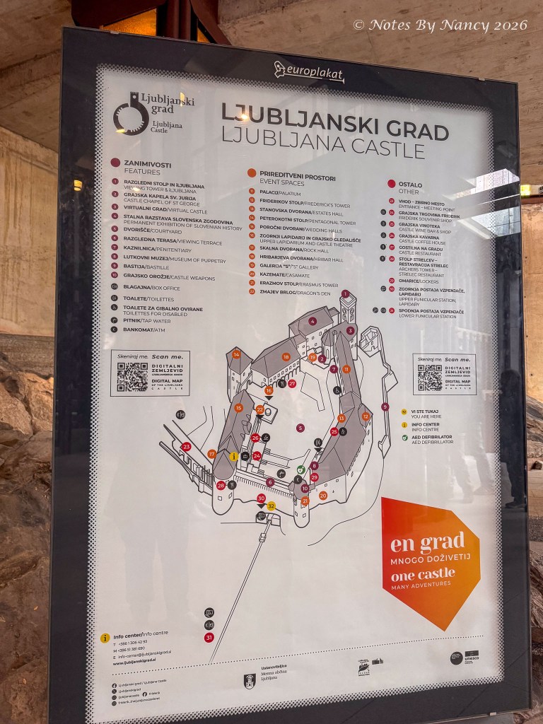 Our guide had given us a lot of information about Slovenia’s history and economy on the way, and now he focused on the history of the castle. Although the area shows sign of occupation since 1200 BC, today’s castle/fortress has medieval origins from the 11th century AD with many renovations and uses until the mid-late 20th century. It has been used as a prison, military hospital, and housing for the city’s poor. In 1970, extensive renovations began.