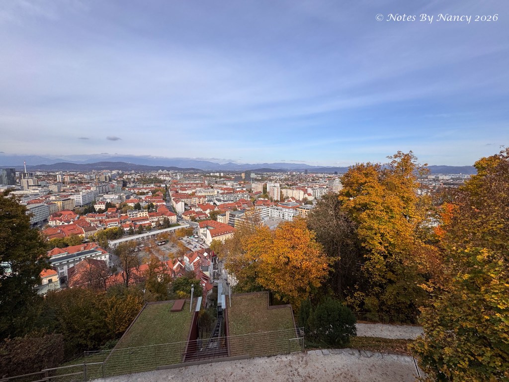 As we approached the city center, we had to take a slight detour as the Ljubljana Marathon was finishing up and many roads were blocked for that event. Our bus driver found a spot to let us off for the walk to the castle. To reach the castle above the town, there is a funicular. We had a rather lengthy wait while our guide bought the tickets, then we had to split into two groups to ride up (and later back down). So, more waiting for the second group to arrive at the top. It would be more efficient if there was a way of purchasing the tickets online on the way there, but perhaps there wasn’t a good way to do that for group tickets.