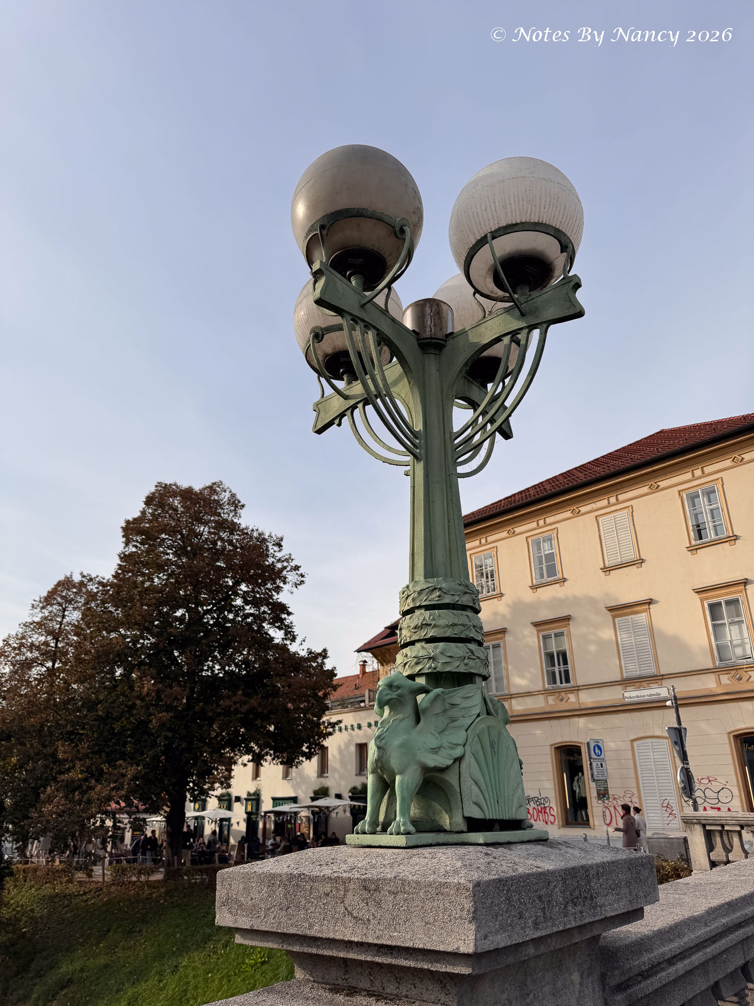 We cut through the central market area near the WOW sign to find the Ljubljanica River and its iconic Dragon Bridge commemorating the 40th anniversary of Emperor Franz Joseph I’s reign.