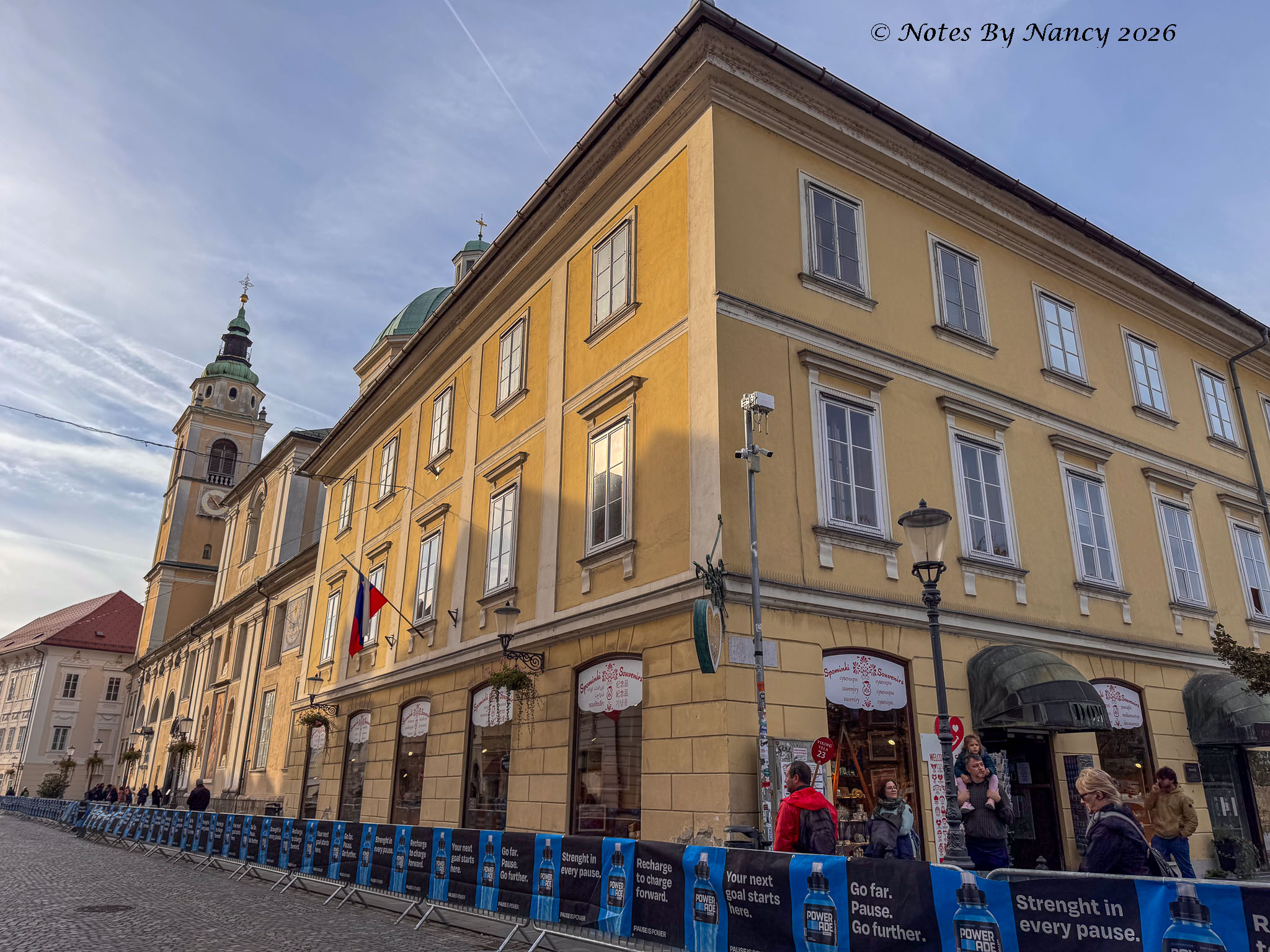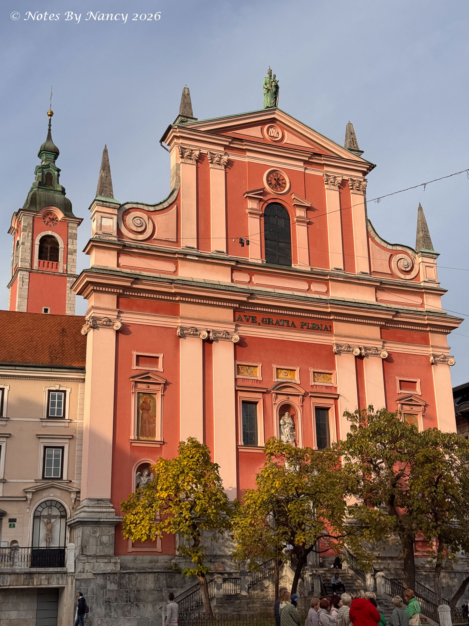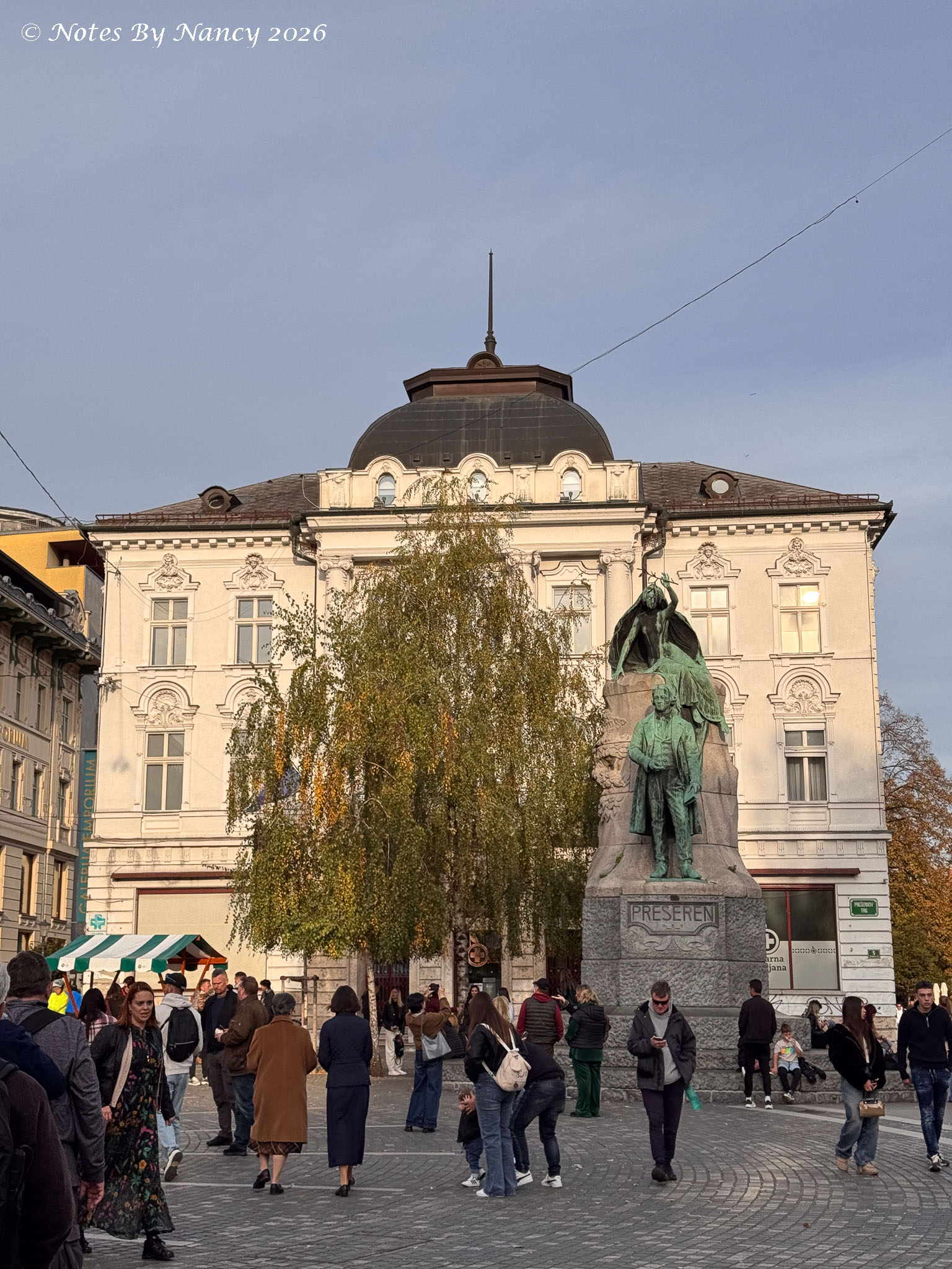 Next we visited Prešeren Square, named for Slovenia’s National Poet Frances Prešeren with its many beautiful buildings such as the Neo-Renaissance National Pharmacy building with the statue of Prešeren, the Baroque Franciscan Church, and the Art Nouveau Urbanc Palace.