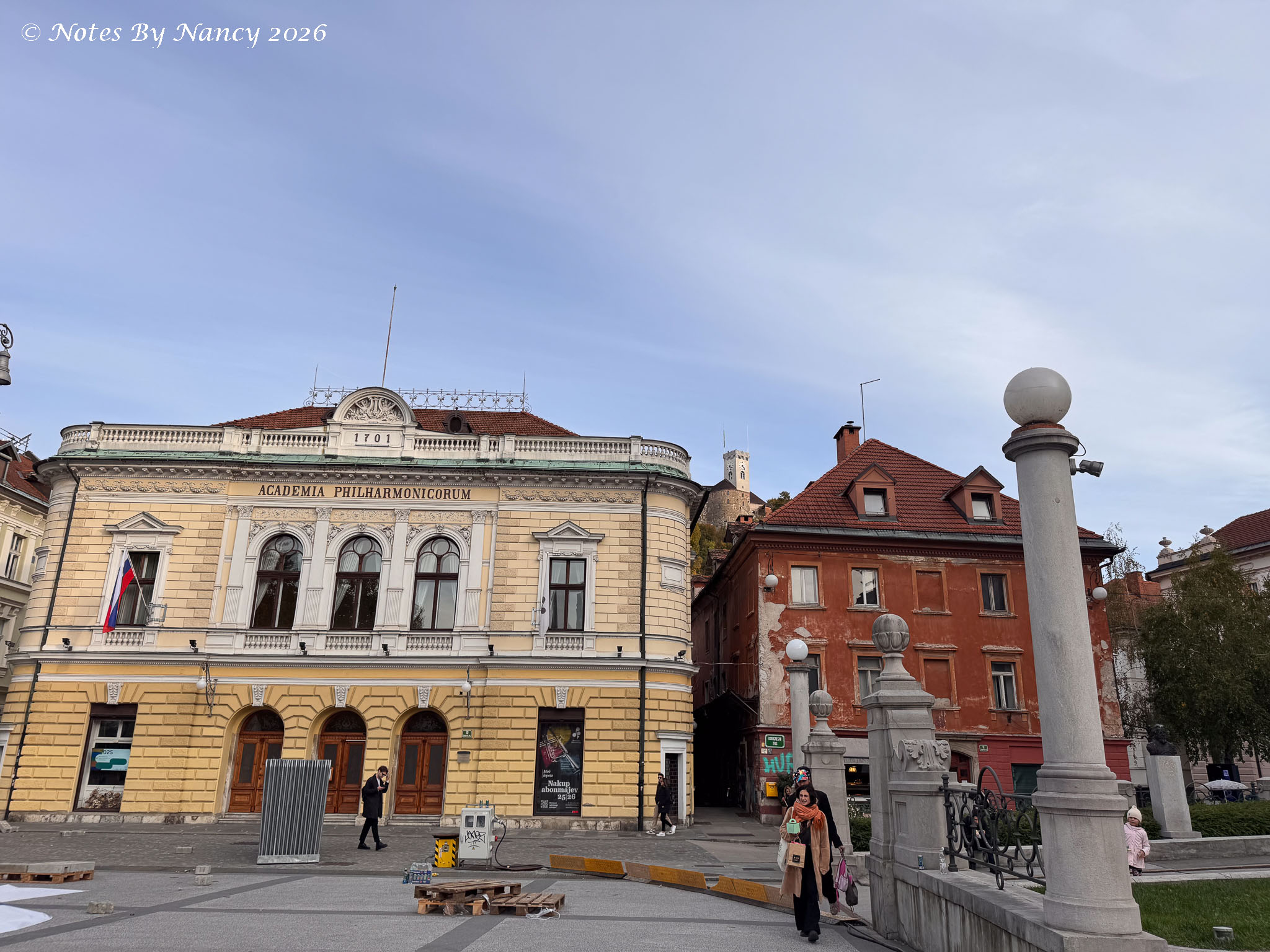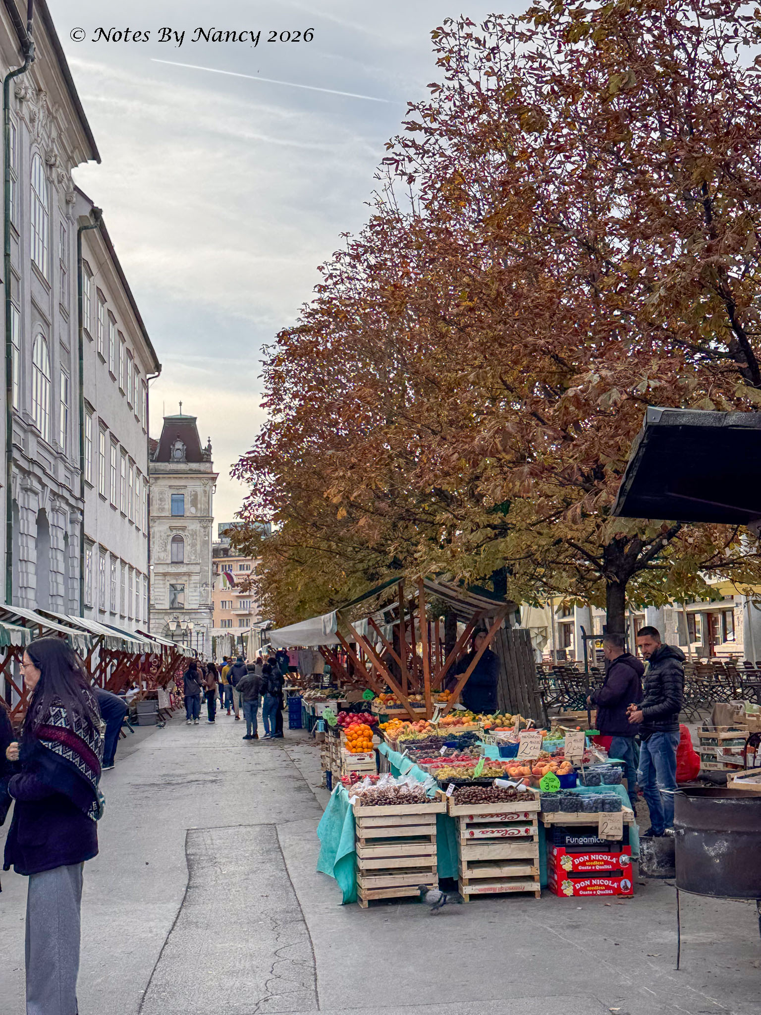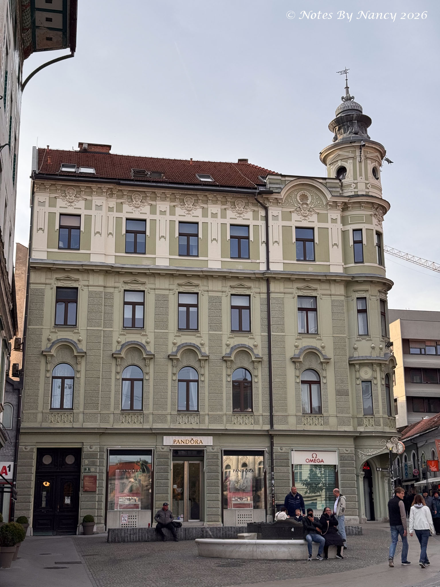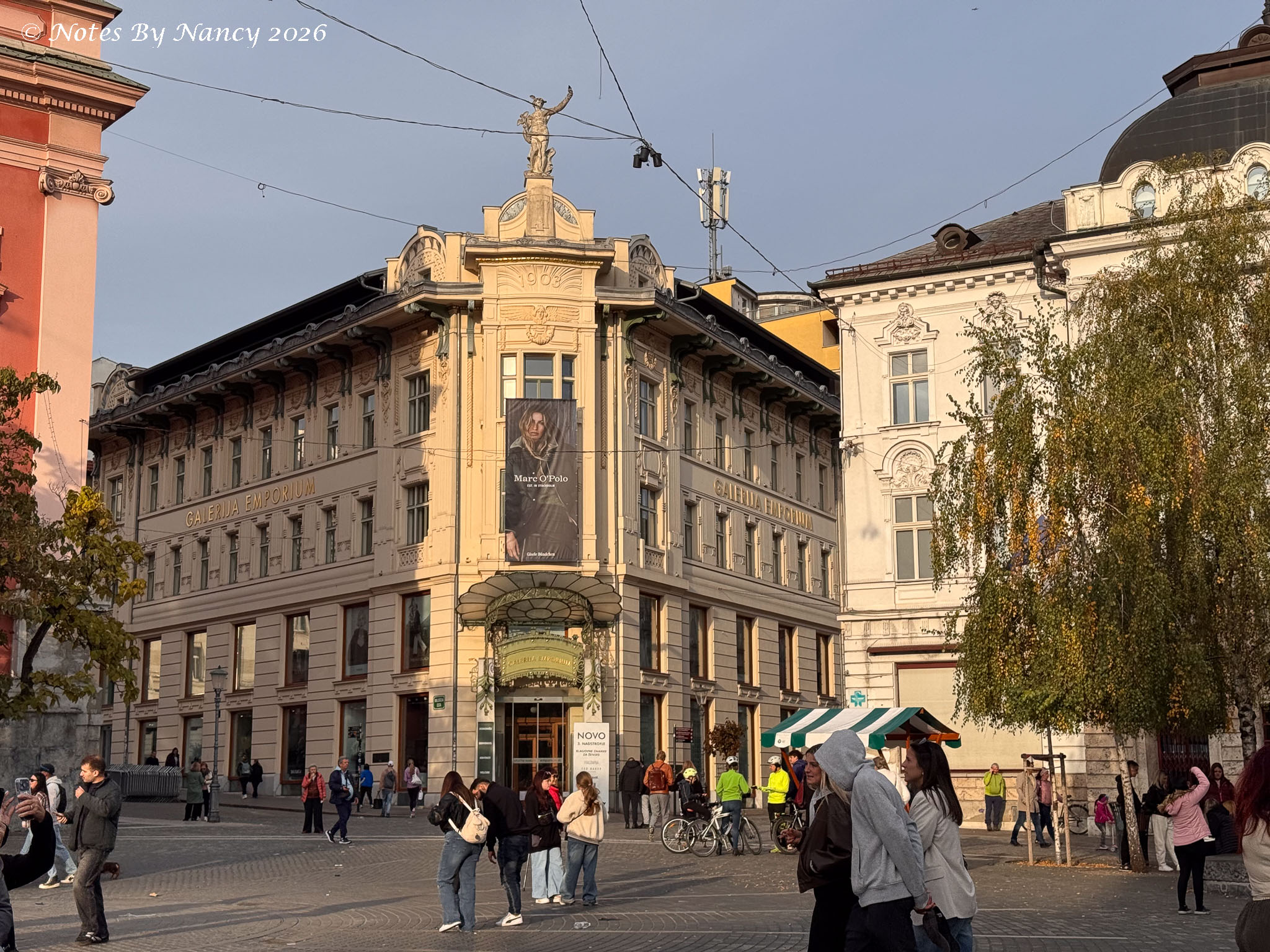 Next we visited Prešeren Square, named for Slovenia’s National Poet Frances Prešeren with its many beautiful buildings such as the Neo-Renaissance National Pharmacy building with the statue of Prešeren, the Baroque Franciscan Church, and the Art Nouveau Urbanc Palace.