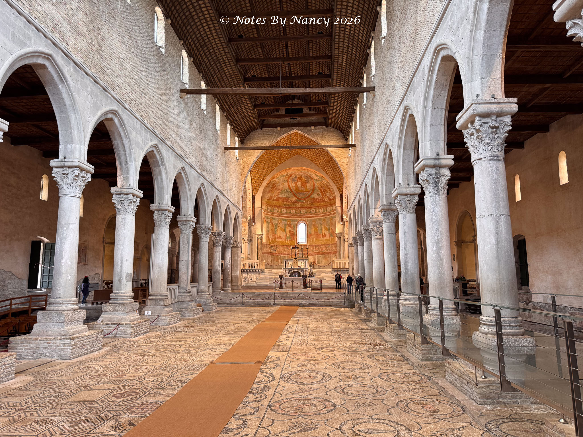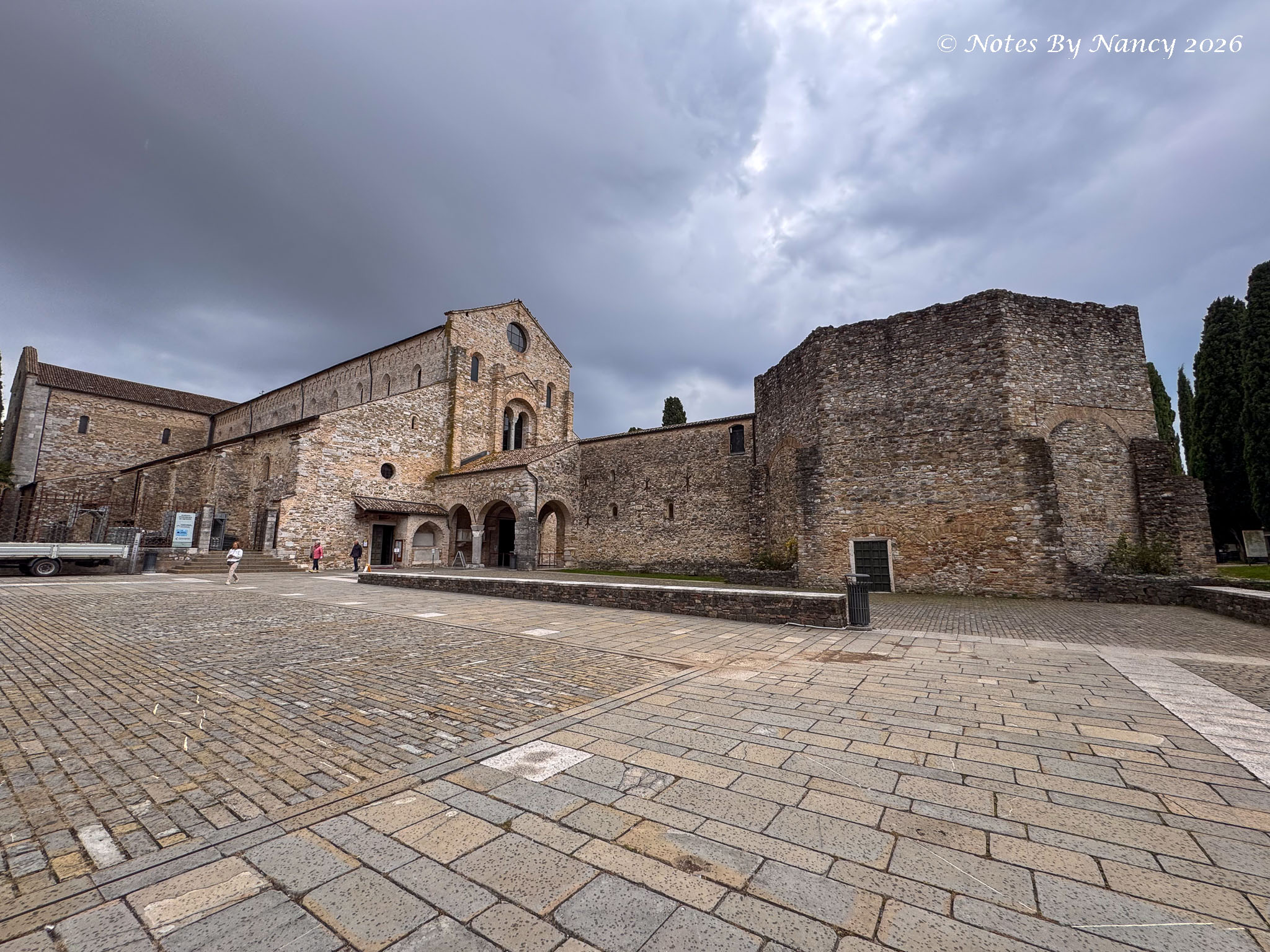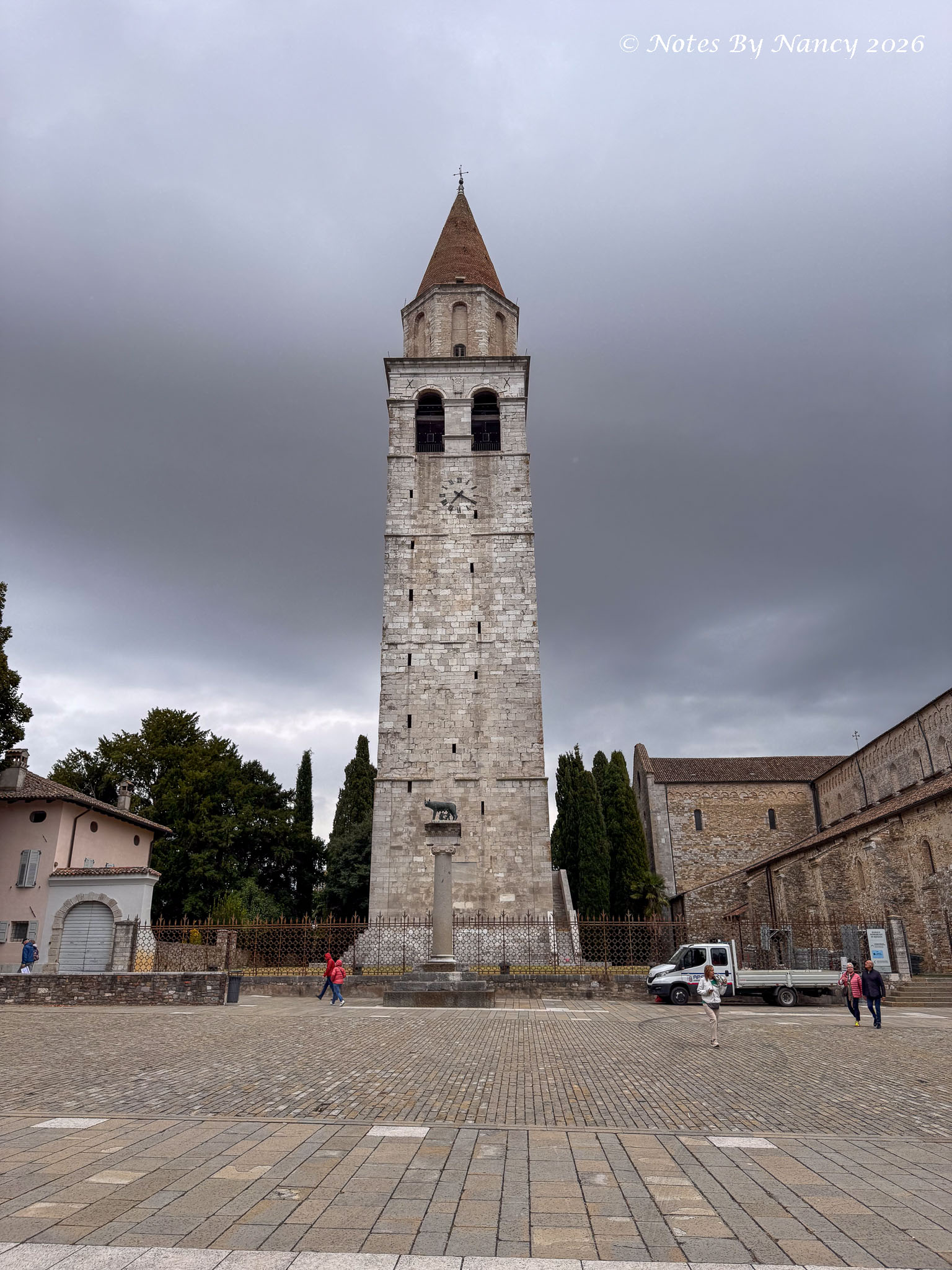 Our destination was the Basilica di Aquileia also known as Basilica di Santa Maria Assunta. The town of Aquileia with origins in the 2nd century BCE was a large and wealthy Roman city. The original church dates to the early 4th century when it was built by Bishop Theodore following the Edict of Milan signed by Emperors Constantine and Licinius which gave Christians legal status allowing them to worship freely. Additional changes were made over the next 100 years expanding both upwards and outwards. Then, again in the 9th century under Maxentius when additional architectural changes were made, including the crypt. More major changes were made in the 11th century by Poppo creating the essential structures seen today. There were also some restorations in the following centuries to repair earthquake damage. This link to the official website of the church provides a great overview of the development of the site and its importance in the Christian world. This link is only in Italian – so be sure to allow your browser to translate to English!