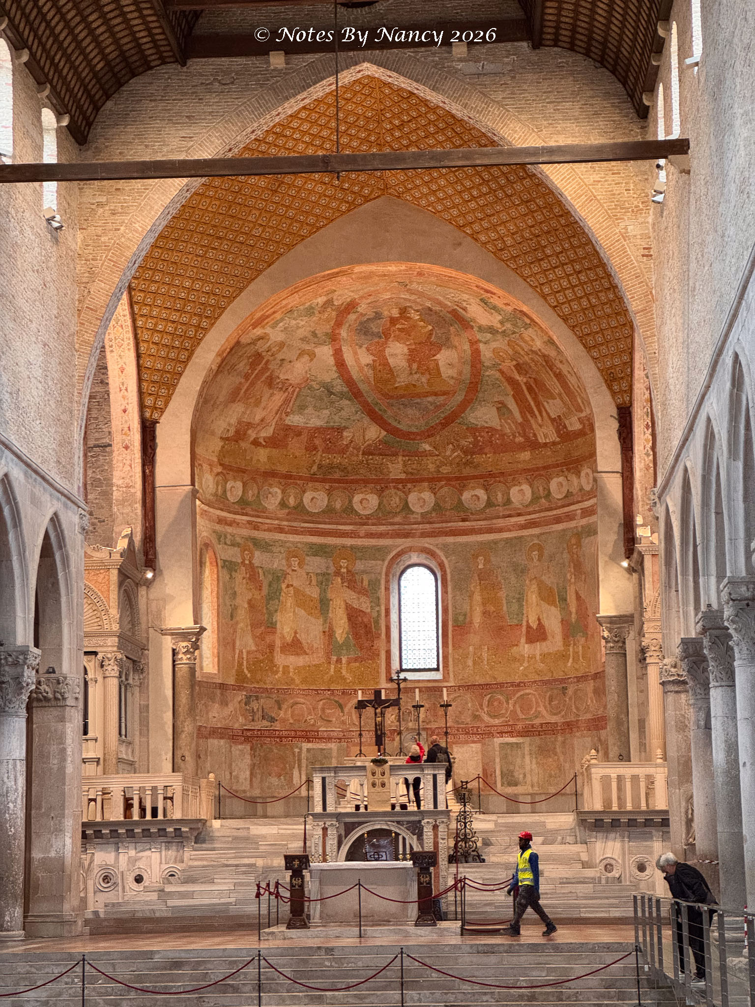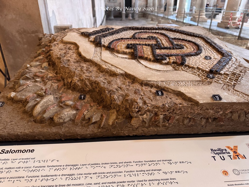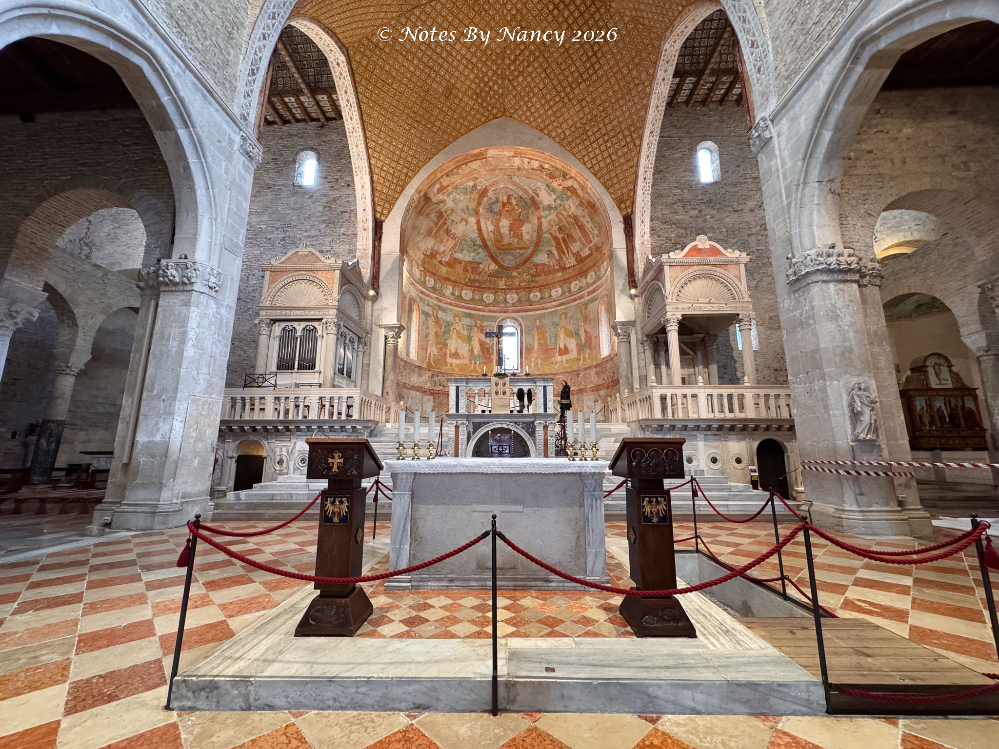 Our destination was the Basilica di Aquileia also known as Basilica di Santa Maria Assunta. The town of Aquileia with origins in the 2nd century BCE was a large and wealthy Roman city. The original church dates to the early 4th century when it was built by Bishop Theodore following the Edict of Milan signed by Emperors Constantine and Licinius which gave Christians legal status allowing them to worship freely. Additional changes were made over the next 100 years expanding both upwards and outwards. Then, again in the 9th century under Maxentius when additional architectural changes were made, including the crypt. More major changes were made in the 11th century by Poppo creating the essential structures seen today. There were also some restorations in the following centuries to repair earthquake damage. This link to the official website of the church provides a great overview of the development of the site and its importance in the Christian world. This link is only in Italian – so be sure to allow your browser to translate to English!
