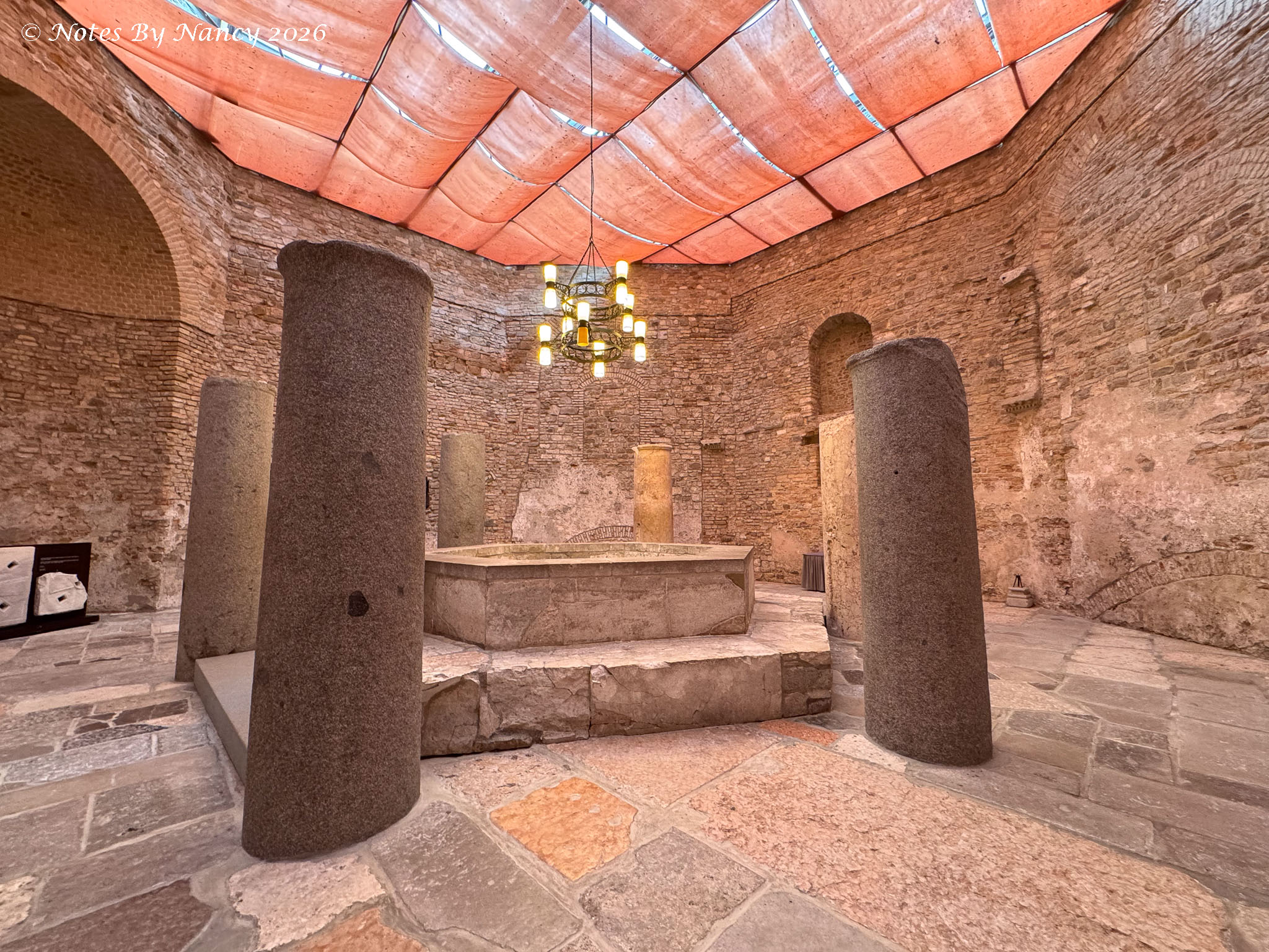 The final building we visited in the basilica complex was the octagonal baptistery constructed in the late 4th to early 5th century by Bishop Chromatius which is attached to the Sudhalle where additional mosaics can be seen.