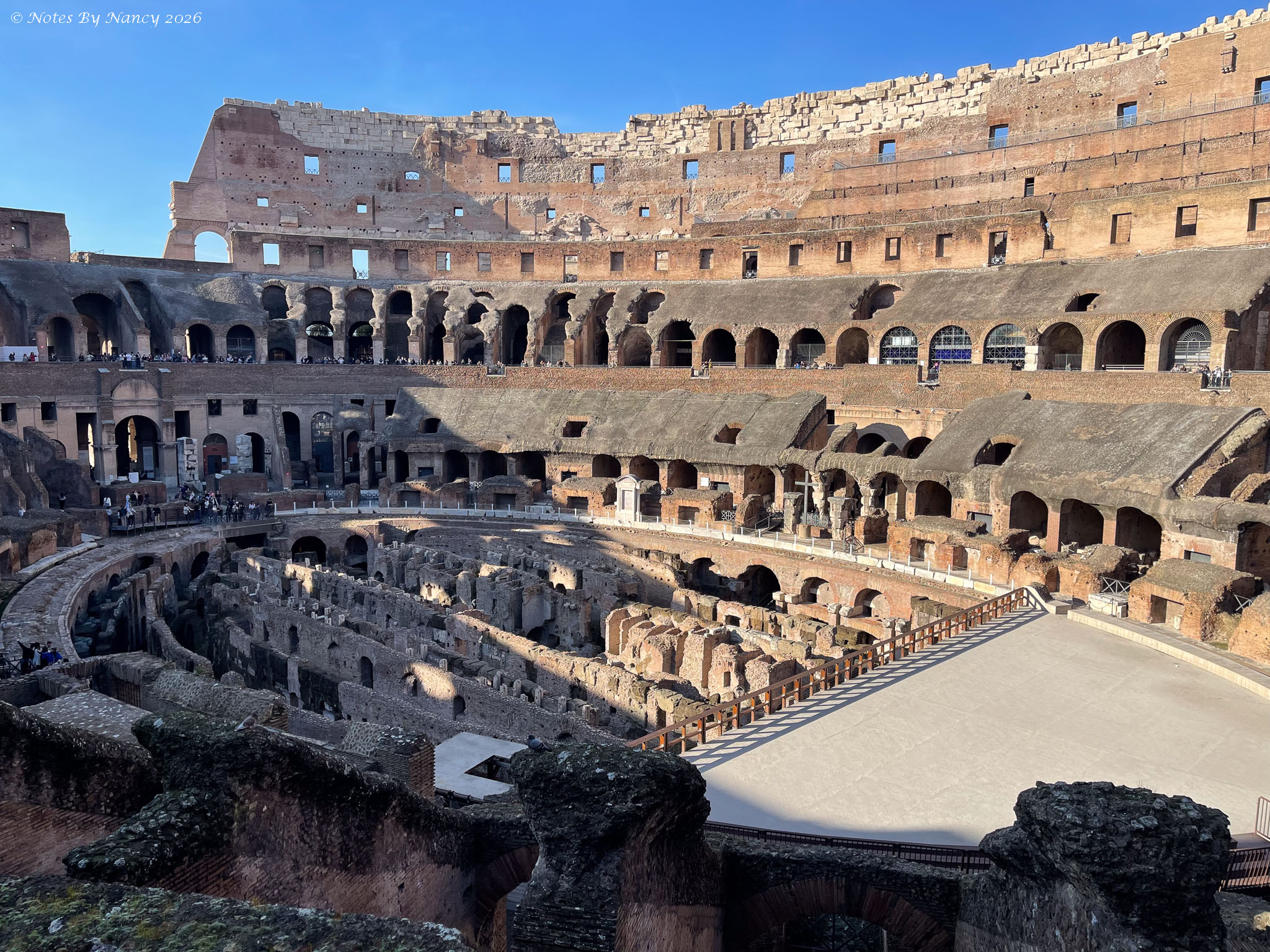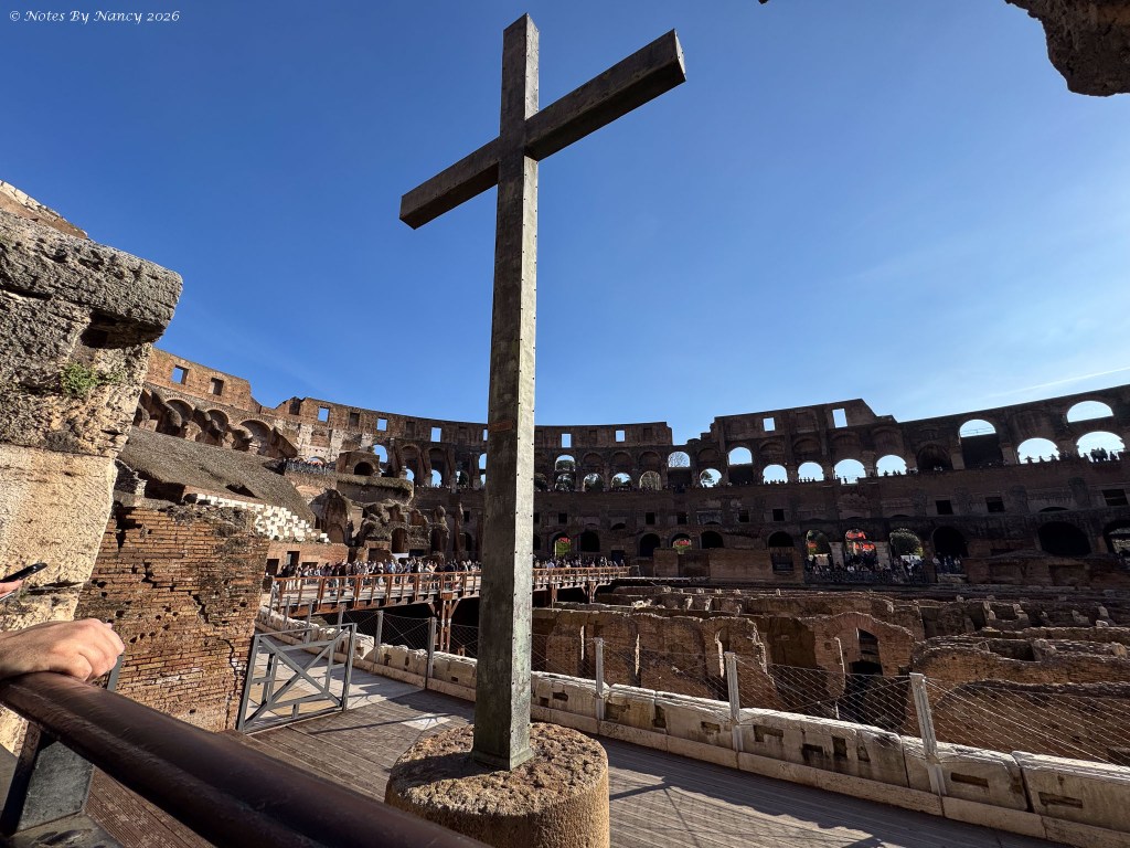 The cross placed inside the Colosseum is in the location where the emperors sat to watch the events. On Good Friday, which is tomorrow as I finally write this, the Pope leads a “Way of the Cross” procession which begins around the Colosseum.