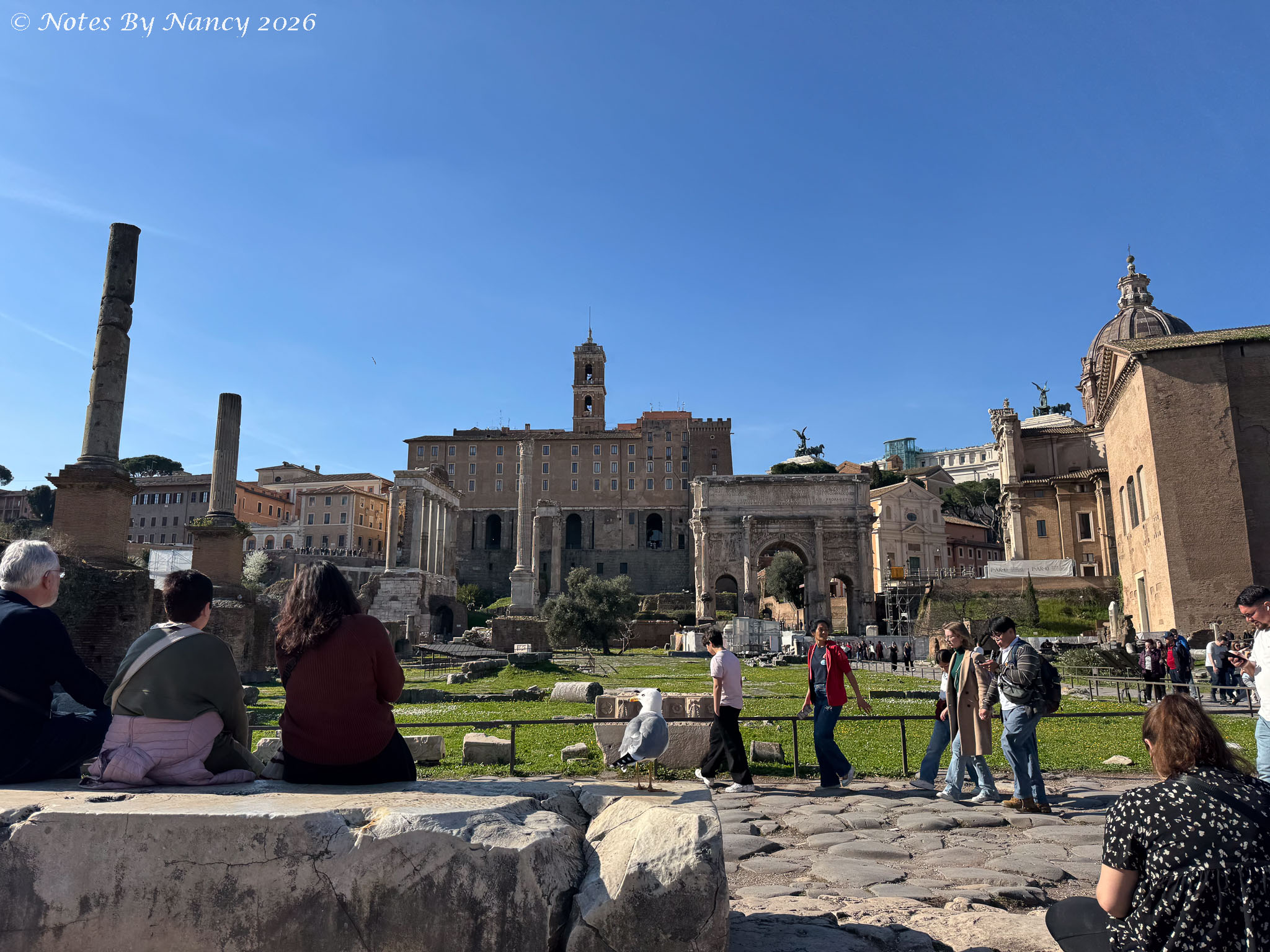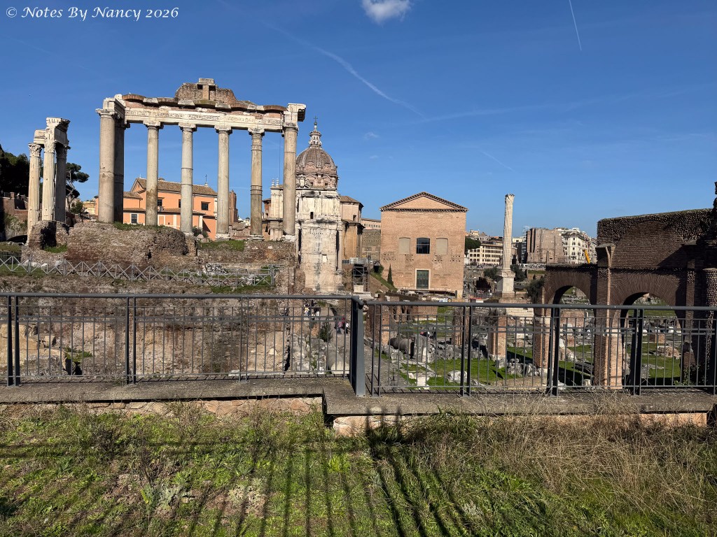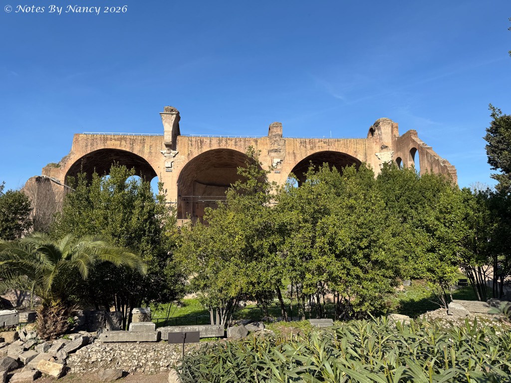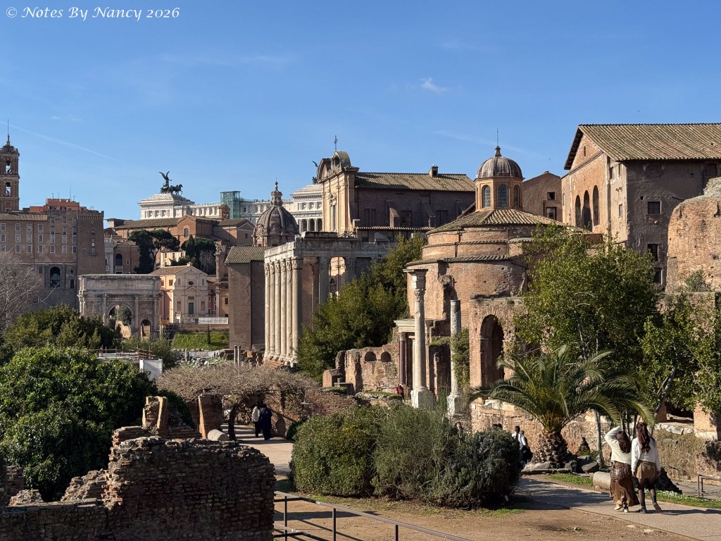 The Forum was the center of life in the ancient city from the 8th Century BC until being abandoned in the 7th Century AD. From royal residences to civic and judicial basilicas to pagan temples to monumental arches – the remaining ruins today are quite impressive – especially when you consider how much was excavated and used to construct “new” buildings during medieval and Renaissance times (e.g. St. Peter’s Basilica). We learned that the word “basilica” comes from the Greek word for “royal” as in the Stoa Basileios or “royal stoa” in Athens. Thus, the original basilicas here were large colonnaded buildings with porticos like those in Greece. The term began to take on its current meaning of a large church granted special status by the Pope during the time of Constantine.