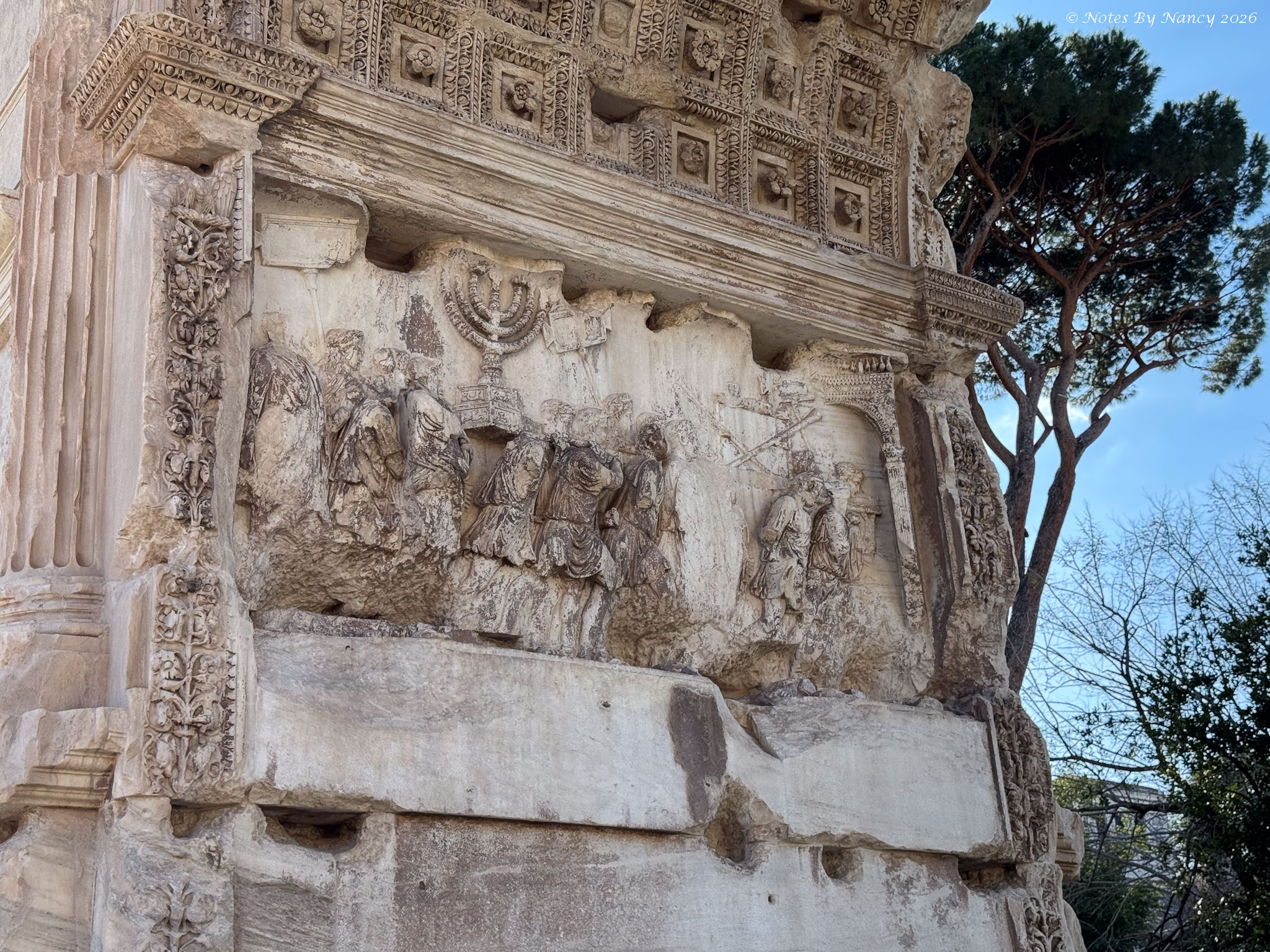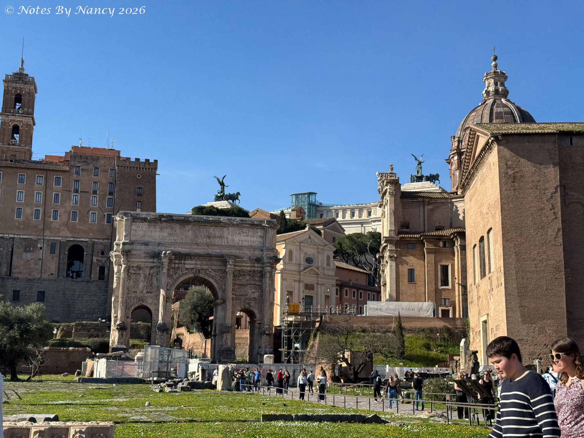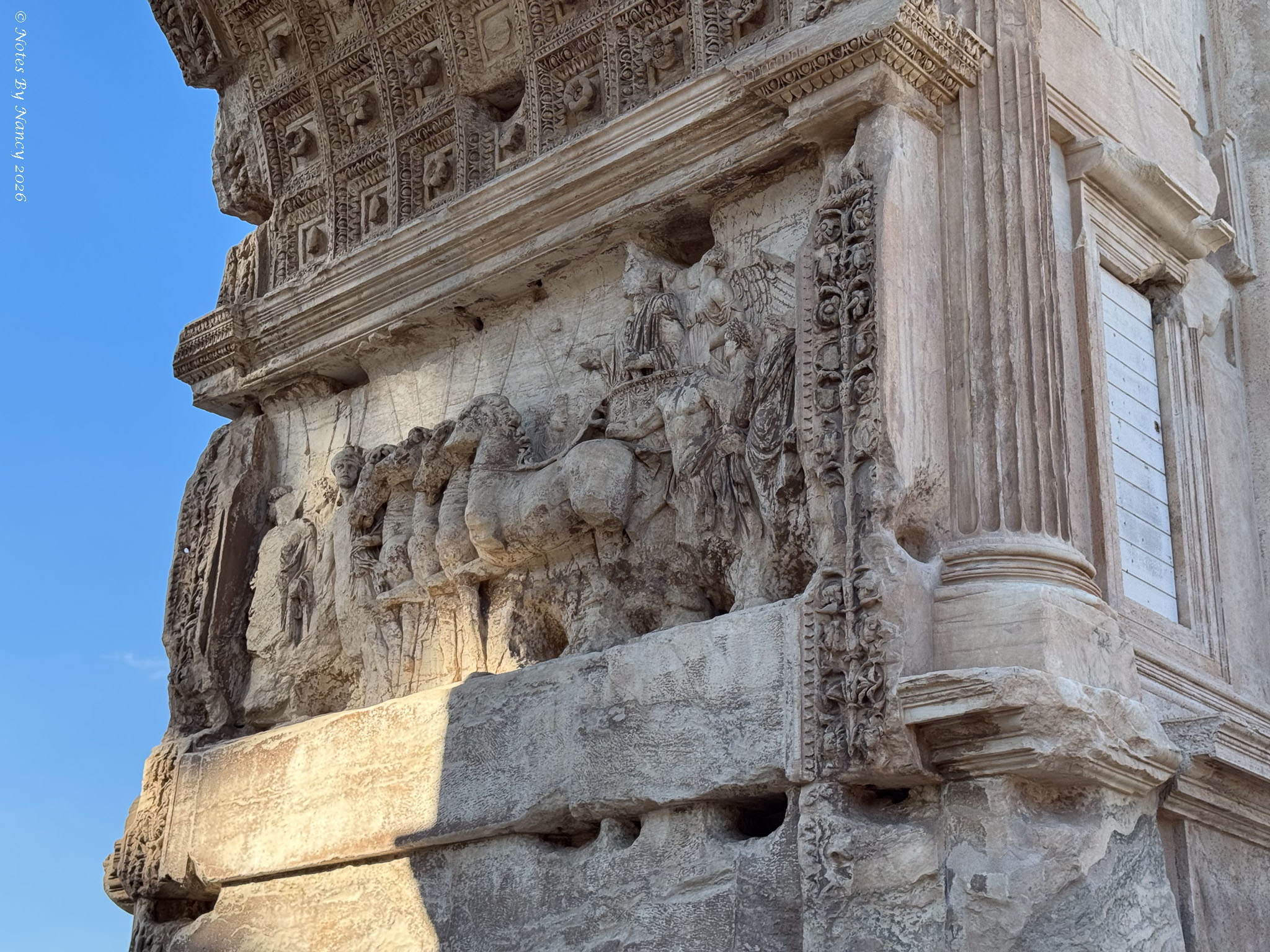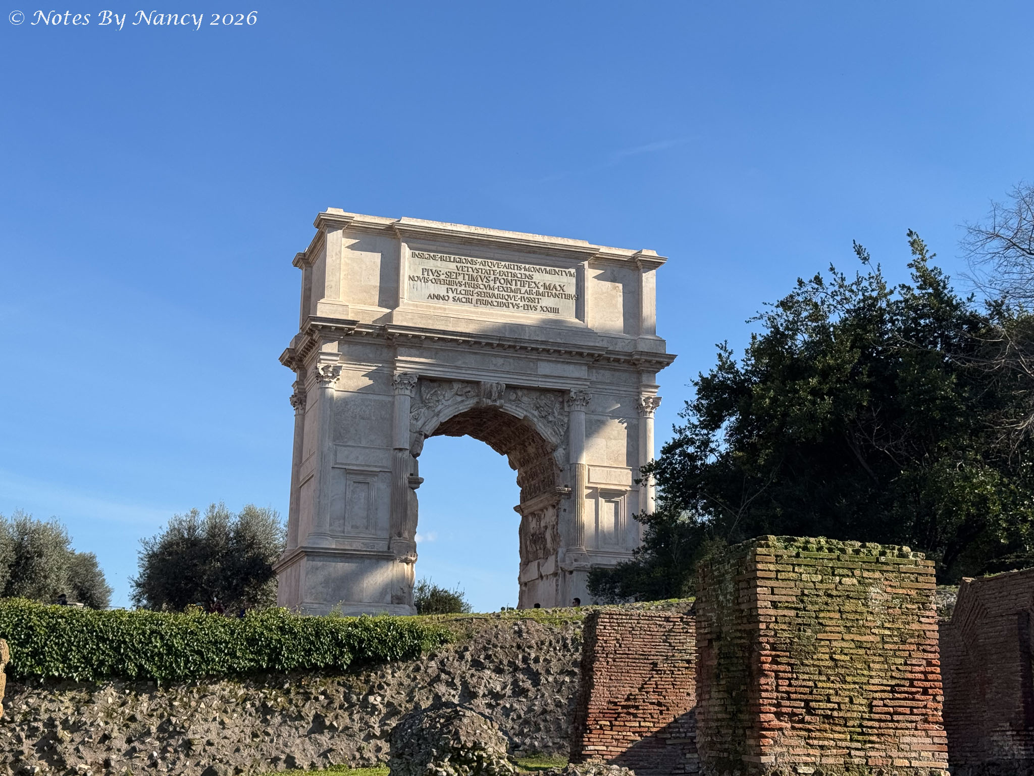 Roman Forum West End – Arch of Septimius Severus – the 75-foot arch dedicated in 203 AD commemorates the Parthian victories of Emperor Septimius Severus and his sons a decade earlier. The Parthian Empire was located in ancient Iran.