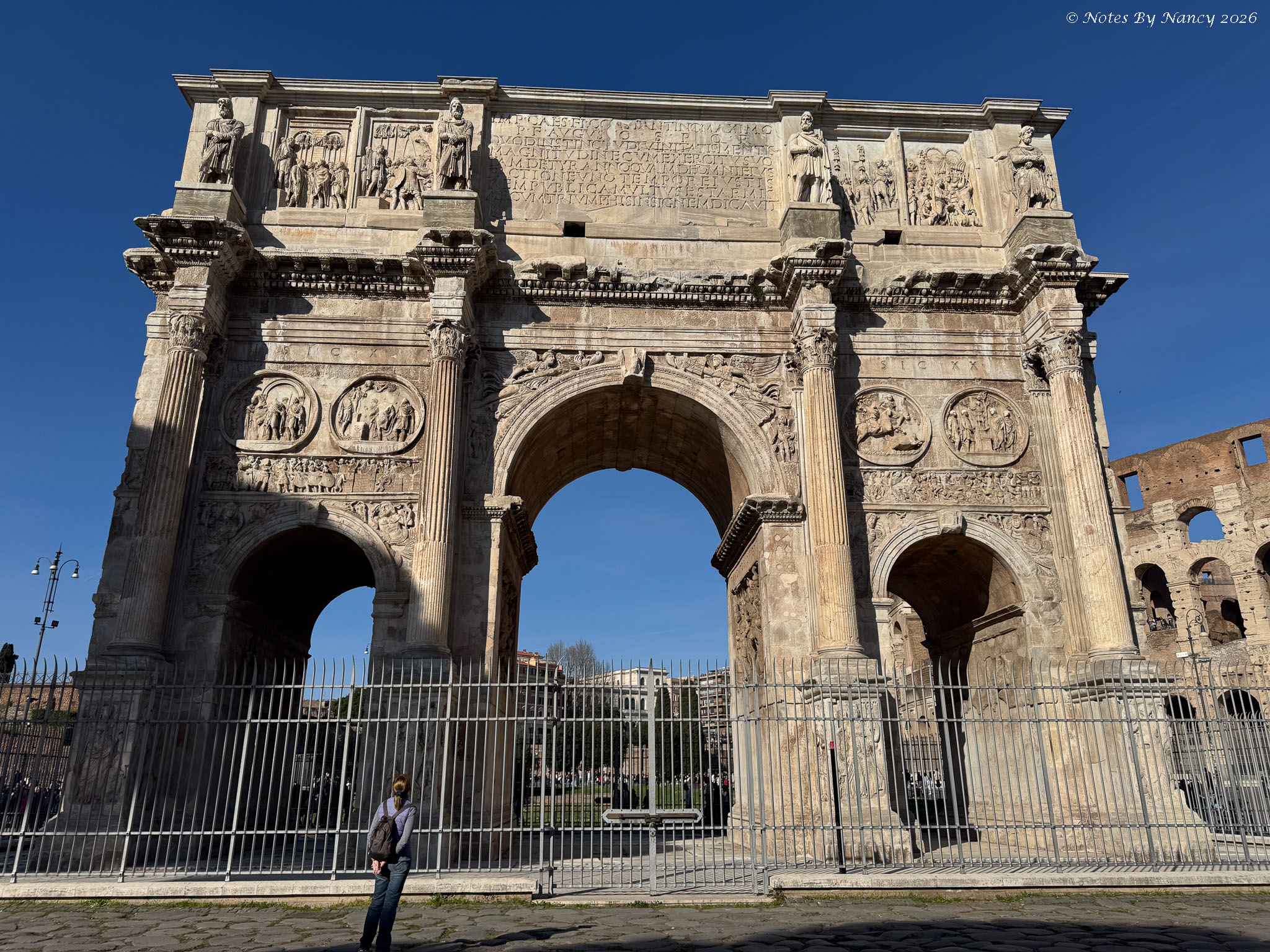 As we walked through the streets of the Forum, we finally saw the iconic building which so identified with the Roman Empire – The Colosseum. Before entering for our tour, we took pictures of it as well as the Arch of Constantine. This is the largest of the Roman arches at 69 feet high, 85 feet wide, and 24 feet deep. Dedicated in 315 AD following Constantine’s defeat of Maxentius in 312, it spans the Via Triumphalis used as the path for victorious military leaders to enter the city.