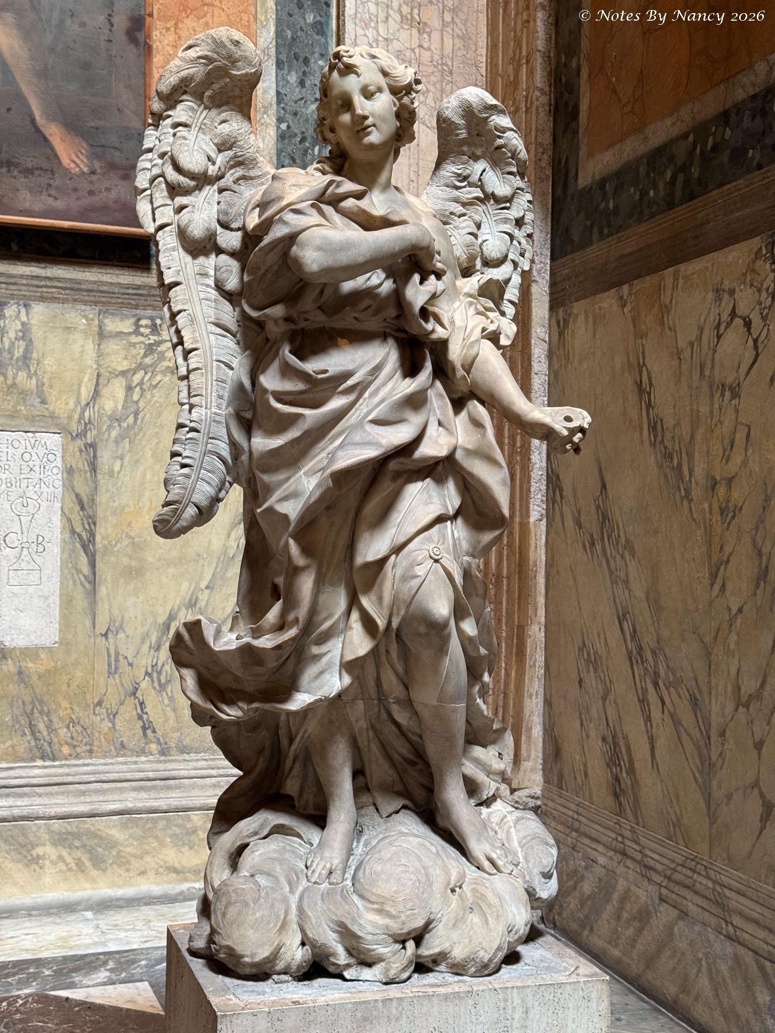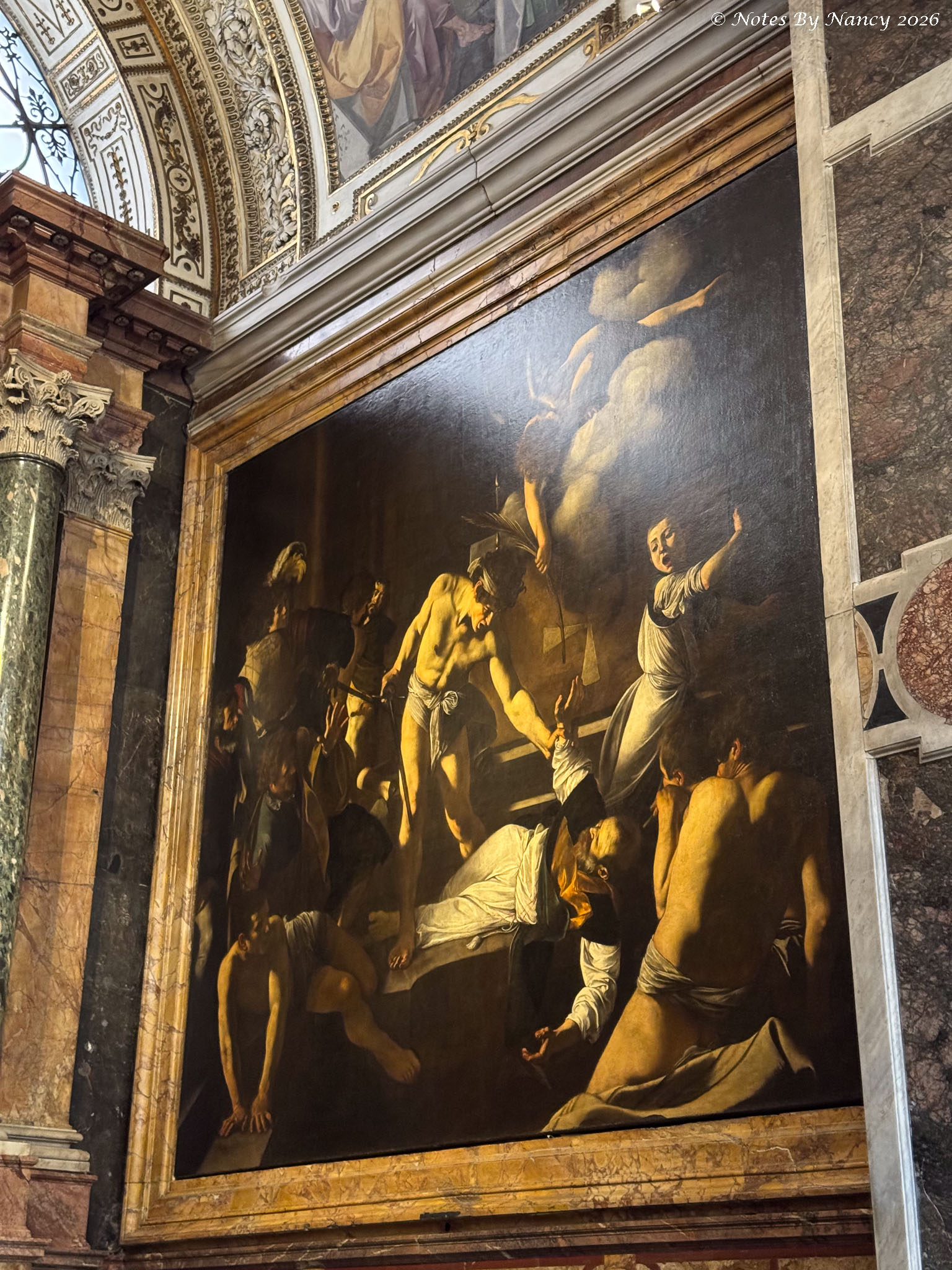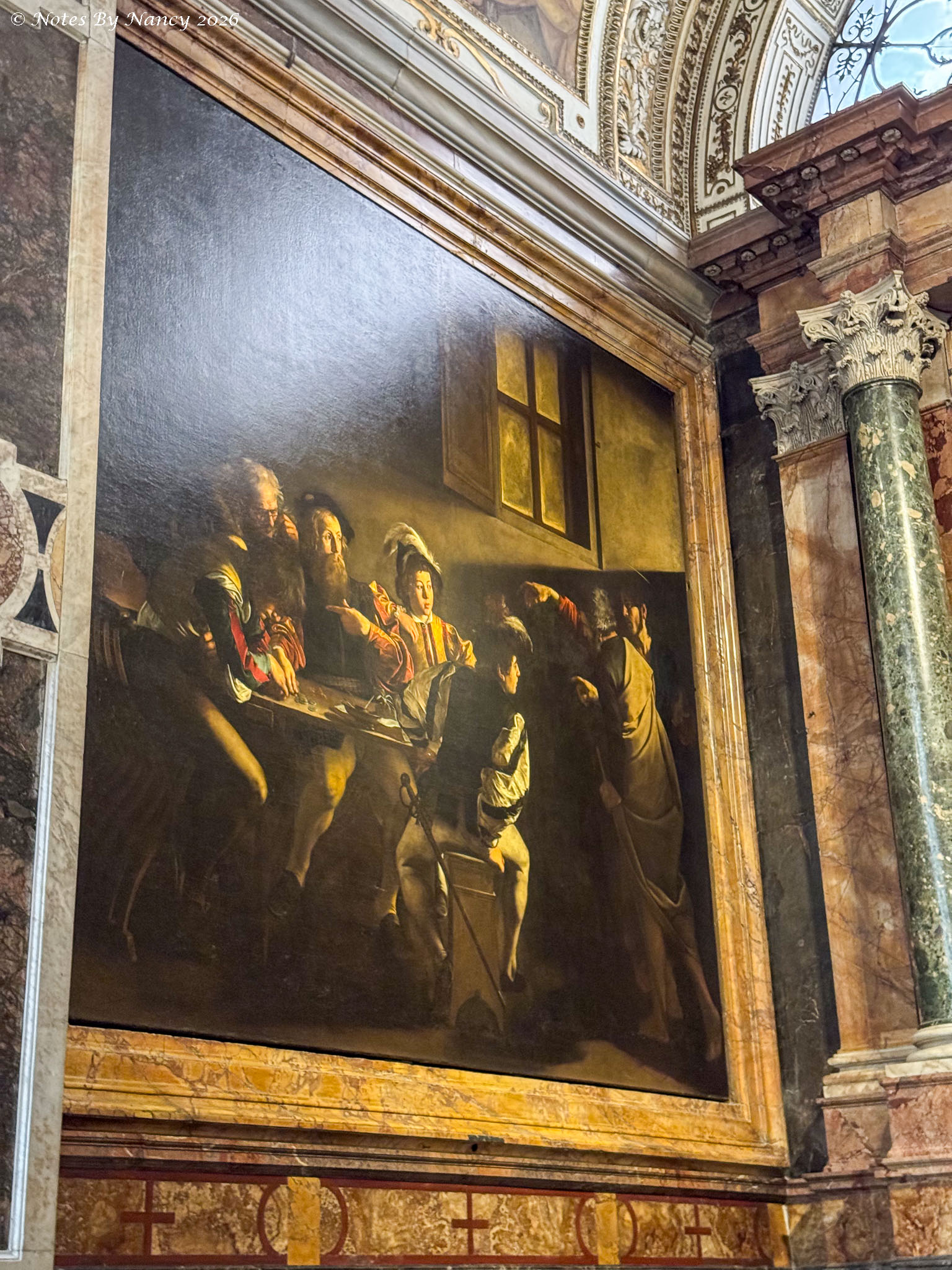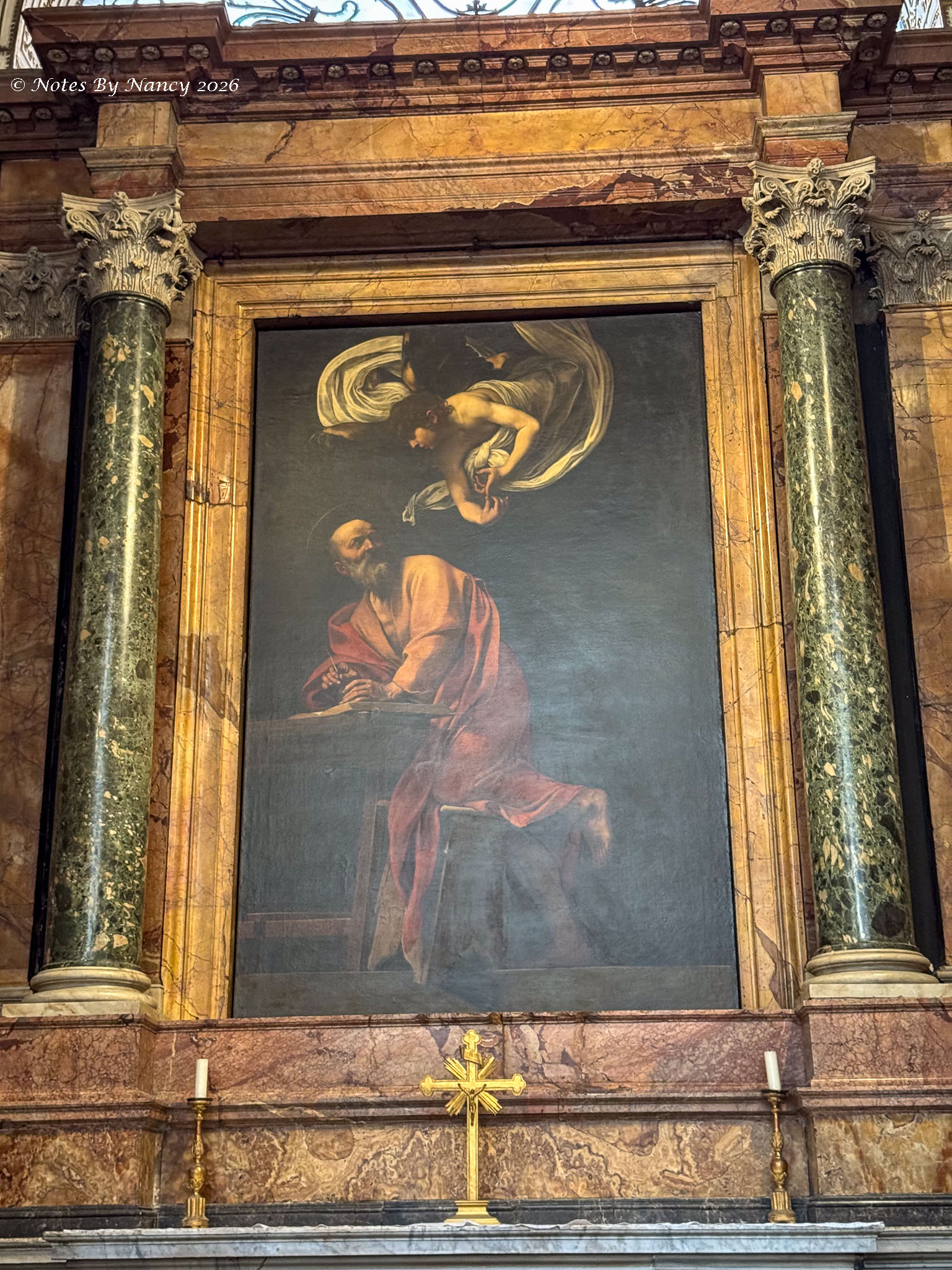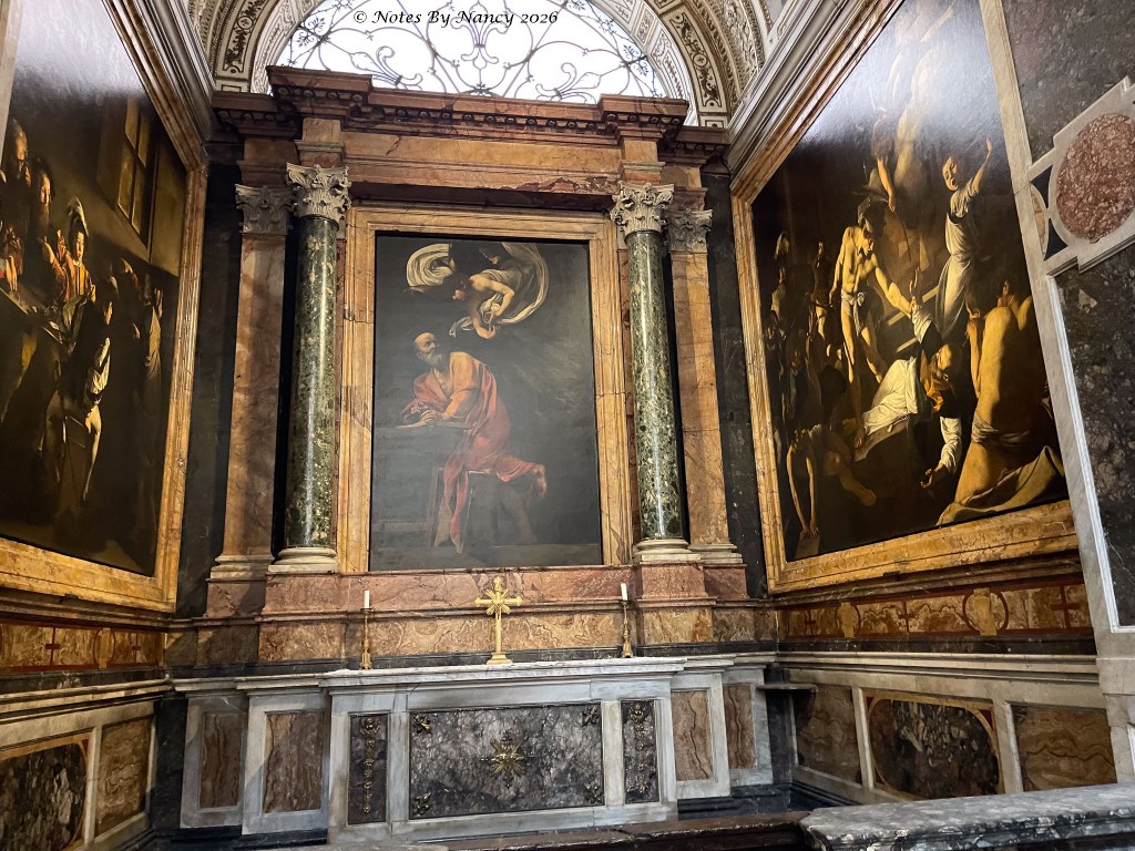 This is where our wonderful guide left us for further exploration on our own and lunch. I quickly made Dave retrace our steps a couple of blocks to the Church of Saint Louis of the French (Chiesa di San Luigi dei Francesi). It is known for its Caravaggio (1571-1610) paintings of the apostle Matthew, which one of the people in our group visited during the free day on Sunday and highly recommended. Since I had missed seeing any of his works at the Uffizi Gallery in Florence (Note 120), I didn’t want to pass up this opportunity.