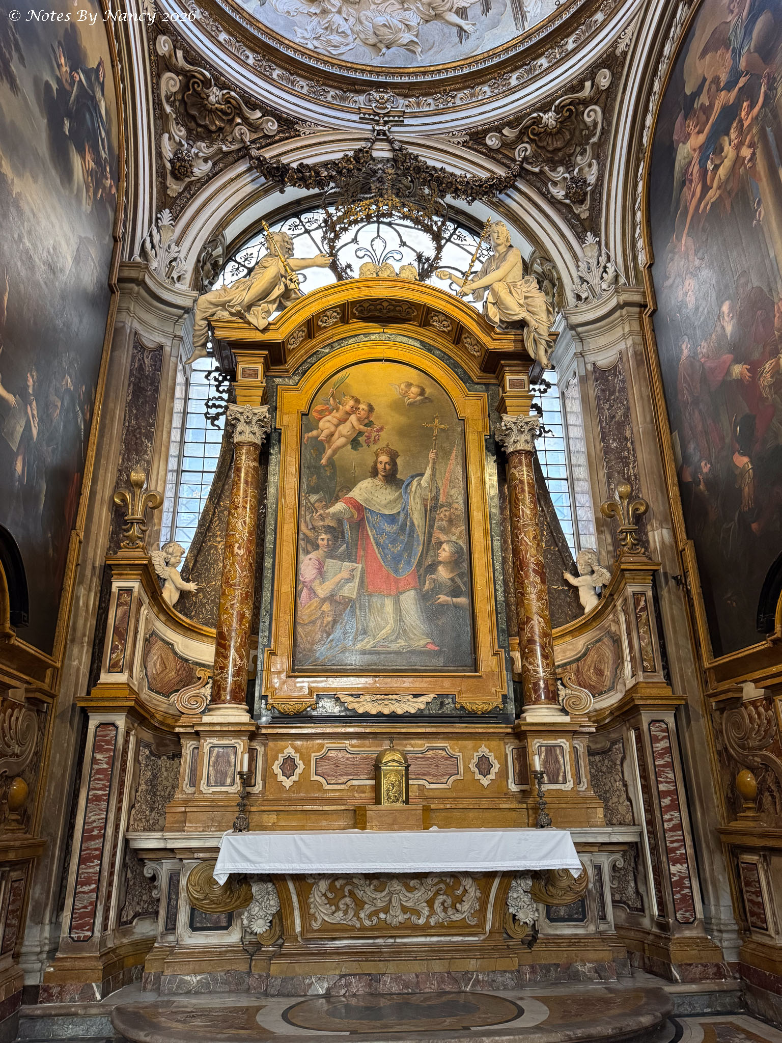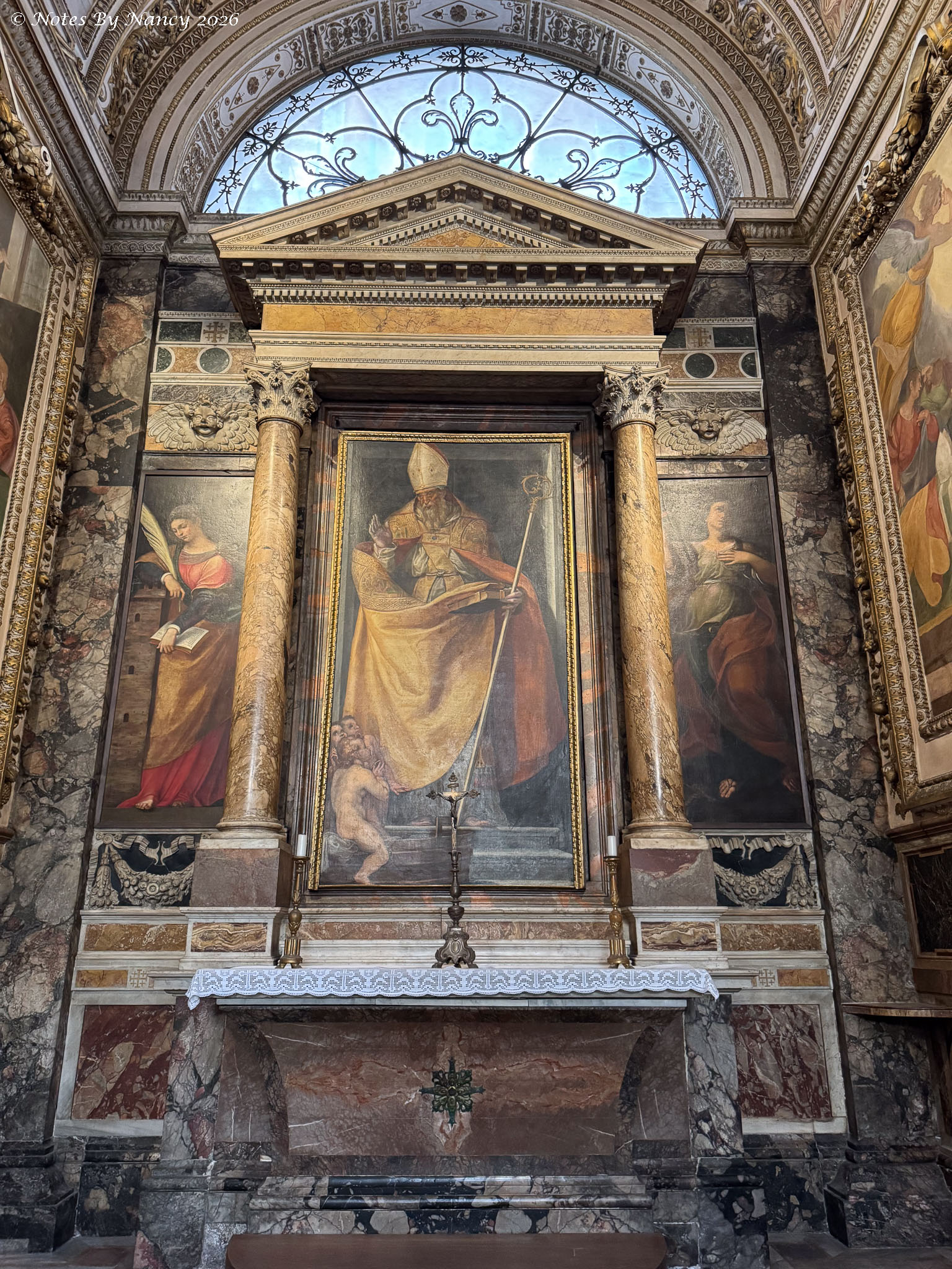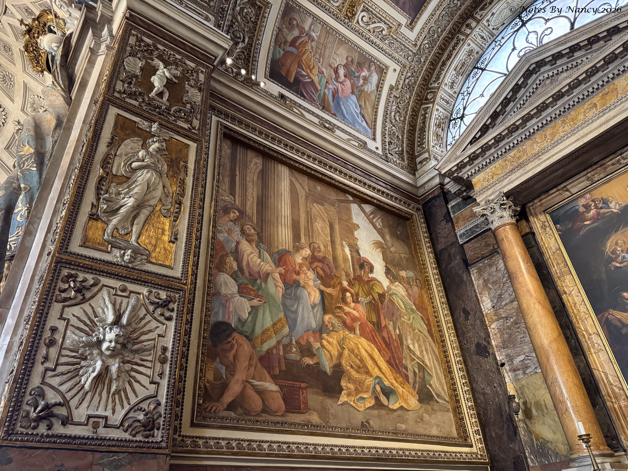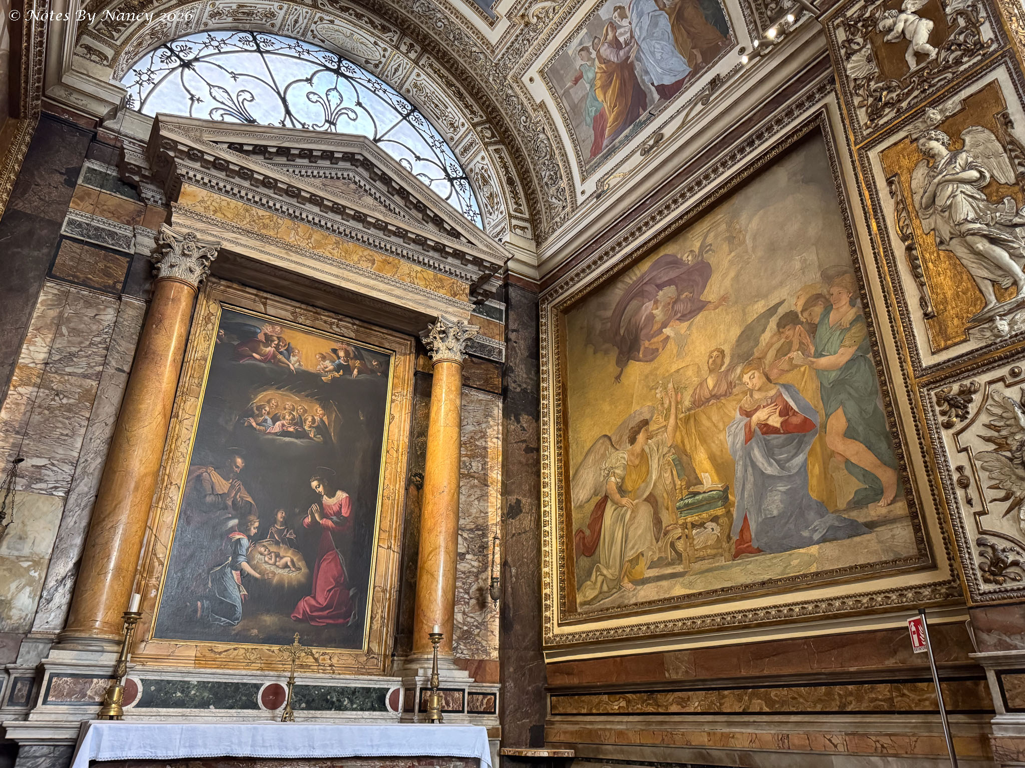 This is where our wonderful guide left us for further exploration on our own and lunch. I quickly made Dave retrace our steps a couple of blocks to the Church of Saint Louis of the French (Chiesa di San Luigi dei Francesi). It is known for its Caravaggio (1571-1610) paintings of the apostle Matthew, which one of the people in our group visited during the free day on Sunday and highly recommended. Since I had missed seeing any of his works at the Uffizi Gallery in Florence (Note 120), I didn’t want to pass up this opportunity.