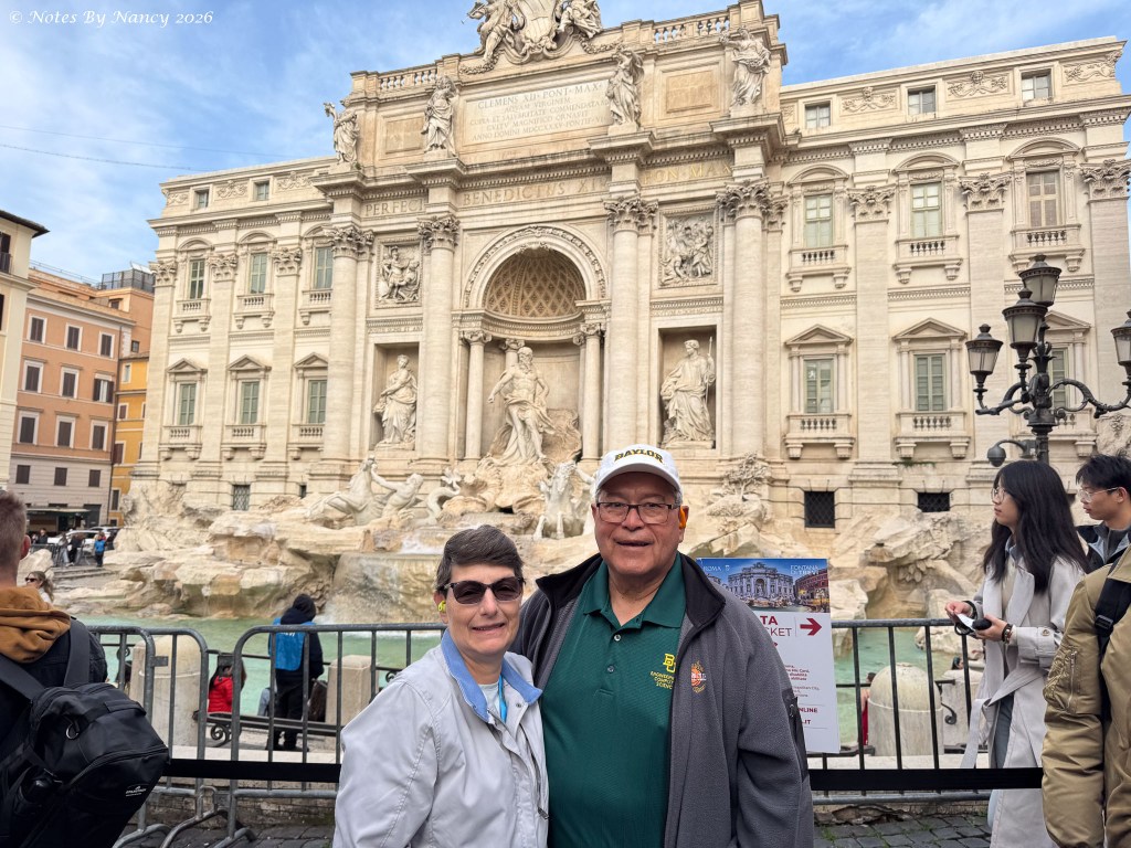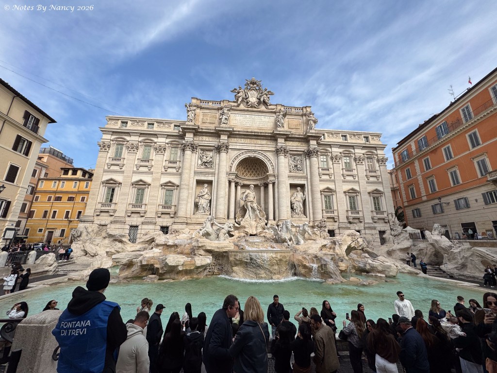 To control the crowds desiring to throw coins into the fountain to ensure their return to Rome, effective early February 2026 you now must pay 2 Euros to enter the barricaded area in front of the fountain. It is estimated that the equivalent of over $1.6 million USD per year is thrown into the fountain. The proceeds are donated to the Catholic charity, Caritas.