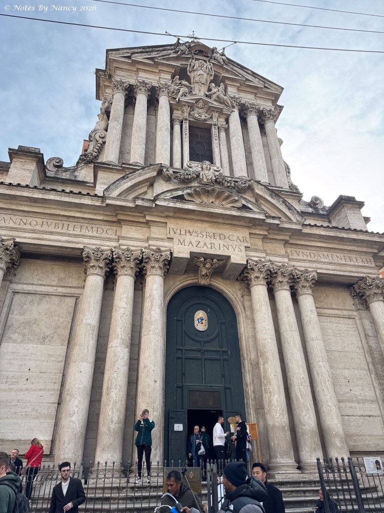 As we waited for everyone to rejoin the group, we learned that while it was the site of an earlier medieval church, this Baroque church on the corner, Church of Saints Vincent and Anastasius, contains the embalmed hearts of 22 popes – Sixtus V (died 1590) through Leo XIII (died 1903)!